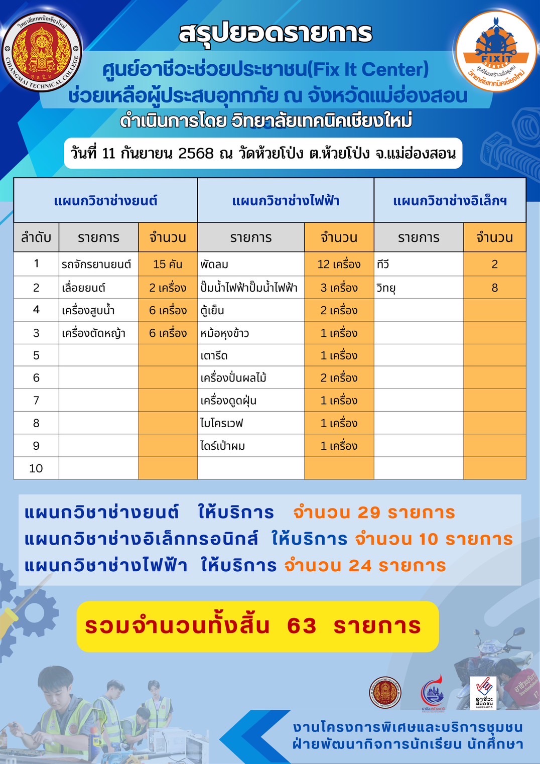 ทั้งนี้วิทยาลัยเทคนิคเชียงใหม่ได้จัดตั้งศูนย์อาชีวะช่วยประชาชน (Fix It Center) เพื่อช่วยเหลือผู้ประสบอุทกภัย โดยมีคณะครู และนักเรียน นักศึกษา แผนกวิชาช่างยนต์ แผนกวิชาช่างไฟฟ้า และแผนกวิชาช่างอิเล็กทรอนิกส์ จากวิทยาลัยเทคนิคเชียงใหม่ ออกให้บริการซ่อมเครื่องใช้ไฟฟ้า ยานพาหนะ อุปกรณ์ทางการเกษตร และอุปกรณ์อิเล็กทรอนิกส์ ของประชาชนในเขตพื้นที่จังหวัดแม่ฮ่องสอน ที่ได้รับความเสียหายจากเหตุการณ์อุทกภัยน้ำท่วม