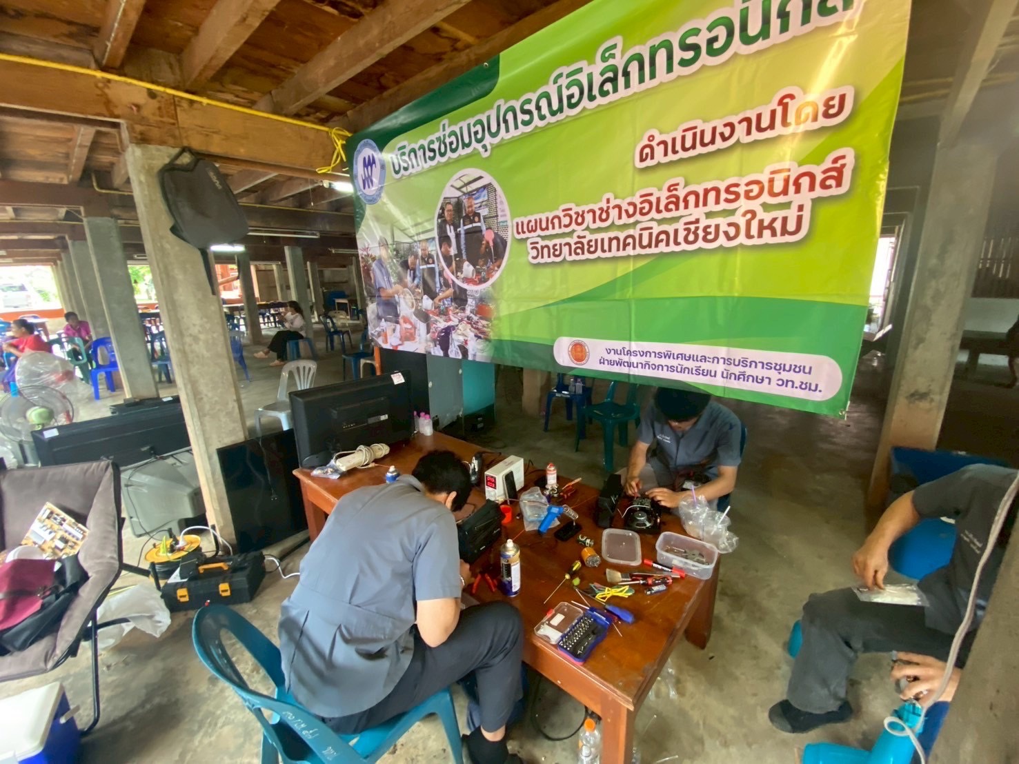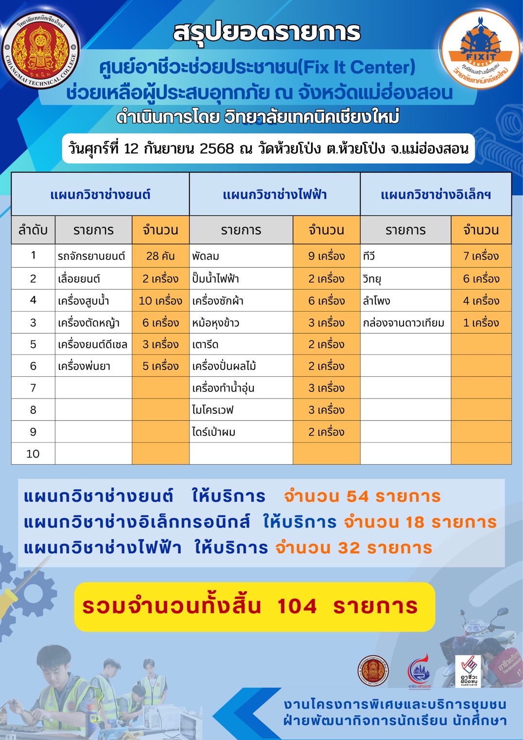 ดร.วัชรพงศ์ ฝั้นติ๊บ ผู้อำนวยการวิทยาลัยเทคนิคเชียงใหม่ ปฏิบัติหน้าที่ผู้อำนวยการสำนักงานอาชีวศึกษาจังหวัดเชียงใหม่ และรักษาการในตำแหน่งที่ปรึกษาด้านนโยบายและแผน สำนักงานคณะกรรมการการอาชีวศึกษา มอบหมาย นายธกฤต ยอดสอน หัวหน้างานโครงการพิเศษและการบริการชุมชน คณะครู และนักเรียน นักศึกษา แผนกวิชาช่างยนต์ แผนกวิชาช่างไฟฟ้า และแผนกวิชาช่างอิเล็กทรอนิกส์ จัดตั้งศูนย์อาชีวะช่วยประชาชน (Fix It Center) เพื่อช่วยเหลือผู้ประสบอุทกภัย ณ วัดห้วยโป่ง ตำบลห้วยโป่ง อำเภอเมือง จังหวัดแม่ฮ่องสอน ซึ่งดำเนินงานโดยคณะผู้บริหาร คณะครู คณะดำเนินงานโครงการพิเศษและการบริการชุมชน และนักเรียน นักศึกษา วิทยาลัยเทคนิคเชียงใหม่