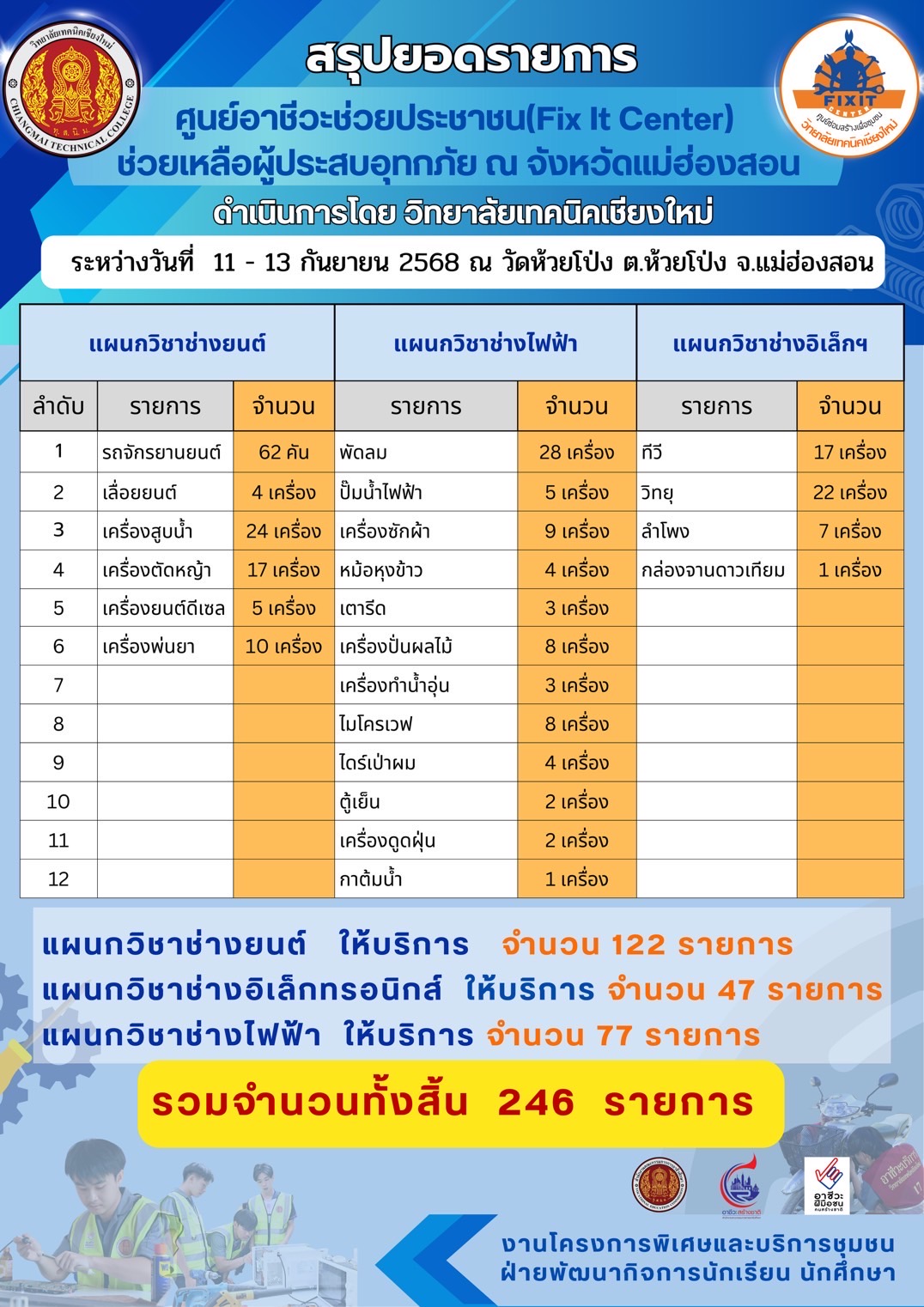 ทั้งนี้วิทยาลัยเทคนิคเชียงใหม่ได้จัดตั้งศูนย์อาชีวะช่วยประชาชน (Fix It Center) เพื่อช่วยเหลือผู้ประสบอุทกภัย โดยมีคณะครู และนักเรียน นักศึกษา แผนกวิชาช่างยนต์ แผนกวิชาช่างไฟฟ้า และแผนกวิชาช่างอิเล็กทรอนิกส์ จากวิทยาลัยเทคนิคเชียงใหม่ ออกให้บริการซ่อมเครื่องใช้ไฟฟ้า ยานพาหนะ อุปกรณ์ทางการเกษตร และอุปกรณ์อิเล็กทรอนิกส์ ของประชาชนในเขตพื้นที่จังหวัดแม่ฮ่องสอน ที่ได้รับความเสียหายจากเหตุการณ์อุทกภัยน้ำท่วม