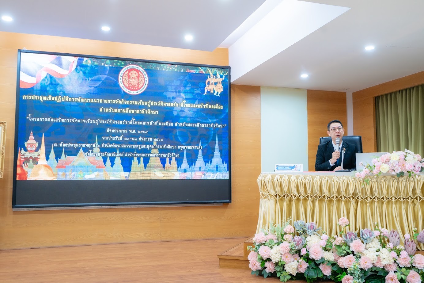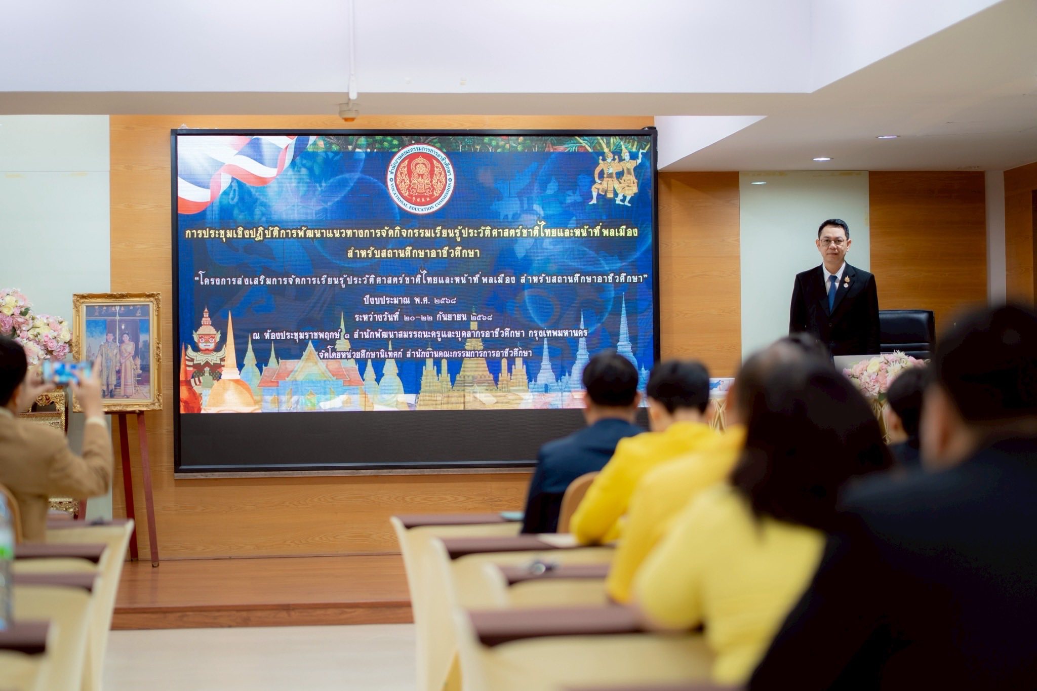 ดร.วัชรพงศ์ ฝั้นติ๊บ ผู้อำนวยการวิทยาลัยเทคนิคเชียงใหม่ ปฏิบัติหน้าที่ผู้อำนวยการสำนักงานอาชีวศึกษาจังหวัดเชียงใหม่ มอบหมายให้ นายวรภาส แซ่เอียบ ครูสังคม แผนกสามัญสัมพันธ์ เข้าร่วมการประชุมเชิงปฏิบัติการพัฒนาแนวทางจัดกิจกรรมเรียนรู้ประวัติศาสตร์ชาติไทยและหน้าที่พลเมือง สำหรับสถานศึกษาอาชีวศึกษา ประจำปีงบประมาณ พ.ศ. 2568 ระหว่างวันที่ 20-22 กันยายน 2568 สำนักพัฒนาสมรรถนะครูและบุคลากรอาชีวศึกษา กรุงเทพมหานคร มีผู้เข้าร่วมการประชุมฯ (ครูสังคมอาชีวะ) คณะวิทยากร และคณะกรรมการดำเนินงาน จำนวน 40 คน ดำเนินการโดยหน่วยศึกษานิเทศก์ สำนักงานคณะกรรมการการอาชีวศึกษา