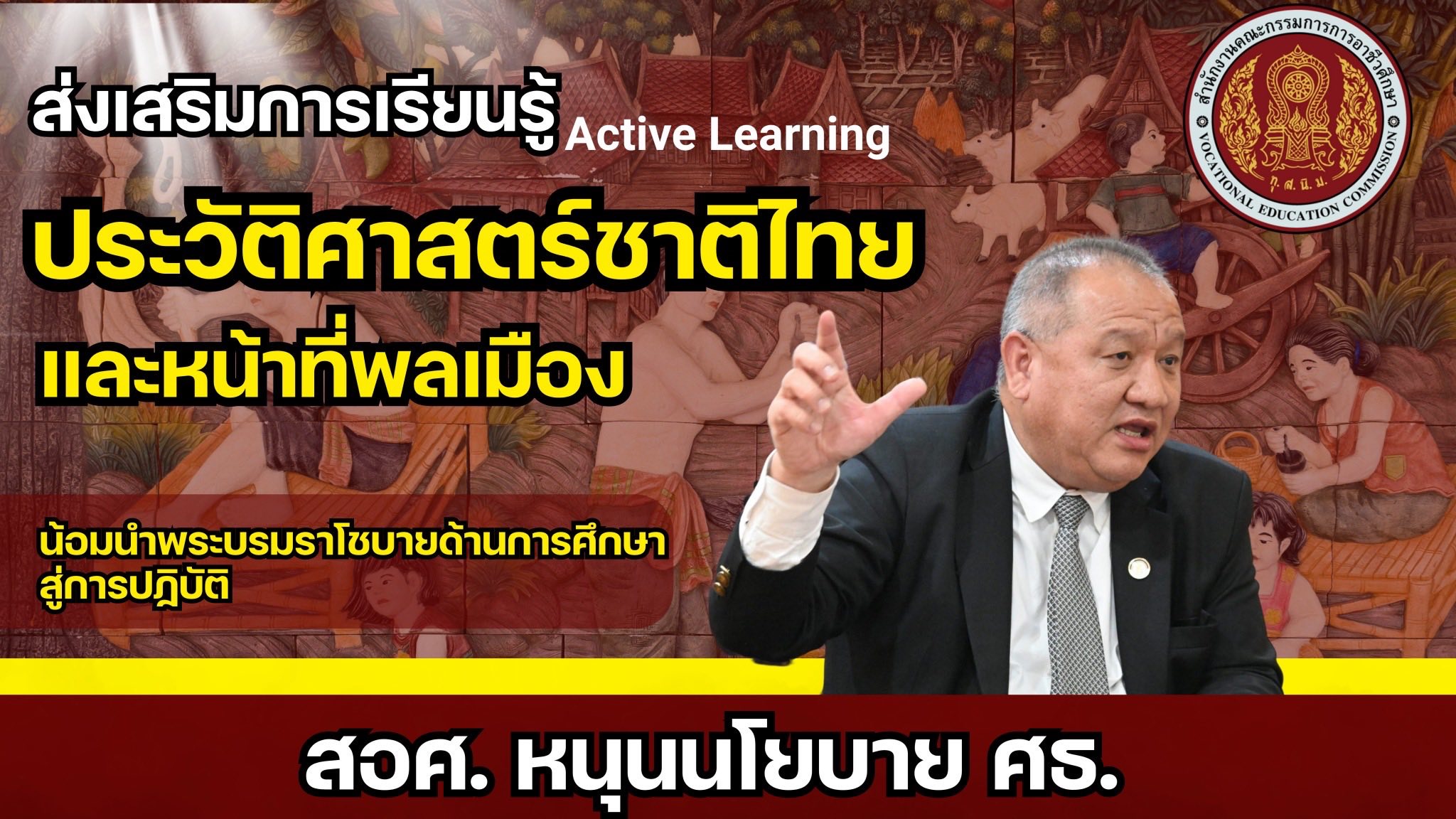 โดยได้รับเกียรติจาก เลขาธิการคณะกรรมการการอาชีวศึกษา (นายยศพล เวณุโกเศศ) ได้มอบหมายให้ ดร.สุรพงษ์ เอิมอุทัย ผู้ช่วยเลขาธิการคณะกรรมการการอาชีวศึกษาเป็นประธานเปิดโครงการ ซึ่งโครงการมีวัตถุประสงค์ เพื่อส่งเสริมและพัฒนาแนวทางการจัดกิจกรรมการเรียนรู้ประวัติศาสตร์ชาติไทยและหน้าที่พลเมือง สำหรับสถานศึกษาอาชีวศึกษา เพื่อให้ผู้เรียนภาคภูมิใจความเป็นมาของชาติไทย และตระหนักถึงความสำคัญของประวัติศาสตร์ชาติไทยและการเป็นพลเมืองที่ดีและเพื่อให้ผู้สอนมีความเข้าใจในการจัดกิจกรรมเรียนรู้ประวัติศาสตร์ชาติไทยและหน้าที่พลเมืองอย่างมีประสิทธิภาพ