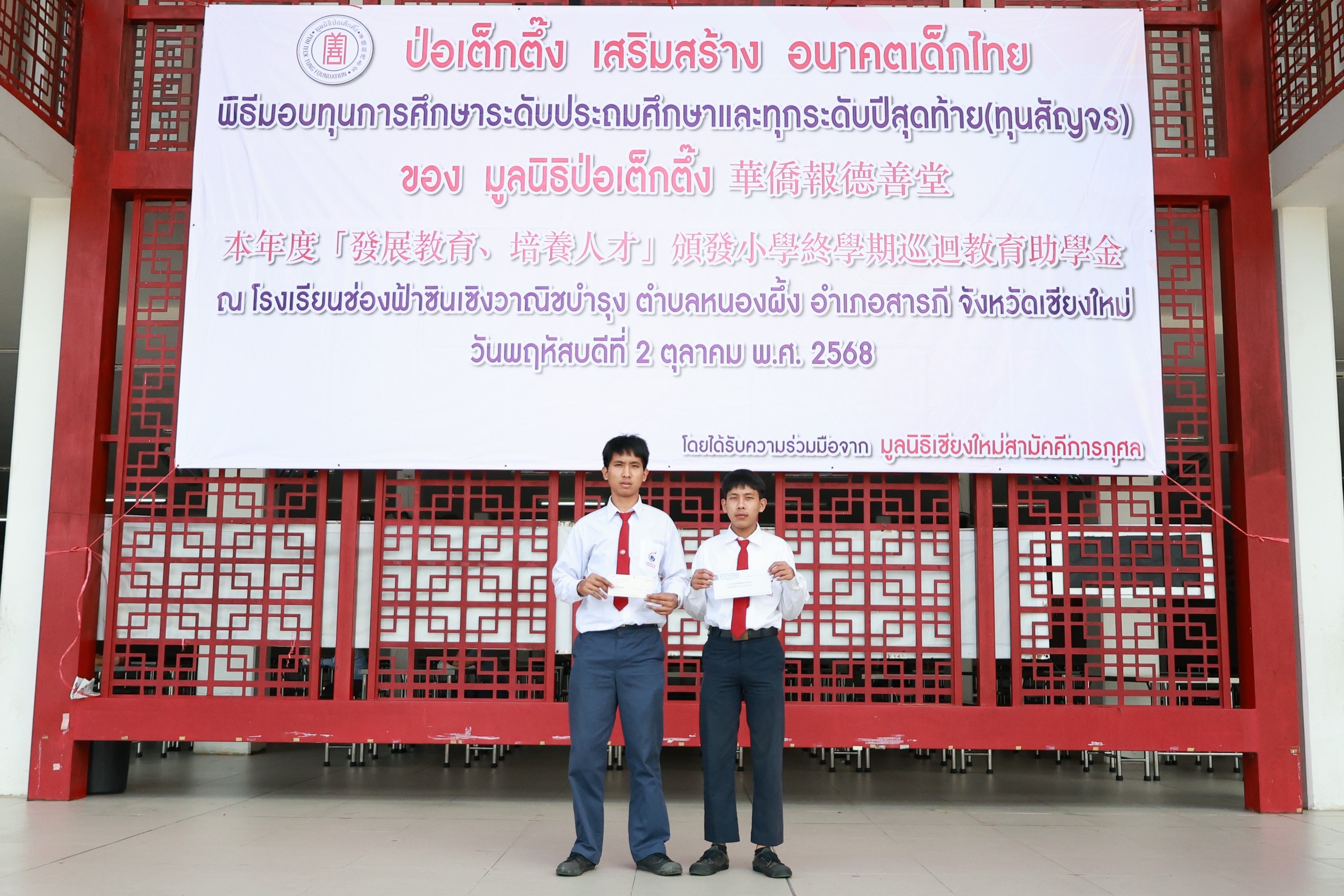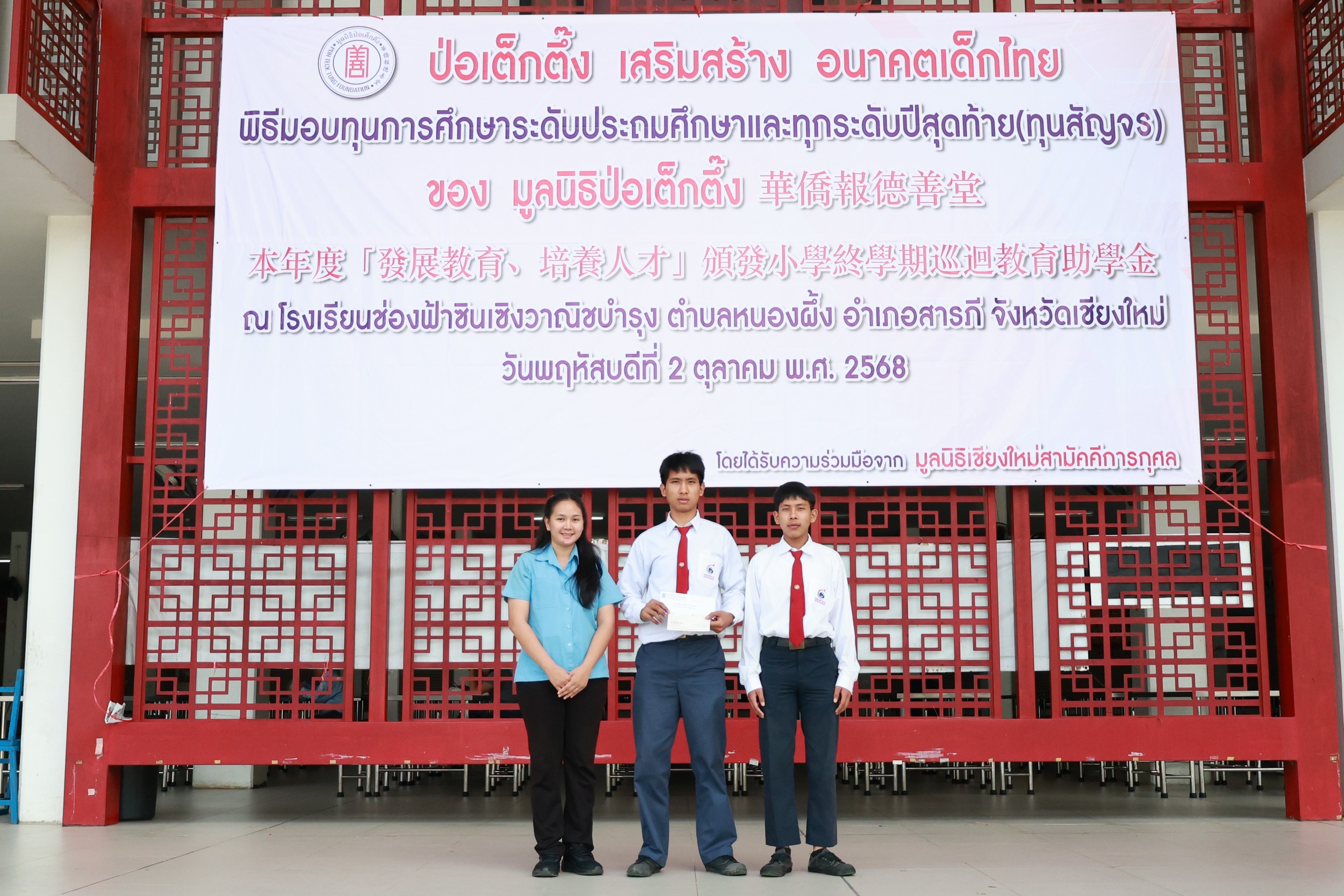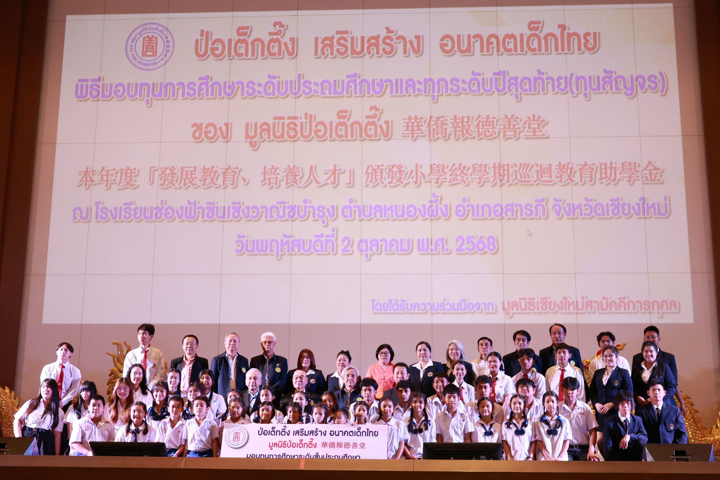 โดยมีนายวีรพงศ์ ฤทธิ์รอด รองผู้ว่าราชการจังหวัดเชียงใหม่ เป็นประธานในพิธีฯพร้อมมอบทุนร่วมกับมูลนิธิป่อเต็กตึ๊ง การมอบทุนฯในครั้งนี้จัดขึ้นเพื่อมอบให้นักเรียน นักศึกษาที่ประพฤติดีแต่ขาดแคลนทุนทรัพย์ในระดับชั้นมัธยมศึกษา อาชีวศึกษา และอุดมศึกษา ช่วยเหลือและส่งเสริมโอกาสทางการศึกษาแก่เยาวชน ให้มีความมุ่งมั่น ตั้งใจศึกษาเล่าเรียน ตลอดจนสามารถนำความรู้ไปพัฒนาตนเอง ครอบครัว และสังคม