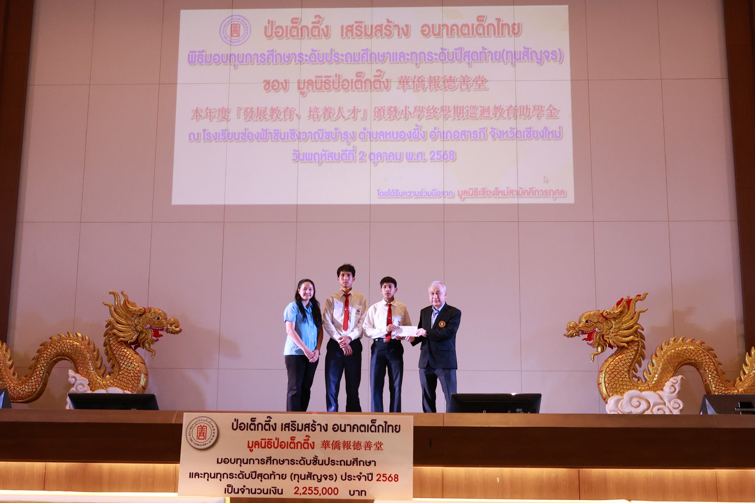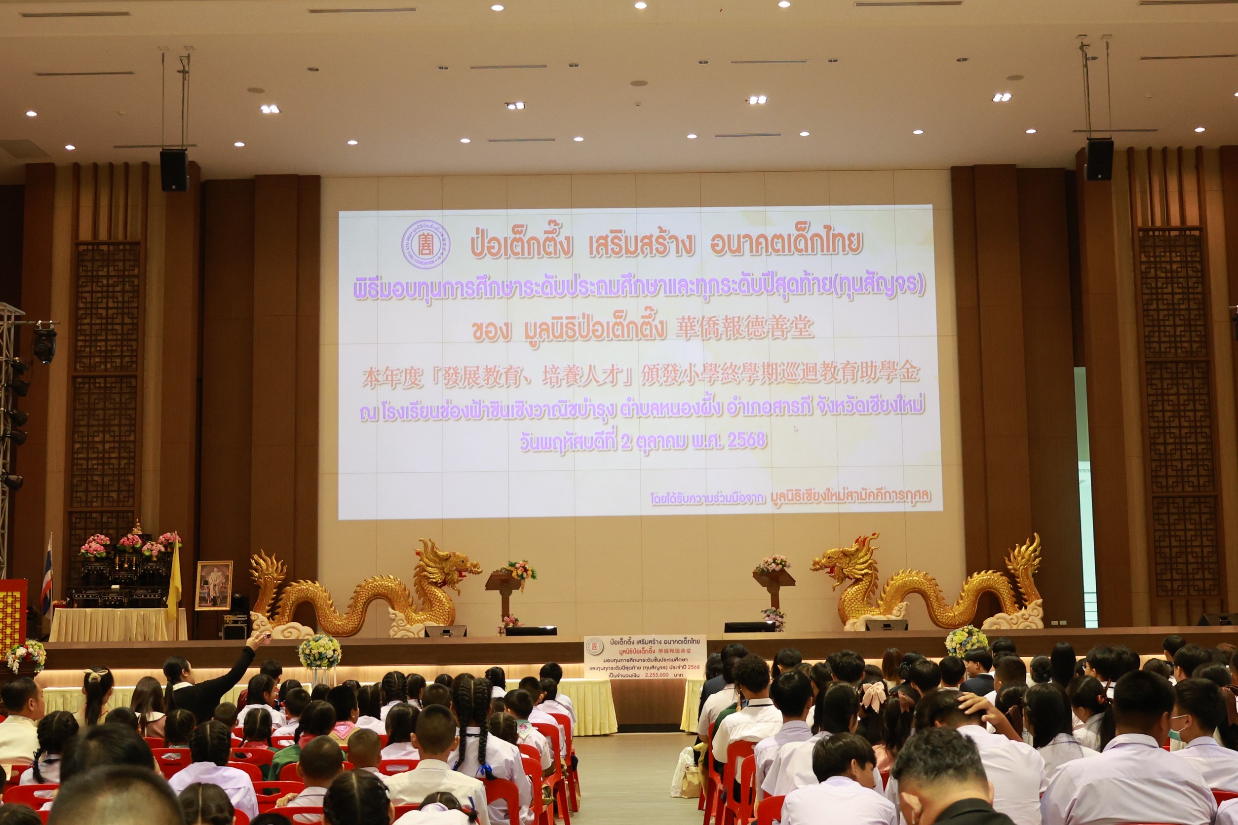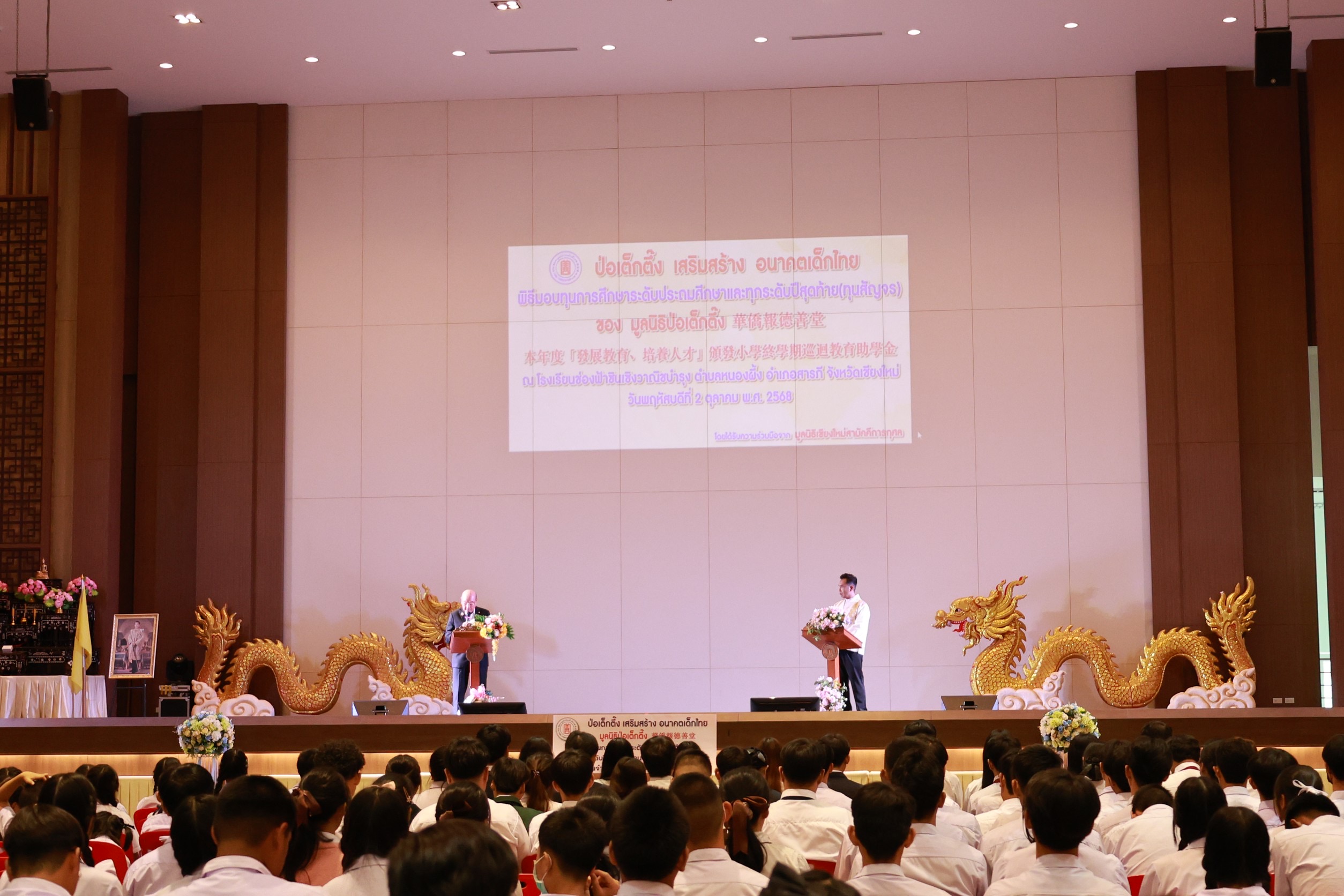 โดยมีนายวีรพงศ์ ฤทธิ์รอด รองผู้ว่าราชการจังหวัดเชียงใหม่ เป็นประธานในพิธีฯพร้อมมอบทุนร่วมกับมูลนิธิป่อเต็กตึ๊ง การมอบทุนฯในครั้งนี้จัดขึ้นเพื่อมอบให้นักเรียน นักศึกษาที่ประพฤติดีแต่ขาดแคลนทุนทรัพย์ในระดับชั้นมัธยมศึกษา อาชีวศึกษา และอุดมศึกษา ช่วยเหลือและส่งเสริมโอกาสทางการศึกษาแก่เยาวชน ให้มีความมุ่งมั่น ตั้งใจศึกษาเล่าเรียน ตลอดจนสามารถนำความรู้ไปพัฒนาตนเอง ครอบครัว และสังคม