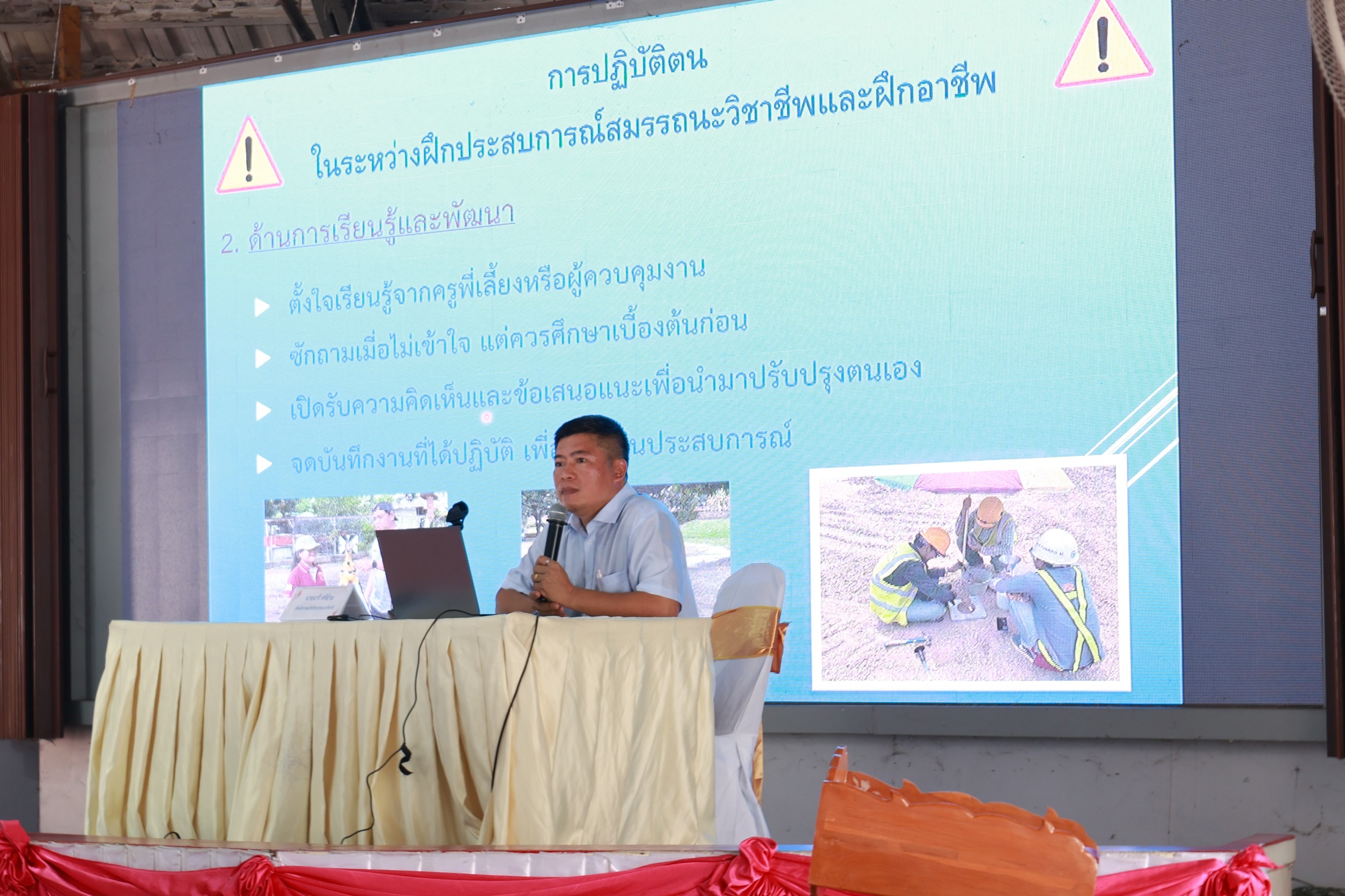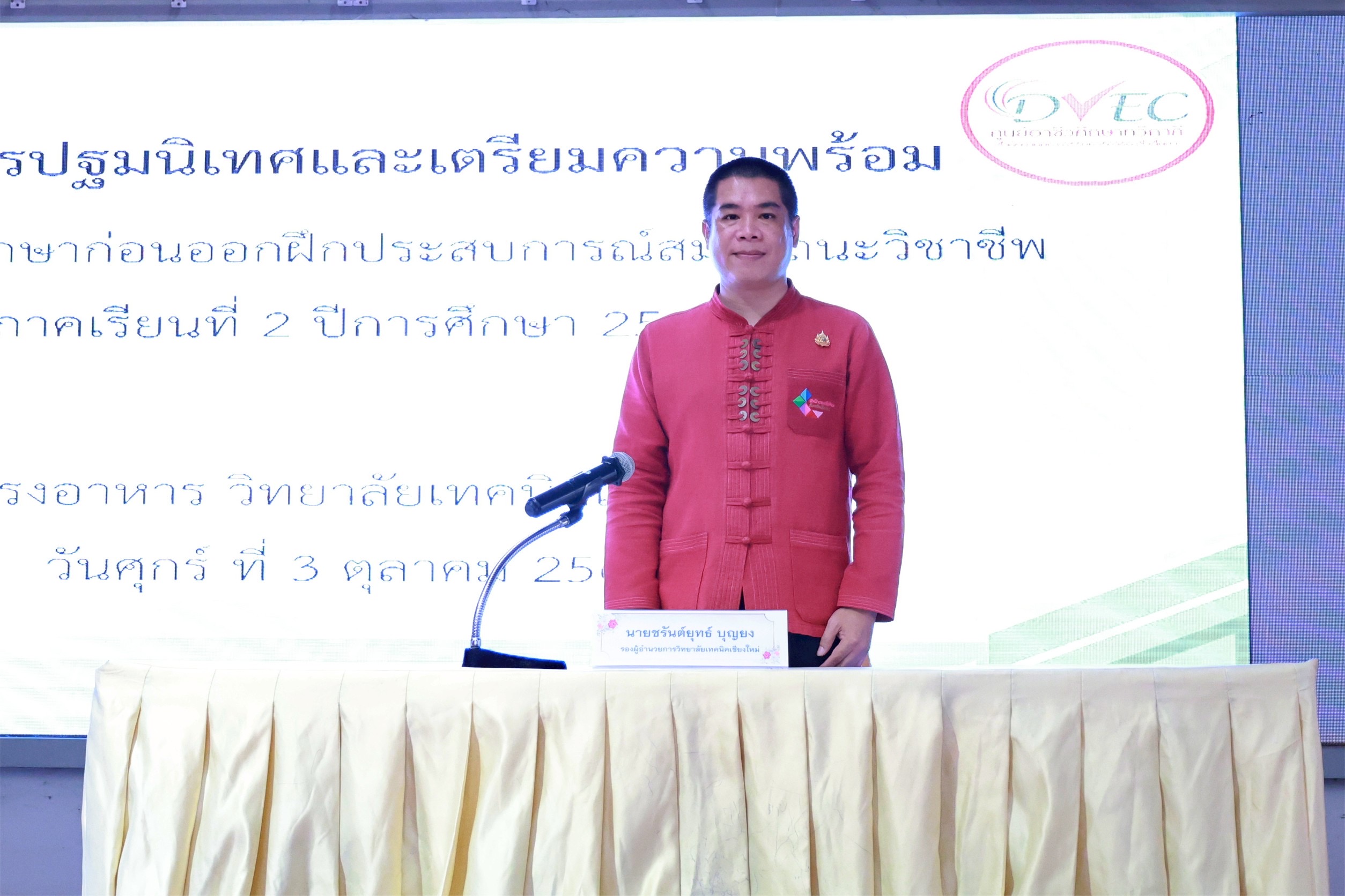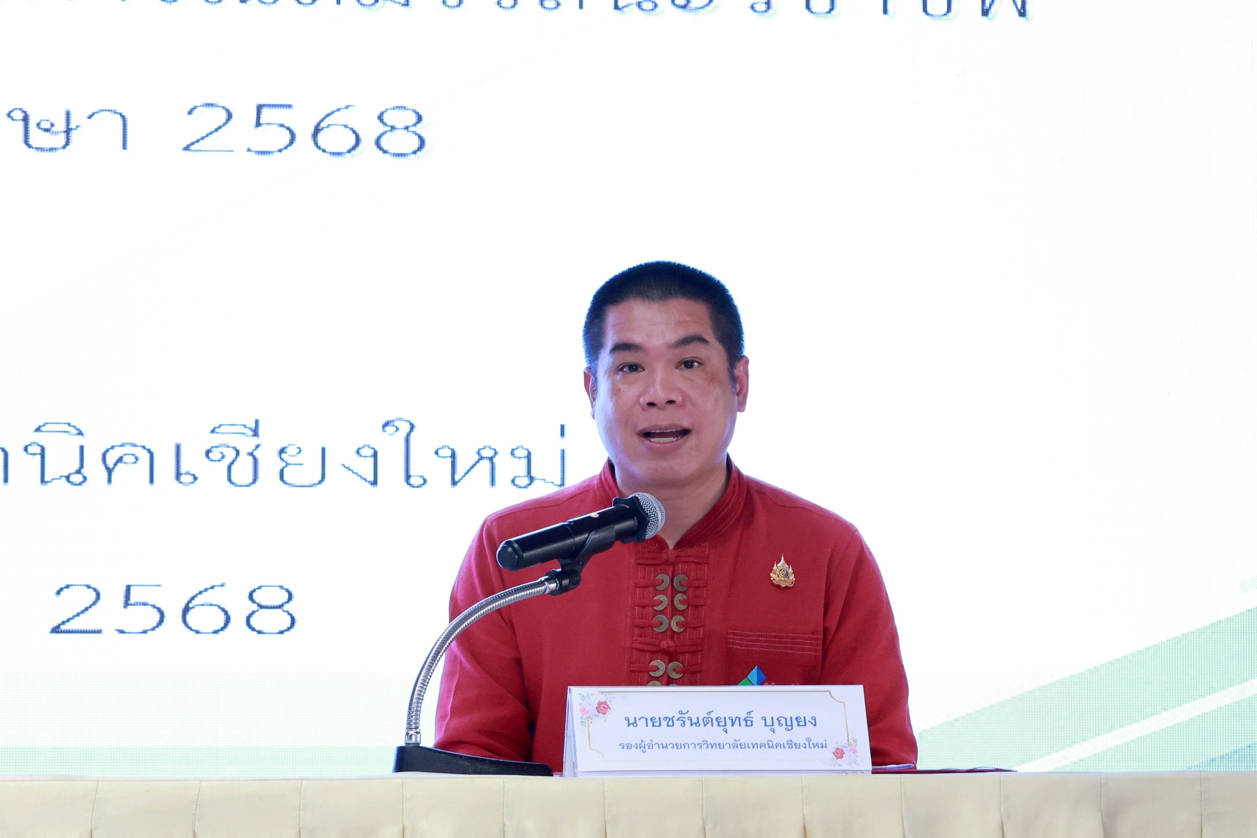 ดร.วัชรพงศ์ ฝั้นติ๊บ ผู้อำนวยการวิทยาลัยเทคนิคเชียงใหม่ ปฏิบัติหน้าที่ผู้อำนวยการสำนักงานอาชีวศึกษาจังหวัดเชียงใหม่ และรักษาการในตำแหน่งที่ปรึกษาด้านนโยบายและแผน สำนักงานคณะกรรมการการอาชีวศึกษา มอบหมายให้ นายชรันต์ยุทธ์ บุญยง รองผู้อำนวยการฝ่ายบริหารทรัพยากร เป็นประธานเปิดโครงการปฐมนิเทศและเตรียมความพร้อม นักเรียน นักศึกษา ก่อนฝึกประสบการณ์สมรรถนะวิชาชีพ ภาคเรียนที่ 2 ปีการศึกษา 2568 โดยมี นายนาวี ศรีอ้าย หัวหน้างานอาชีวศึกษาระบบทวิภาคี ให้การบรรยายและแนะนำเกี่ยวกับการเตรียมตัวก่อนออกฝึกประสบการณ์สมรรถนะวิชาชีพ ซึ่งมีคณะครูที่ปรึกษาแต่ละแผนกวิชาเข้าร่วมฯ