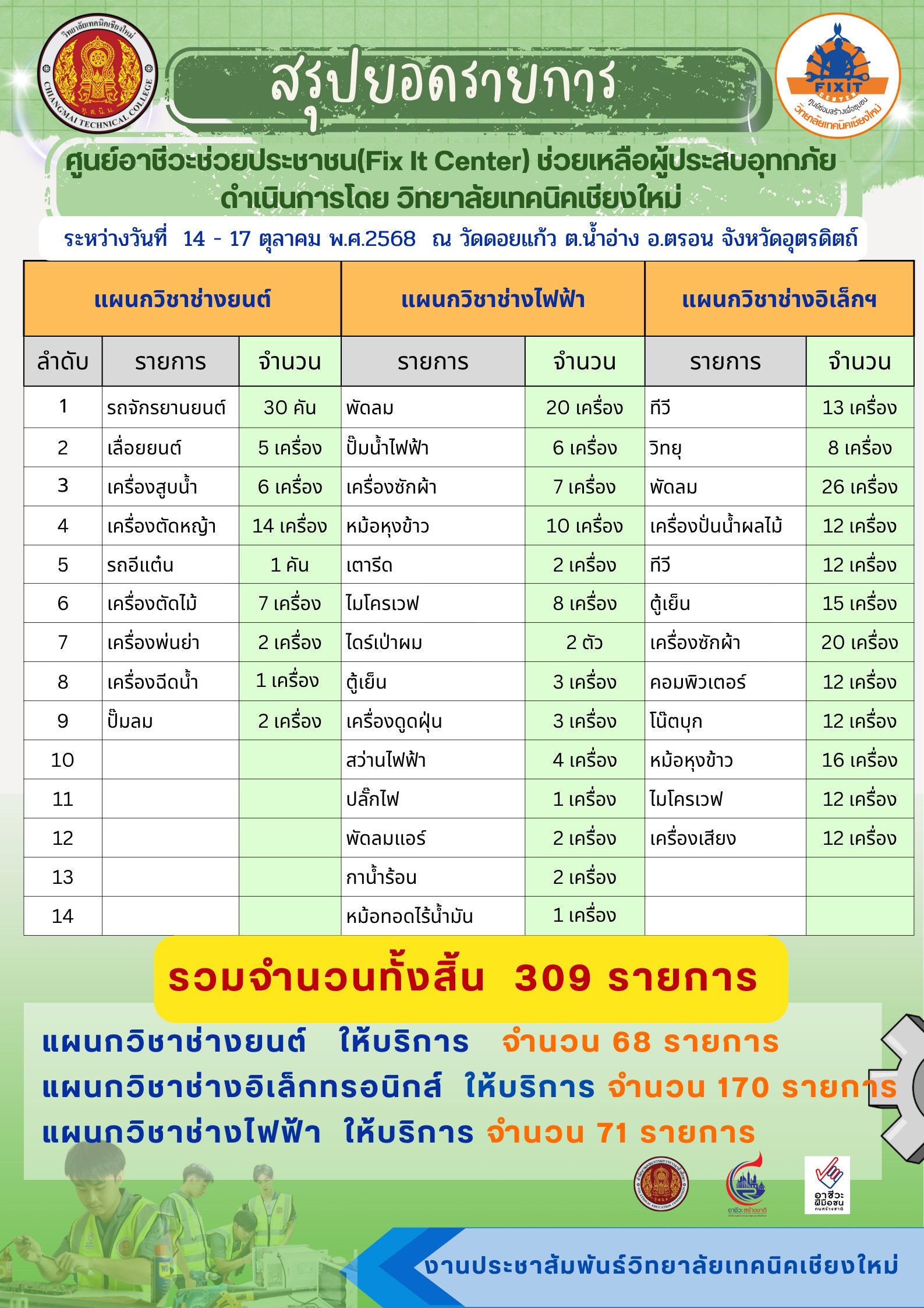 ซึ่งในระหว่างวันที่ 14-17 ตุลาคม พ.ศ. 2568 มีประชาชนนำอุปกรณ์เครื่องใช้ไฟฟ้าและอุปกรณ์การเกษตร เข้ารับบริการรวมทั้งสิ้น 309 รายการ แบ่งเป็น