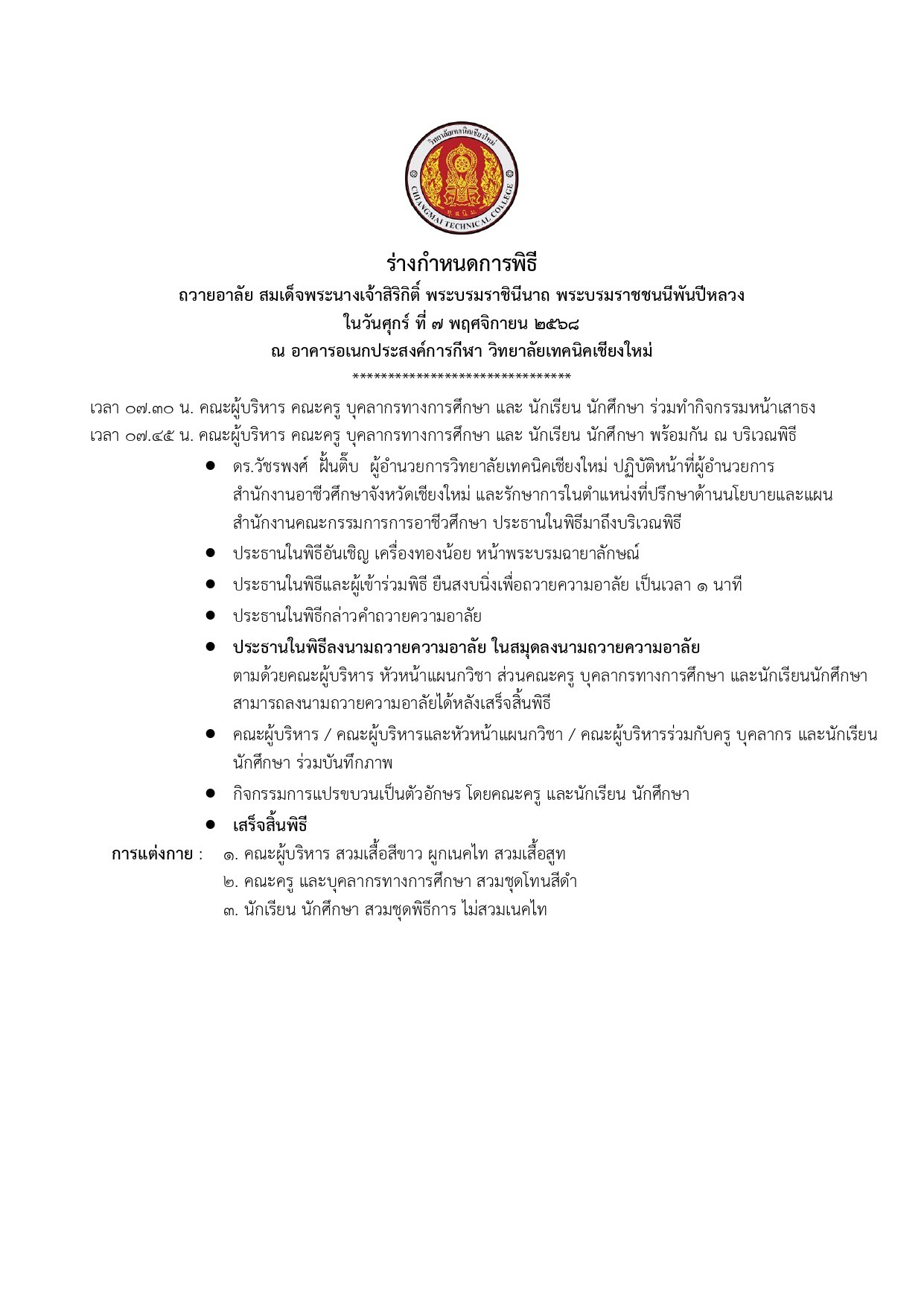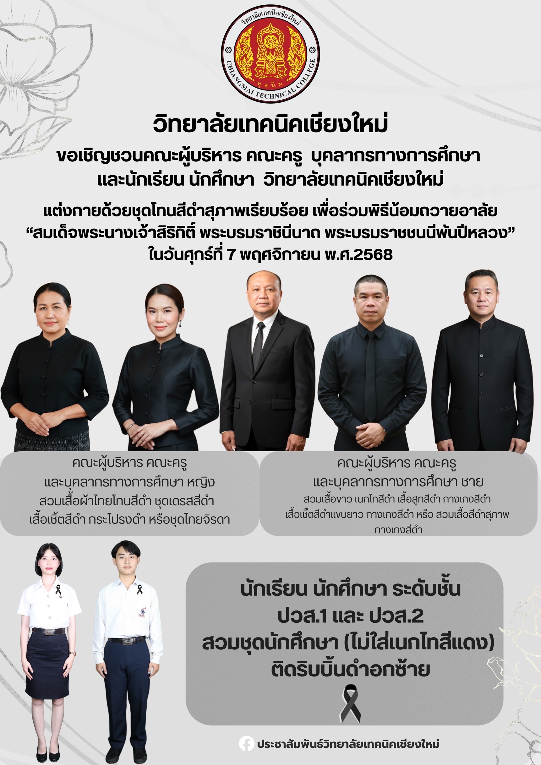วิทยาลัยเทคนิคเชียงใหม่ ขอเชิญชวนคณะผู้บริหาร คณะครู บุคลากรทางการศึกษา และนักเรียน นักศึกษา วิทยาลัยเทคนิคเชียงใหม่ ร่วมพิธีน้อมถวายอาลัย สมเด็จพระนางเจ้าสิริกิติ์ พระบรมราชินีนาถ พระบรมราชชนนีพันปีหลวง ในวัน ศุกร์ที่ 7 พฤศจิกายน พ.ศ. 2568