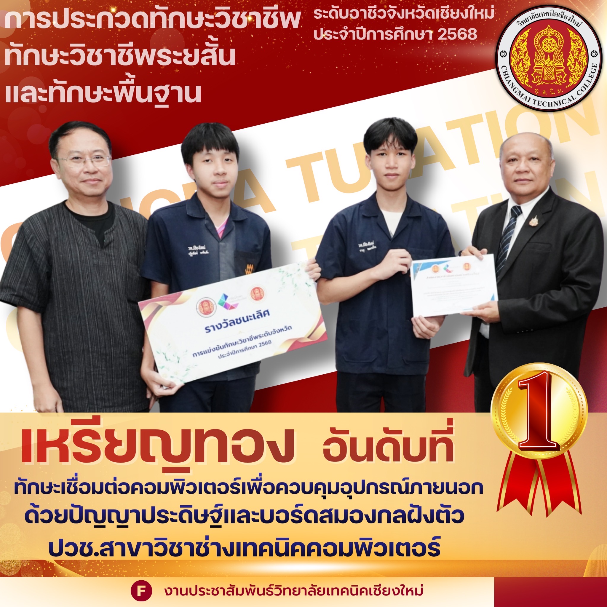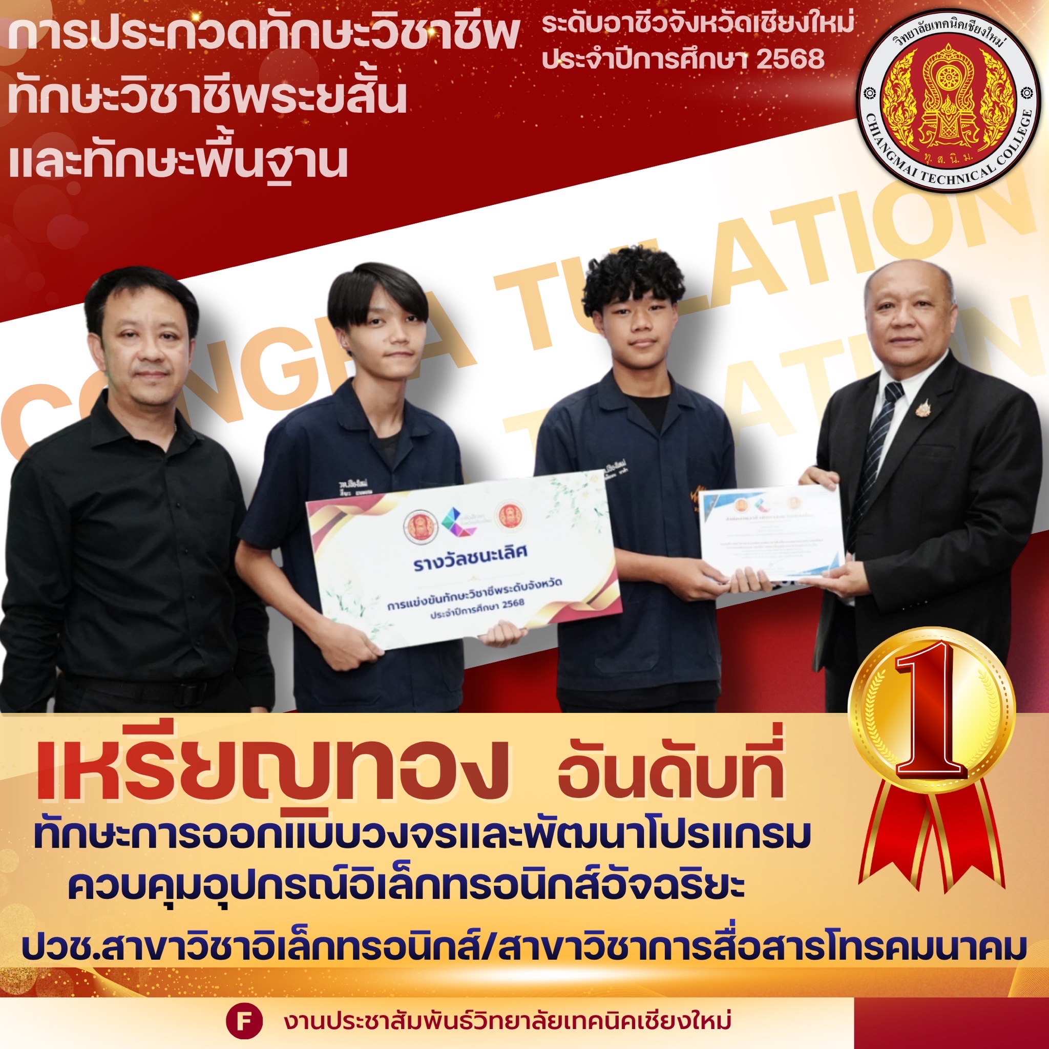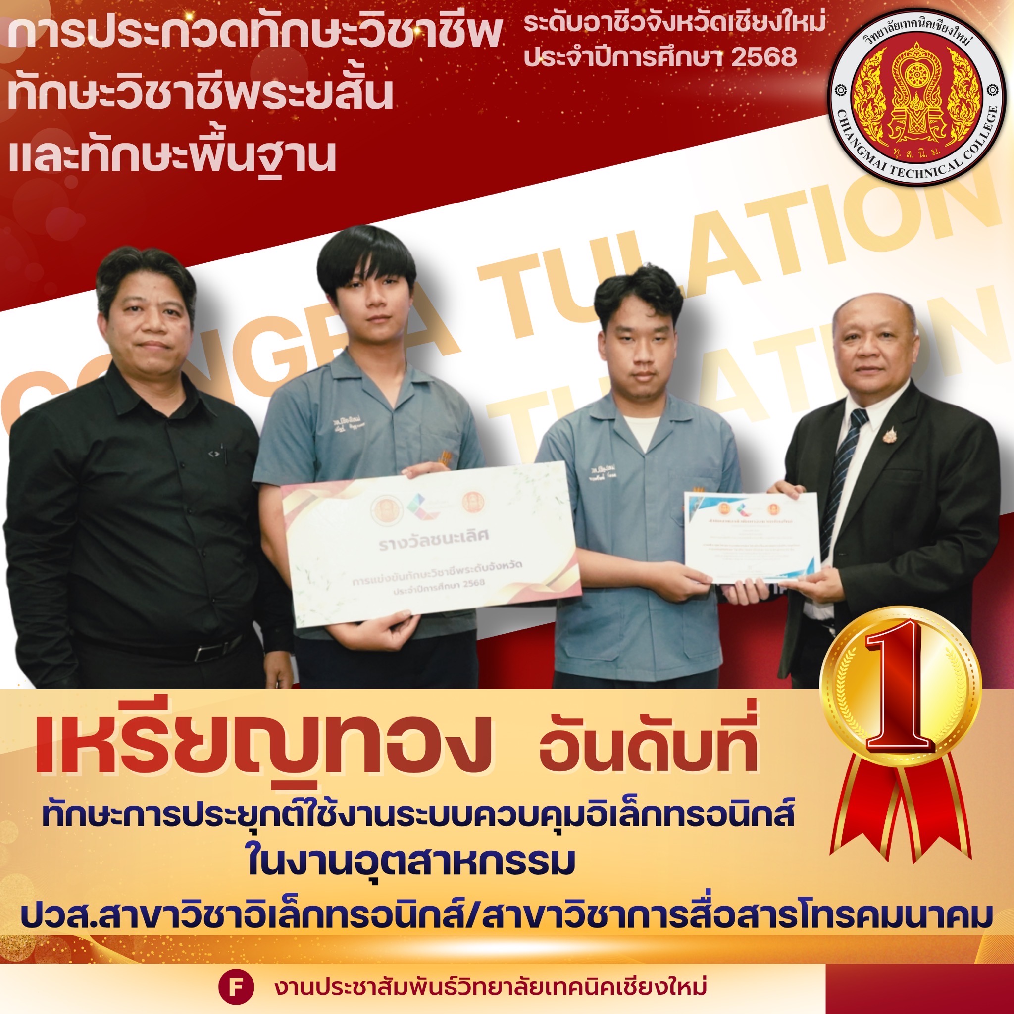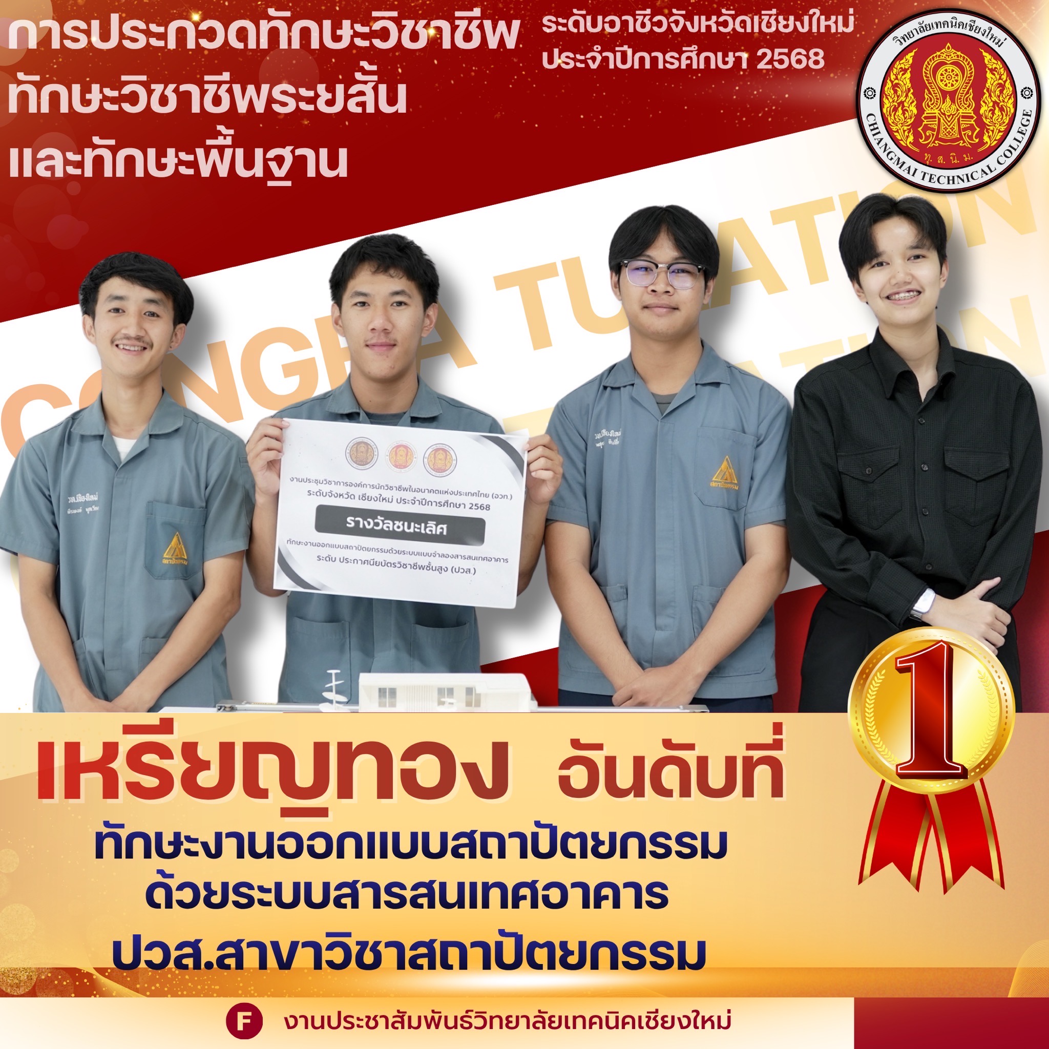 นักเรียน นักศึกษา วิทยาลัยเทคนิคเชียงใหม่ ได้สร้างผลงานสุดยอดเยี่ยม คว้ารางวัลจากการแข่งขัน ทักษะวิชาชีพ ทักษะวิชาชีพระยะสั้น และทักษะพื้นฐาน ระดับอาชีวศึกษาจังหวัดเชียงใหม่ ประจำปีการศึกษา 2568 และผ่านเข้าสู่ ระดับภาค ภาคเหนือ ณ จังหวัดพิษณุโลก รวมทั้งหมด 26 รายการ อย่างสง่างามความสำเร็จในครั้งนี้ เกิดจากความตั้งใจฝึกฝน ความพยายามไม่ย่อท้อและแรงสนับสนุนจากครูผู้ฝึกซ้อมทุกท่าน ที่ร่วมผลักดันศักยภาพของนักเรียนอย่างเต็มที่
