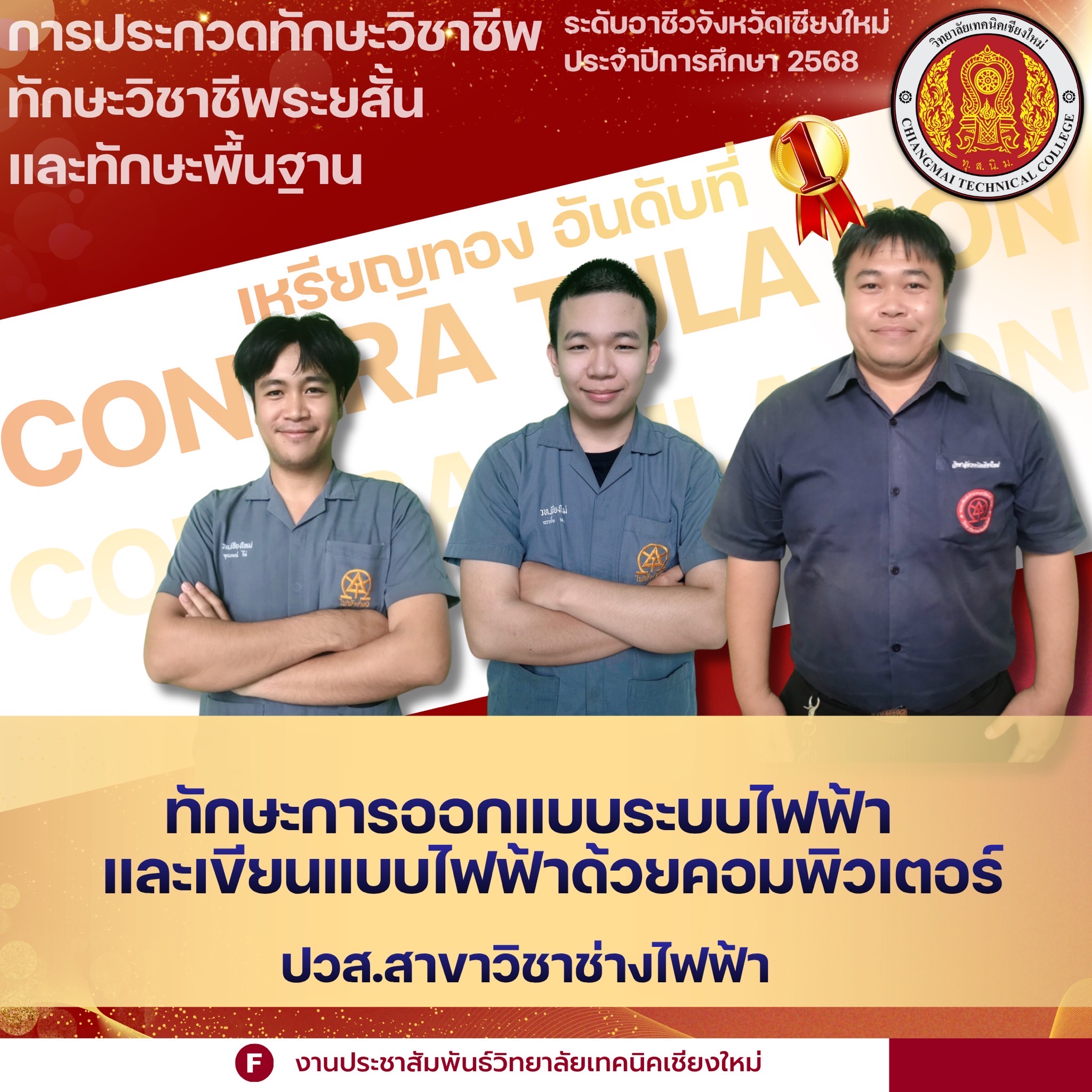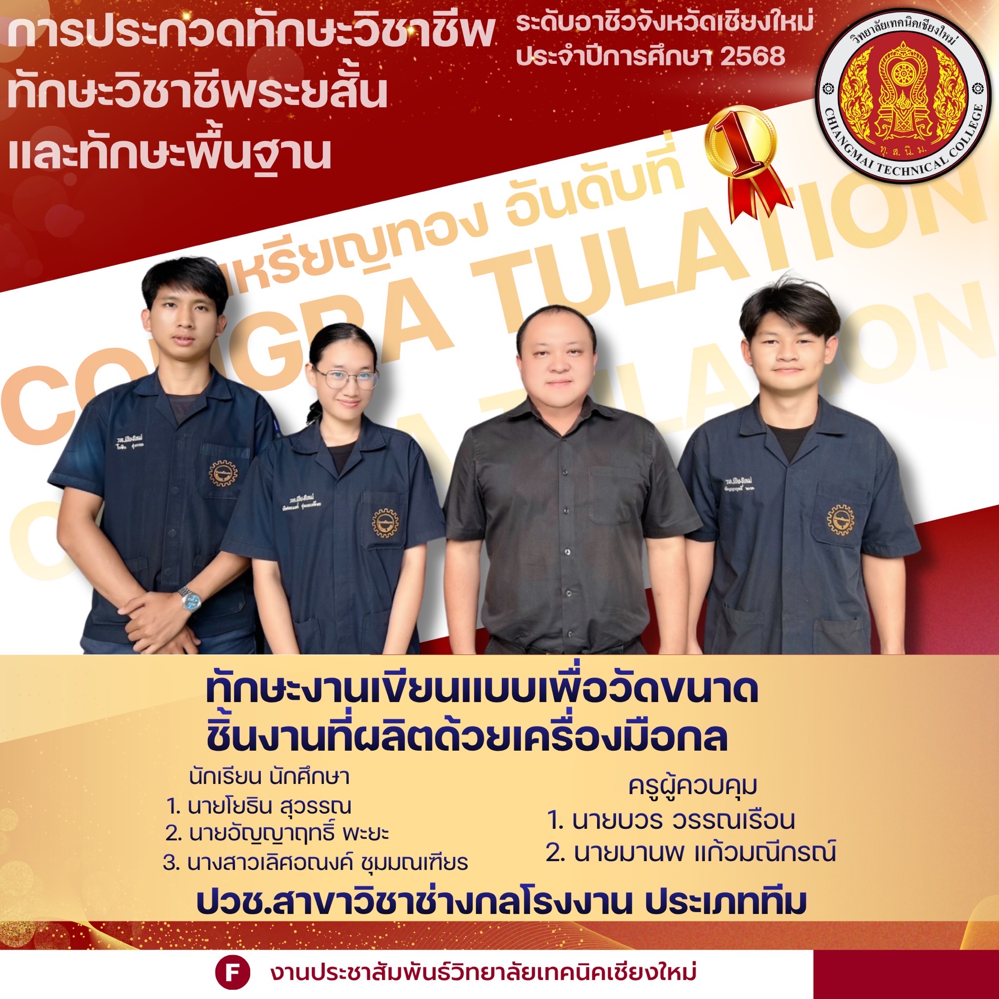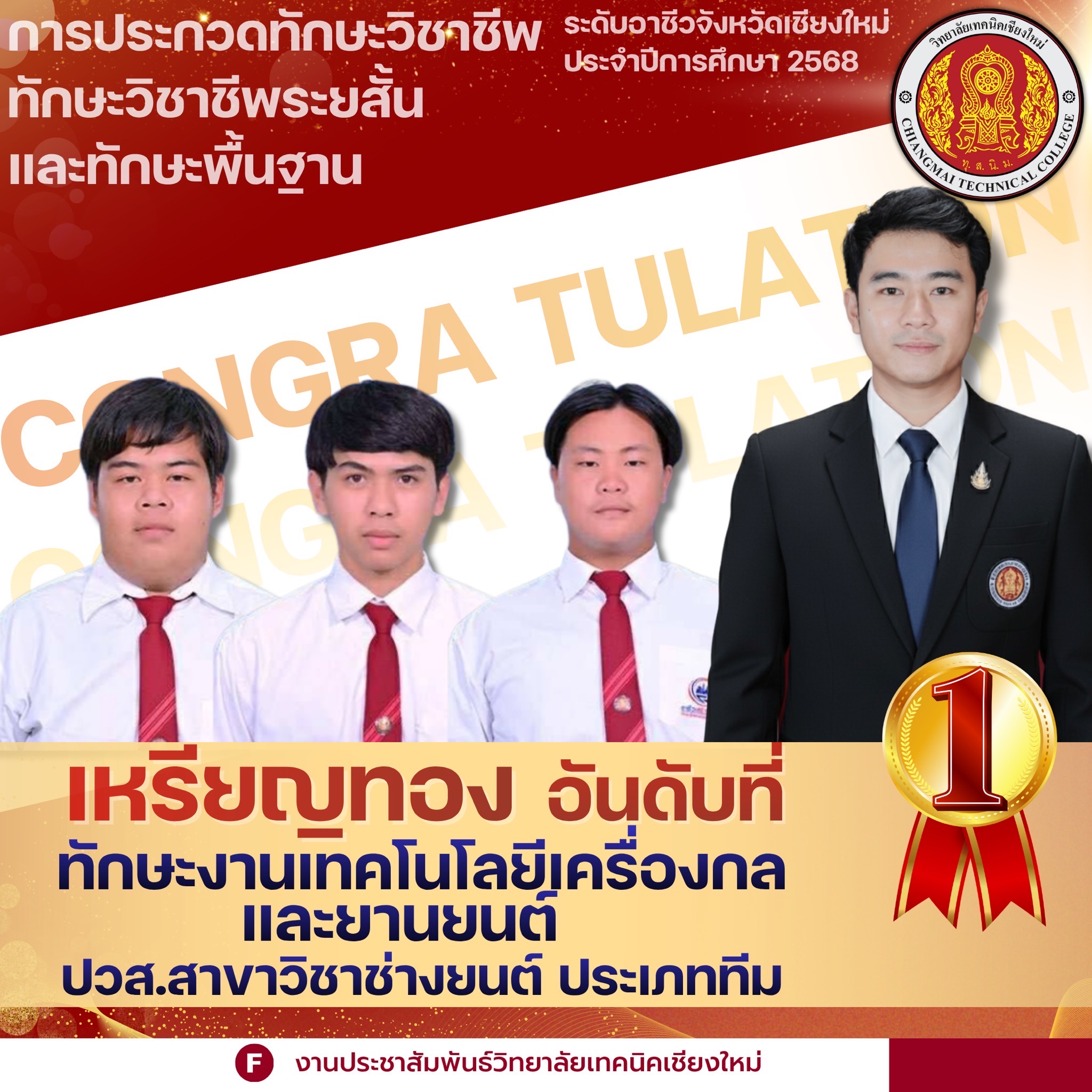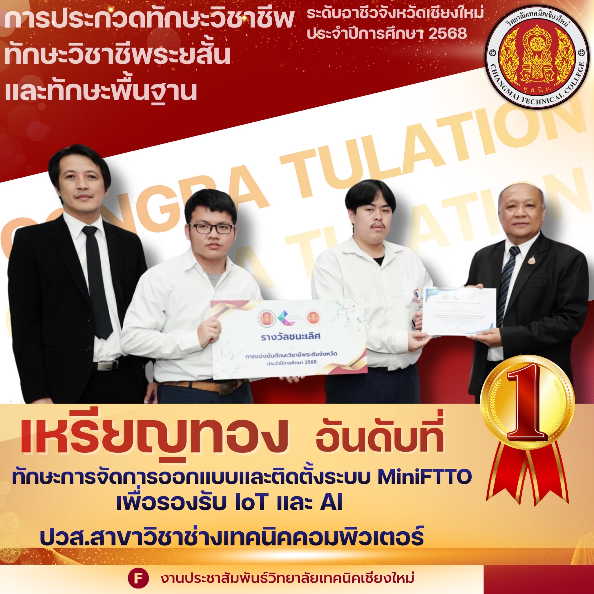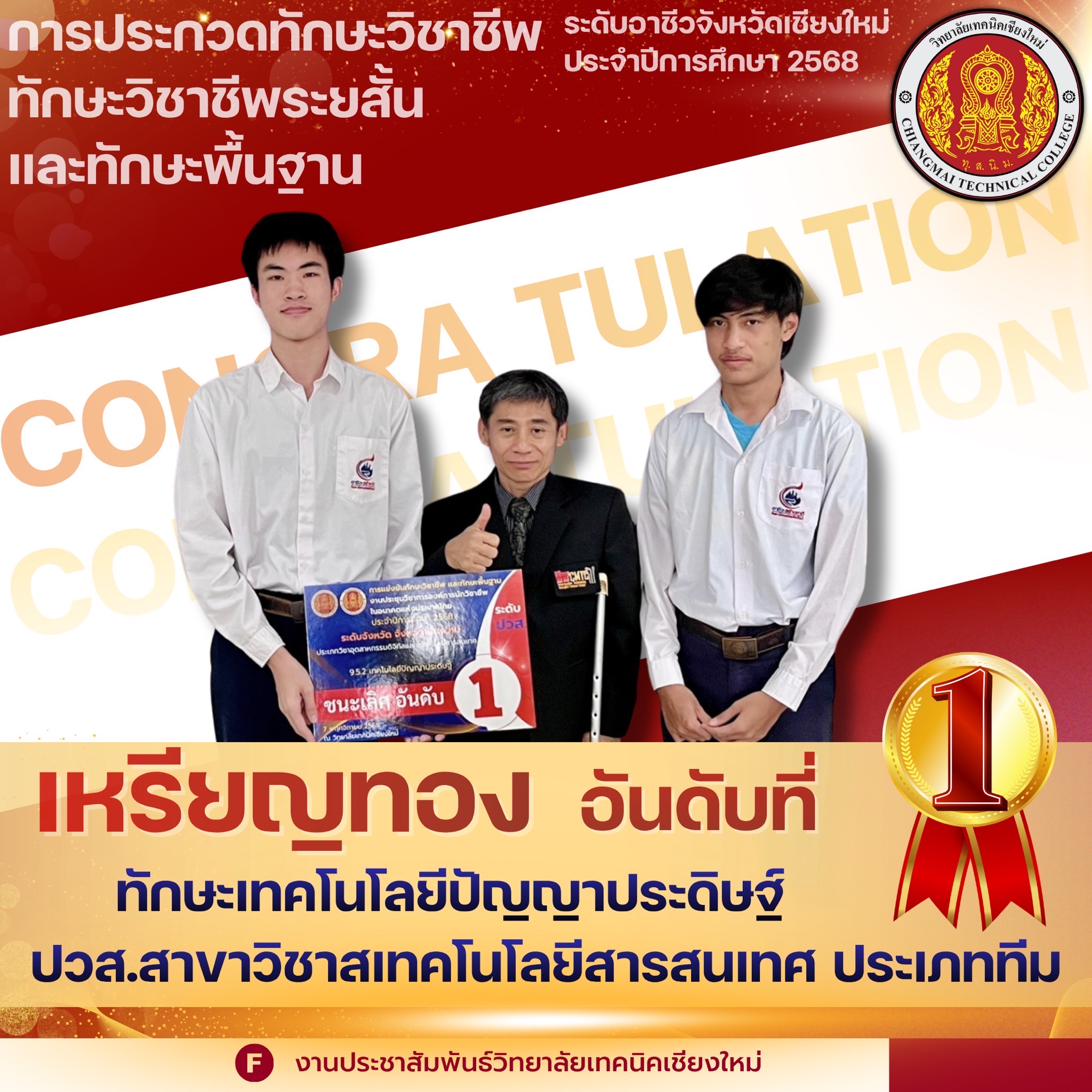 นักเรียน นักศึกษา วิทยาลัยเทคนิคเชียงใหม่ ได้สร้างผลงานสุดยอดเยี่ยม คว้ารางวัลจากการแข่งขัน ทักษะวิชาชีพ ทักษะวิชาชีพระยะสั้น และทักษะพื้นฐาน ระดับอาชีวศึกษาจังหวัดเชียงใหม่ ประจำปีการศึกษา 2568 และผ่านเข้าสู่ ระดับภาค ภาคเหนือ ณ จังหวัดพิษณุโลก รวมทั้งหมด 26 รายการ อย่างสง่างามความสำเร็จในครั้งนี้ เกิดจากความตั้งใจฝึกฝน ความพยายามไม่ย่อท้อและแรงสนับสนุนจากครูผู้ฝึกซ้อมทุกท่าน ที่ร่วมผลักดันศักยภาพของนักเรียนอย่างเต็มที่