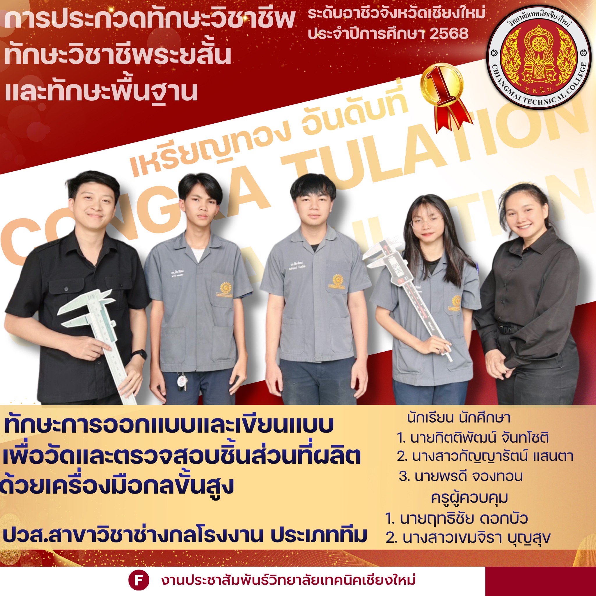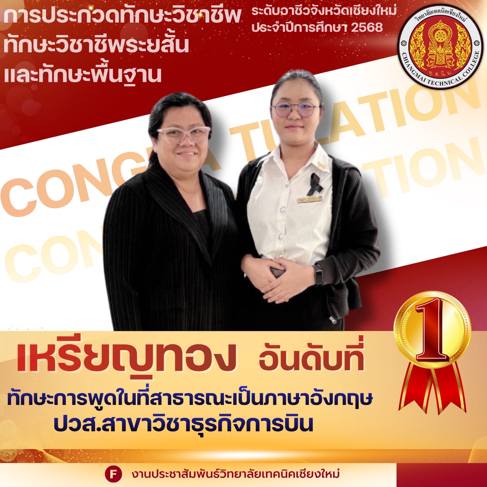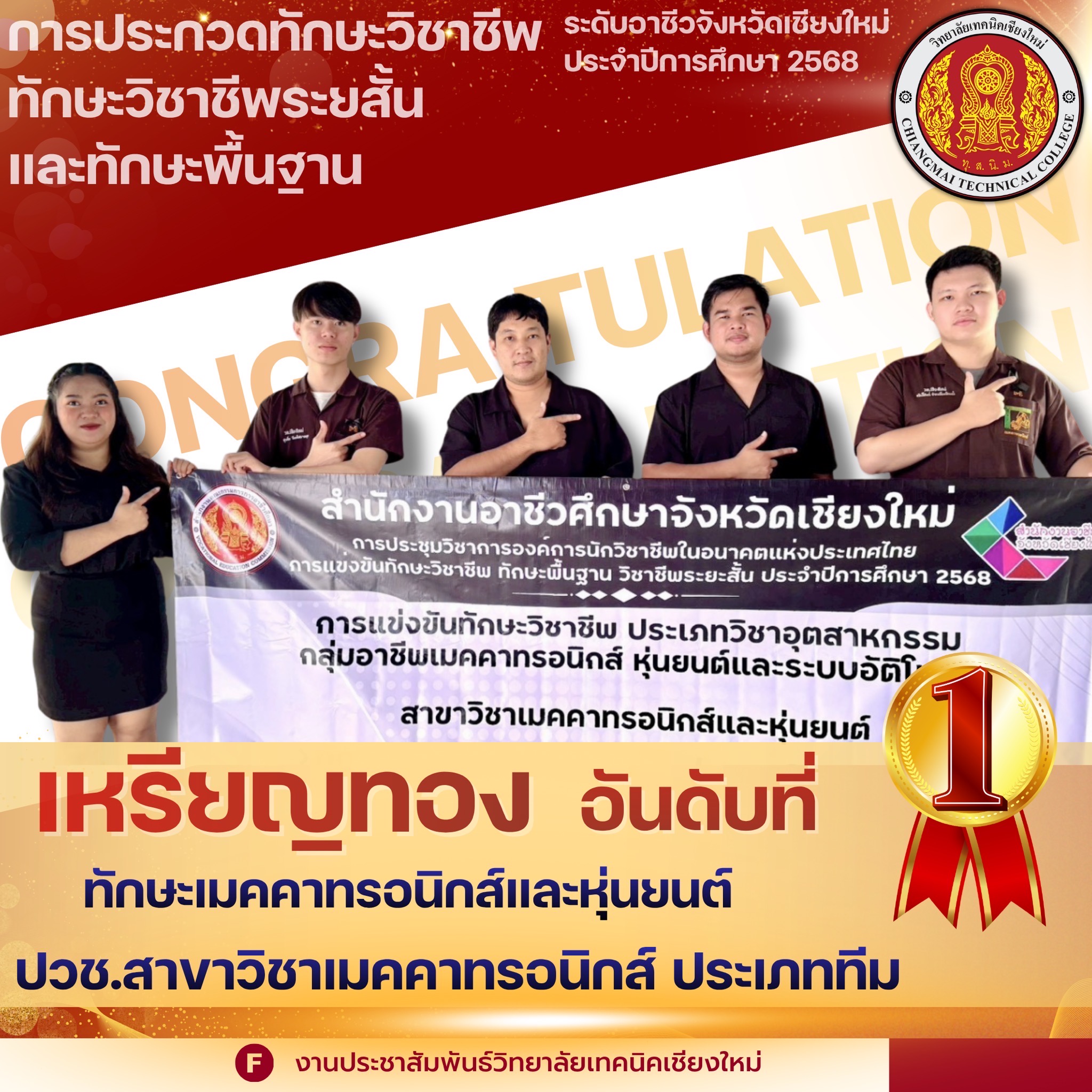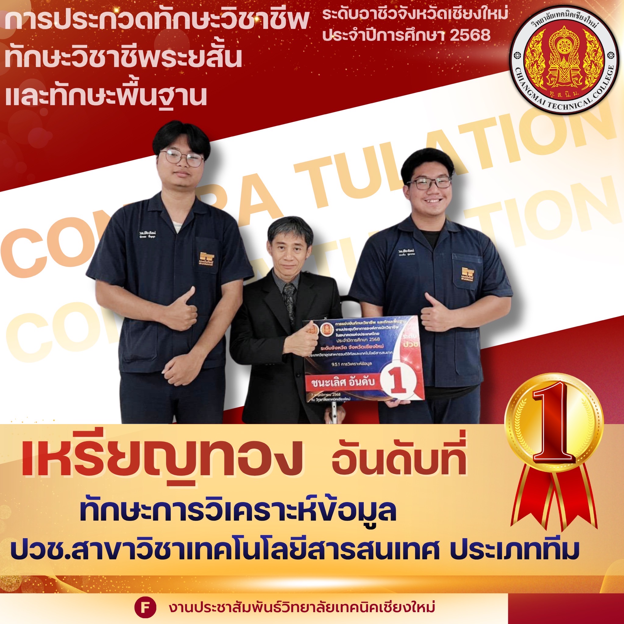 นักเรียน นักศึกษา วิทยาลัยเทคนิคเชียงใหม่ ได้สร้างผลงานสุดยอดเยี่ยม คว้ารางวัลจากการแข่งขัน ทักษะวิชาชีพ ทักษะวิชาชีพระยะสั้น และทักษะพื้นฐาน ระดับอาชีวศึกษาจังหวัดเชียงใหม่ ประจำปีการศึกษา 2568 และผ่านเข้าสู่ ระดับภาค ภาคเหนือ ณ จังหวัดพิษณุโลก รวมทั้งหมด 26 รายการ อย่างสง่างามความสำเร็จในครั้งนี้ เกิดจากความตั้งใจฝึกฝน ความพยายามไม่ย่อท้อและแรงสนับสนุนจากครูผู้ฝึกซ้อมทุกท่าน ที่ร่วมผลักดันศักยภาพของนักเรียนอย่างเต็มที่