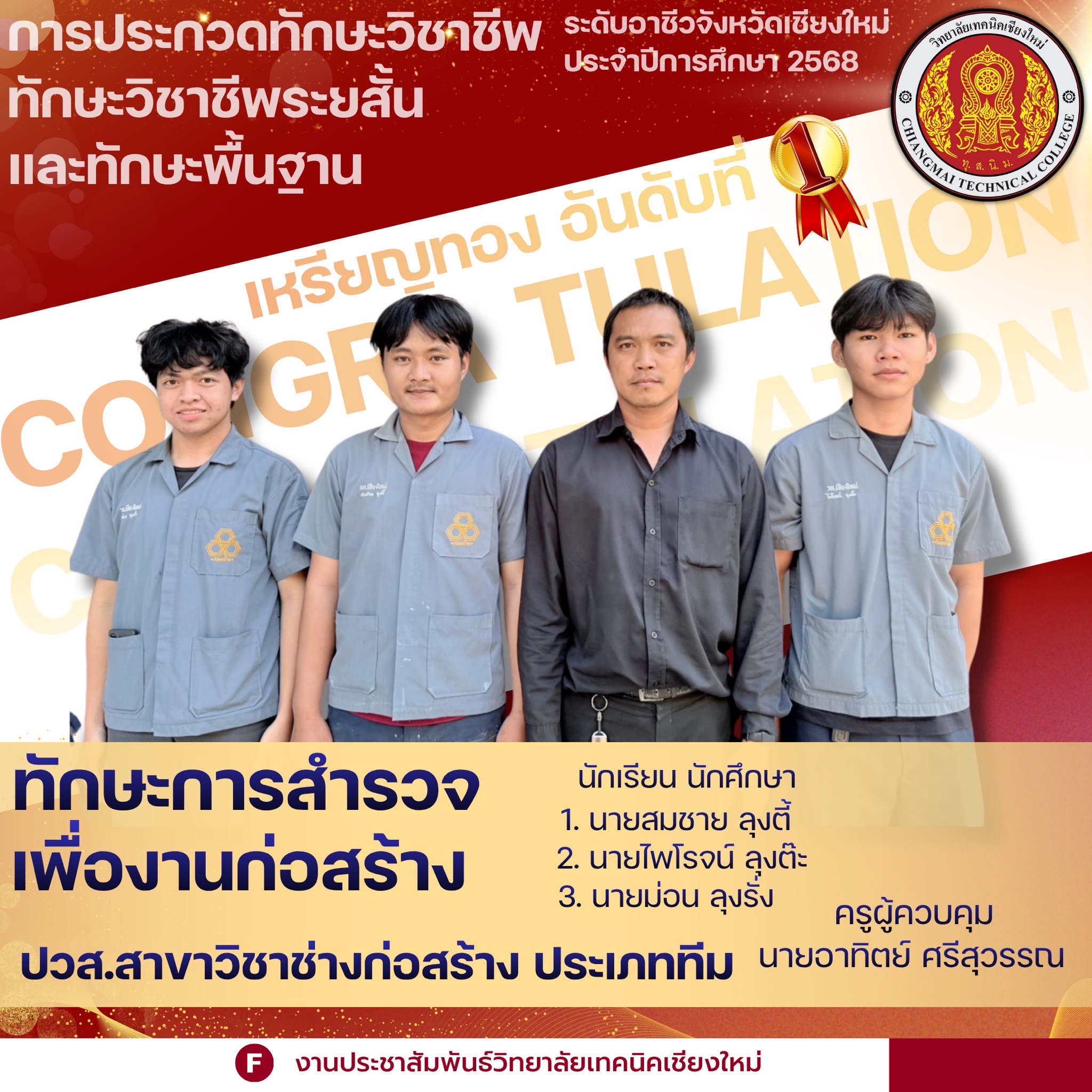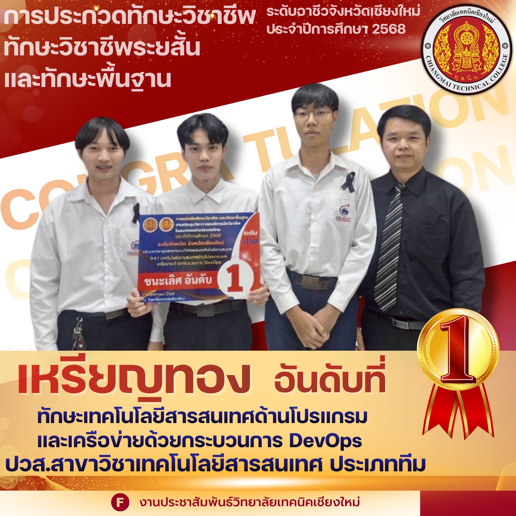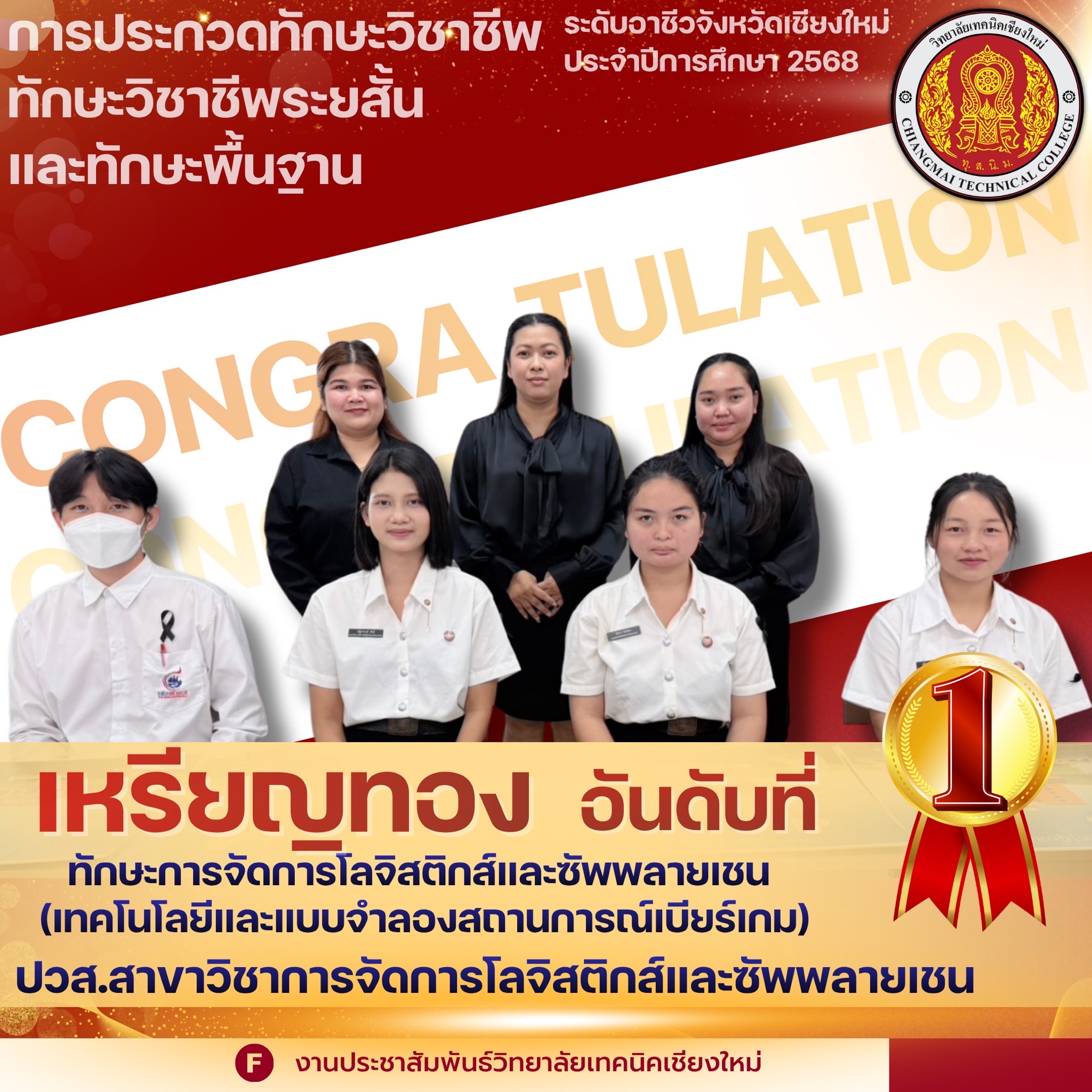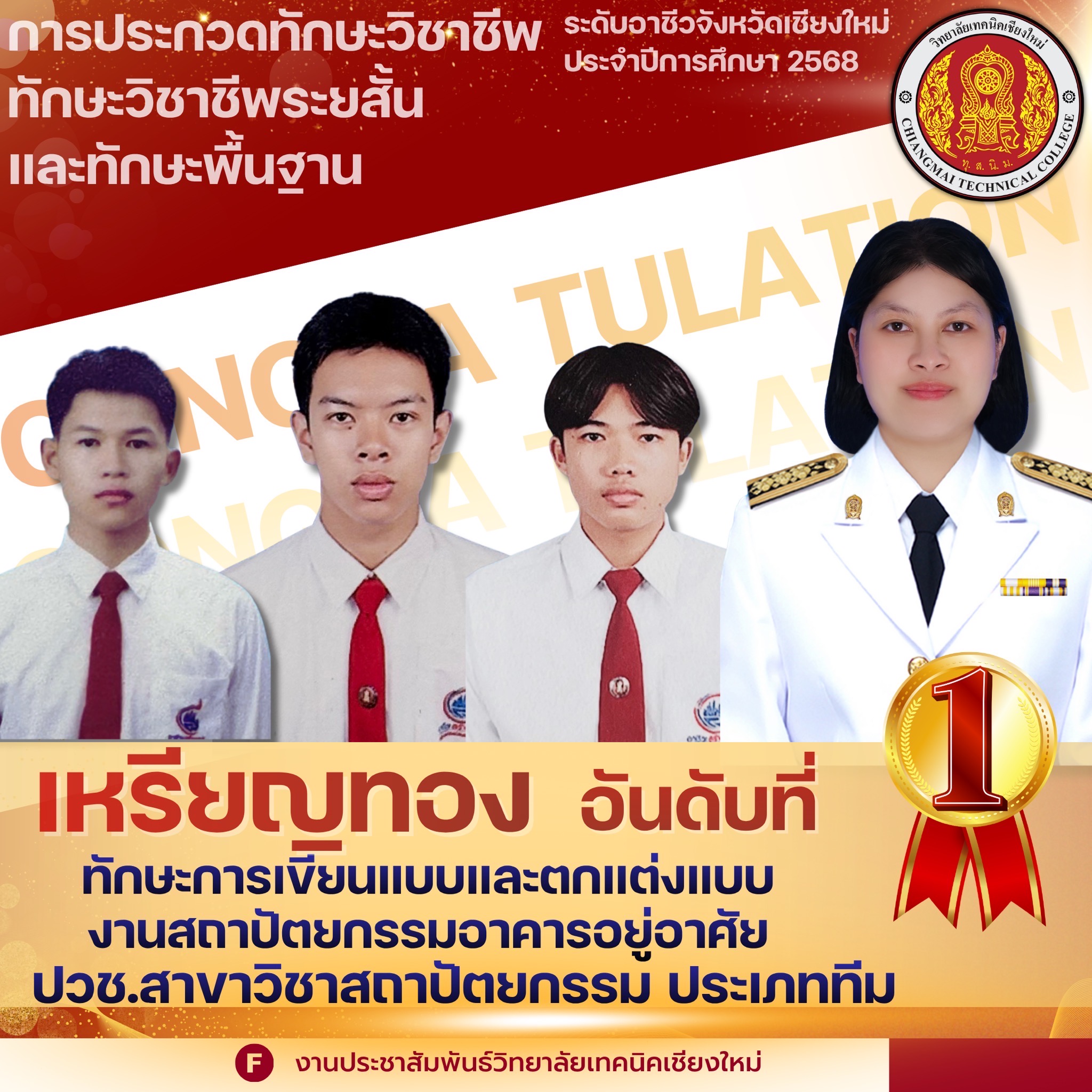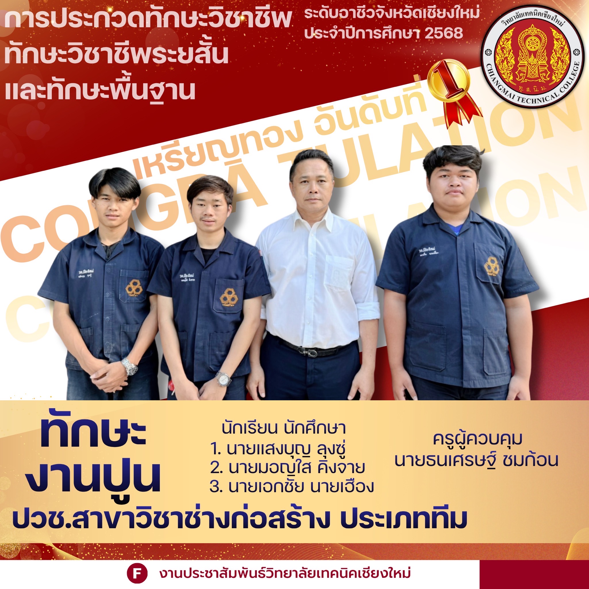 นักเรียน นักศึกษา วิทยาลัยเทคนิคเชียงใหม่ ได้สร้างผลงานสุดยอดเยี่ยม คว้ารางวัลจากการแข่งขัน ทักษะวิชาชีพ ทักษะวิชาชีพระยะสั้น และทักษะพื้นฐาน ระดับอาชีวศึกษาจังหวัดเชียงใหม่ ประจำปีการศึกษา 2568 และผ่านเข้าสู่ ระดับภาค ภาคเหนือ ณ จังหวัดพิษณุโลก รวมทั้งหมด 26 รายการ อย่างสง่างามความสำเร็จในครั้งนี้ เกิดจากความตั้งใจฝึกฝน ความพยายามไม่ย่อท้อและแรงสนับสนุนจากครูผู้ฝึกซ้อมทุกท่าน ที่ร่วมผลักดันศักยภาพของนักเรียนอย่างเต็มที่