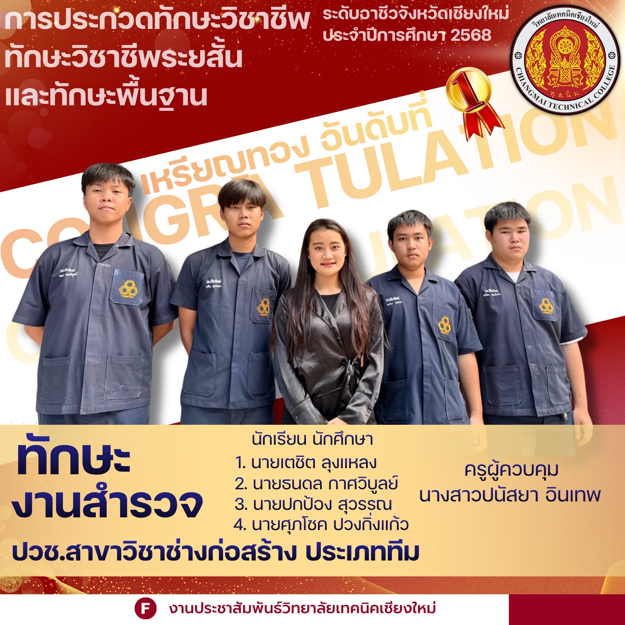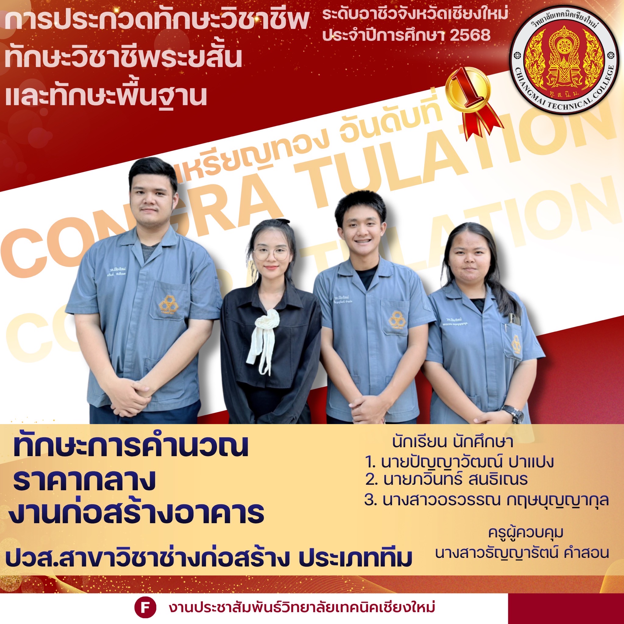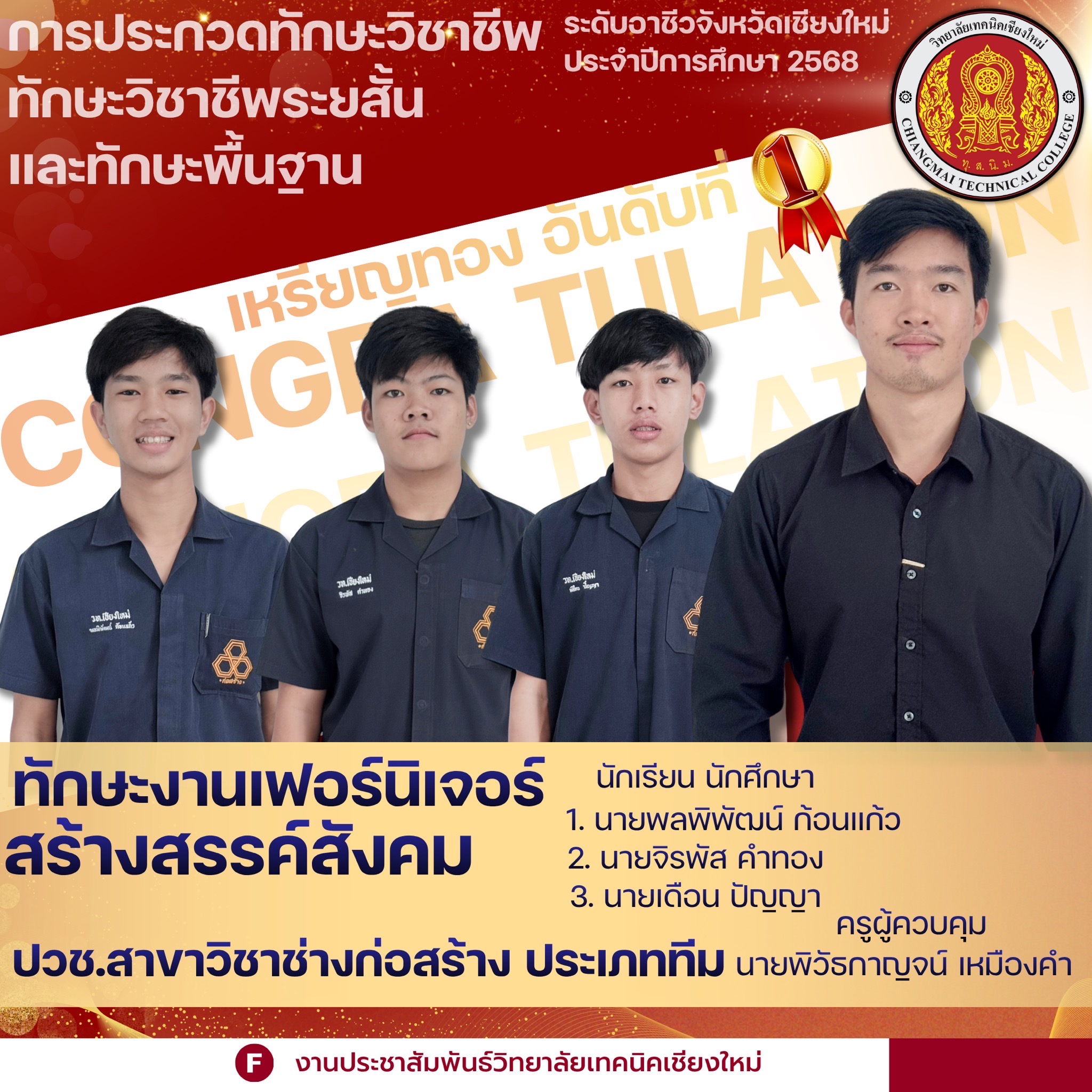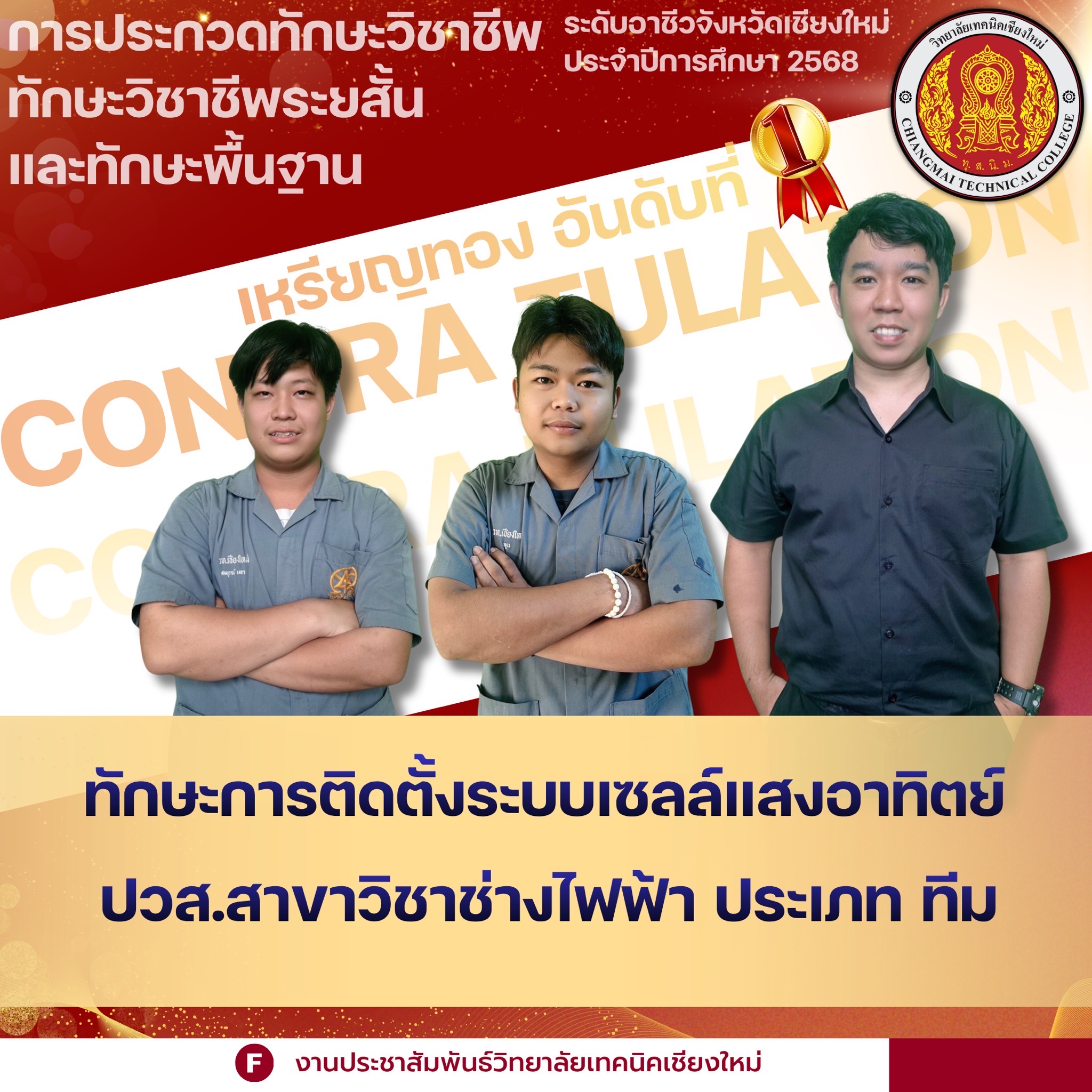 นักเรียน นักศึกษา วิทยาลัยเทคนิคเชียงใหม่ ได้สร้างผลงานสุดยอดเยี่ยม คว้ารางวัลจากการแข่งขัน ทักษะวิชาชีพ ทักษะวิชาชีพระยะสั้น และทักษะพื้นฐาน ระดับอาชีวศึกษาจังหวัดเชียงใหม่ ประจำปีการศึกษา 2568 และผ่านเข้าสู่ ระดับภาค ภาคเหนือ ณ จังหวัดพิษณุโลก รวมทั้งหมด 26 รายการ อย่างสง่างามความสำเร็จในครั้งนี้ เกิดจากความตั้งใจฝึกฝน ความพยายามไม่ย่อท้อและแรงสนับสนุนจากครูผู้ฝึกซ้อมทุกท่าน ที่ร่วมผลักดันศักยภาพของนักเรียนอย่างเต็มที่