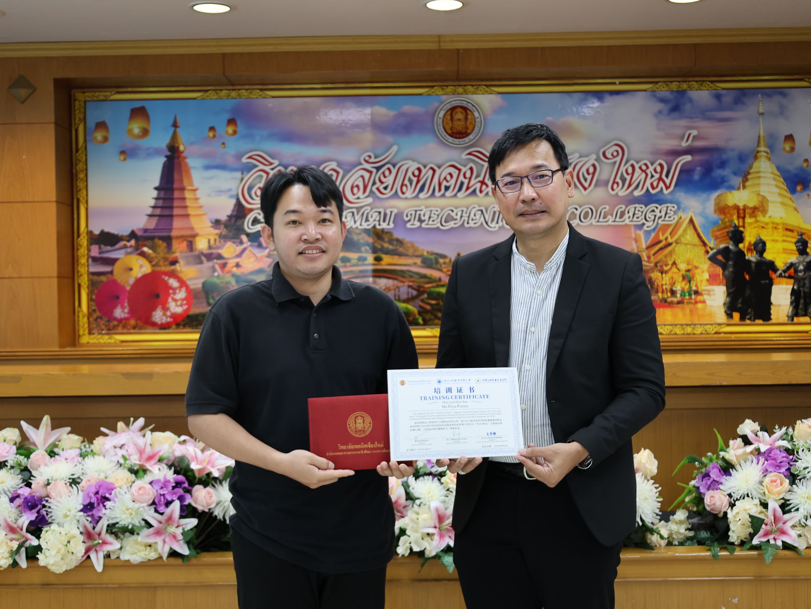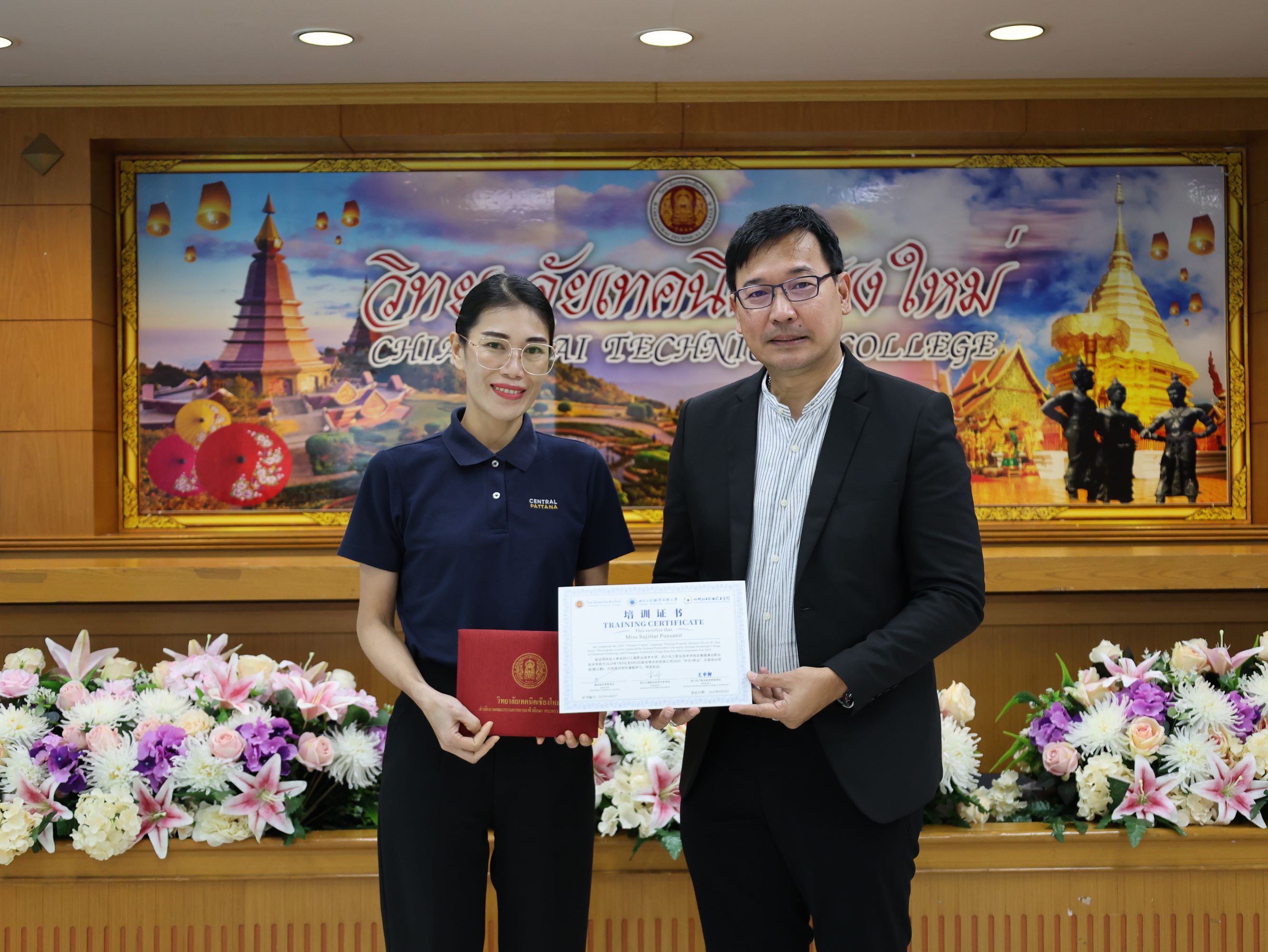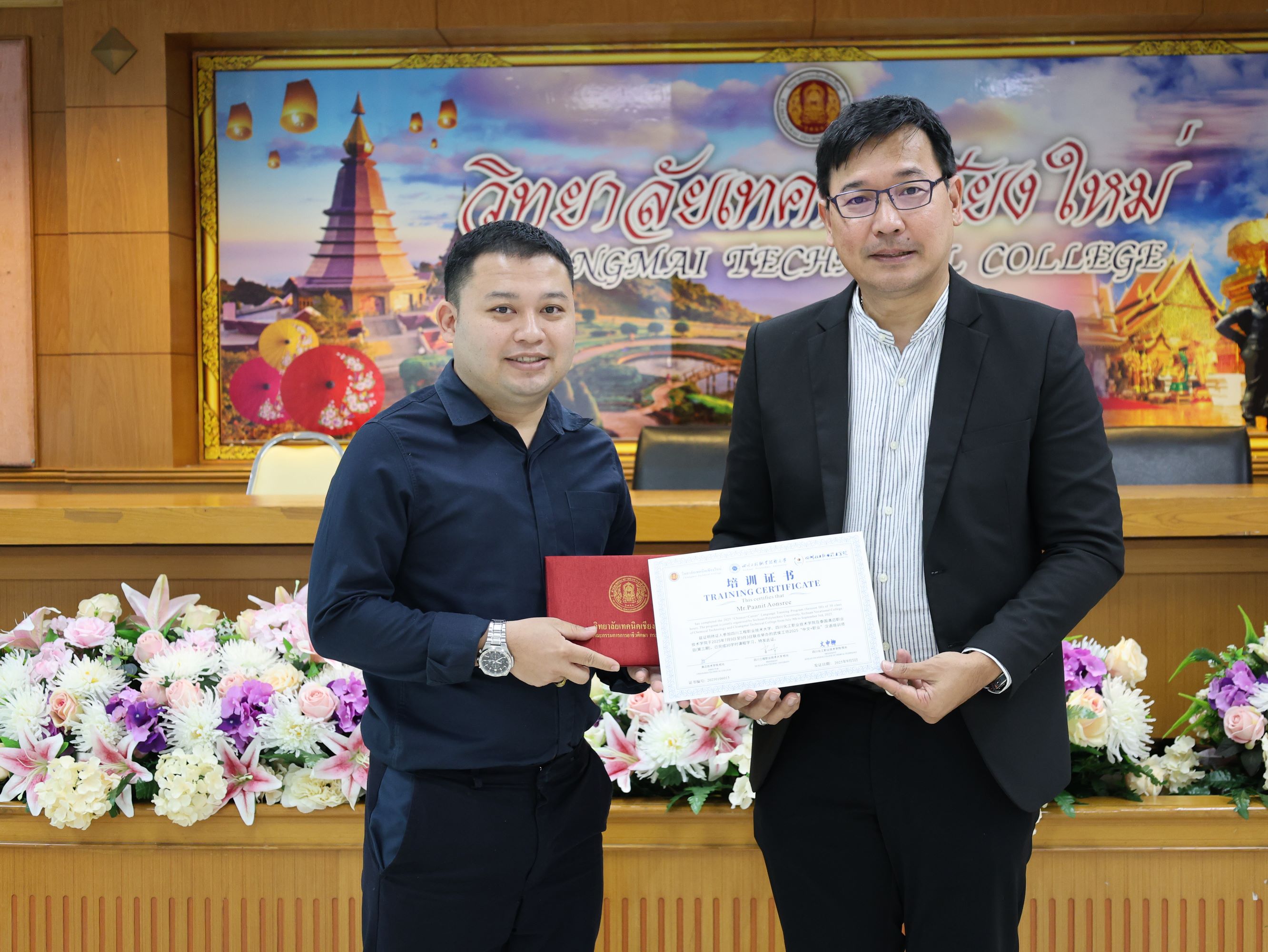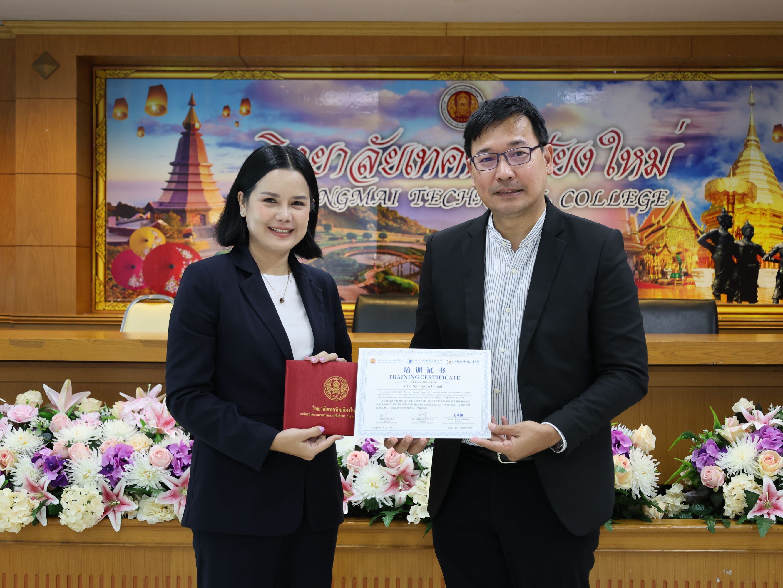 ดร.วัชรพงศ์ ฝั้นติ๊บ ผู้อำนวยการวิทยาลัยเทคนิคเชียงใหม่ ปฏิบัติหน้าที่ผู้อำนวยการสำนักงานอาชีวศึกษาจังหวัดเชียงใหม่ และรักษาการในตำแหน่งที่ปรึกษาด้านนโยบายและแผน สำนักงานคณะกรรมการการอาชีวศึกษามอบหมายให้นายชรันต์ยุทธ์ บุญยง รองผู้อำนวยการฝ่ายบริหารทรัพยากร ให้การต้อนรับและกล่าวแสดงความยินดีในโอกาสพิธีปิดและรับมอบเกียรติบัตรการอบรม สำหรับพนักงานสายบริการ กลุ่มบริษัทเซ็นทรัล เชียงใหม่ แอร์พอร์ต ในโอกาสสำเร็จหลักสูตรการอบรมพัฒนาด้านภาษาและวัฒนธรรมจันเพื่องานบริการ โดยมีนางศศิกาญจน์ เรือนศาสตร์ รองผู้อำนวยการ ฝ่ายแผนงานและความร่วมมือ นายสุจินต์ วังใหม่ รองผู้อำนวยการ ฝ่ายพัฒนากิจการนักเรียน นักศึกษา รศ.หลัว จากมหาวิทยาลัยเทคนิคและวิศวกรรมเสฉวน และ ผศ.เจิง จากวิทยาลัยเทคโนโลยีอุตสาหกรรมเคมีเสฉวน ประเทศจีน นายอดิเรก นวลศรี หัวหน้างานศูนย์ภาษาและวัฒนธรรมจีน เข้าร่วมฯ