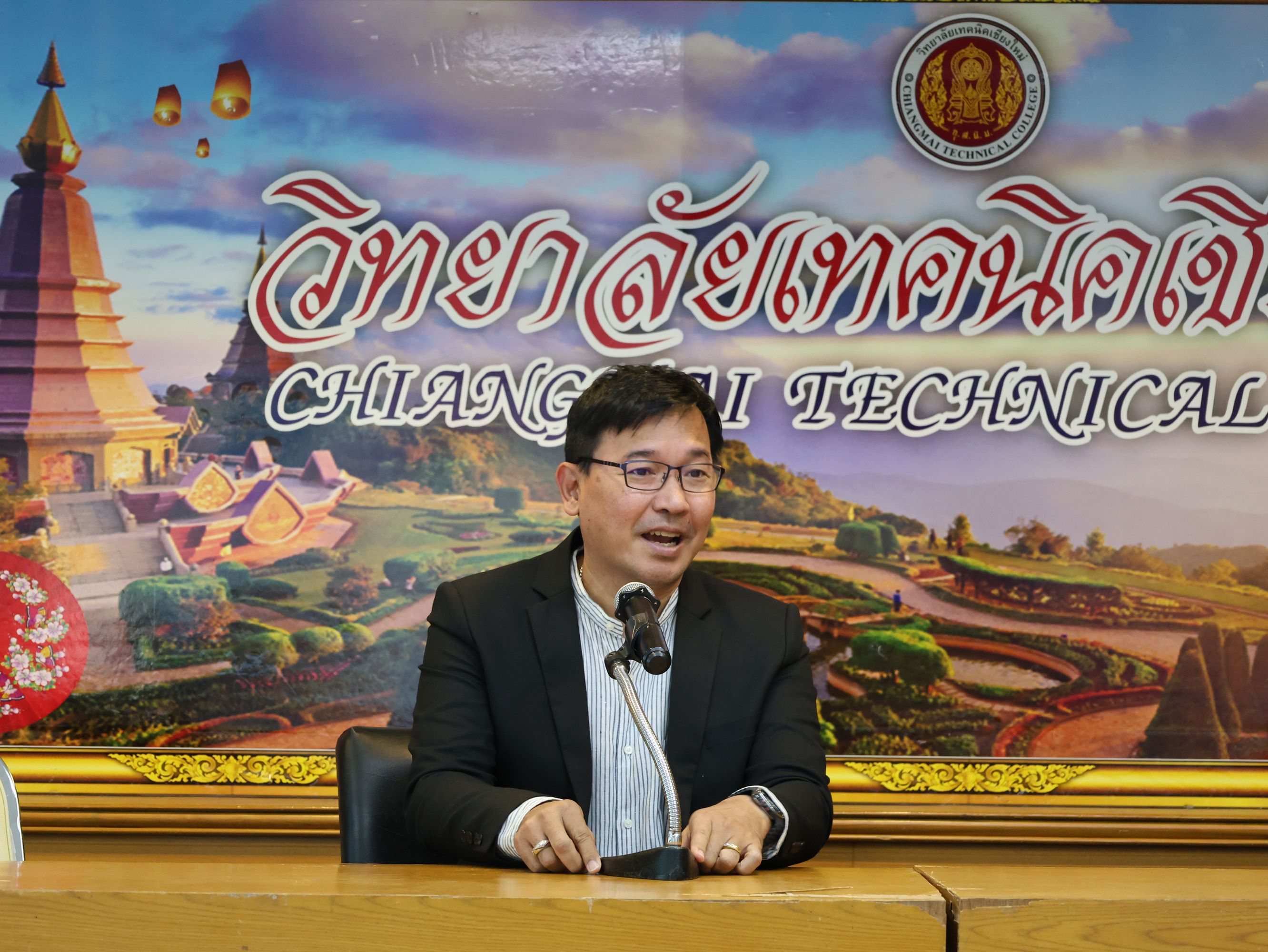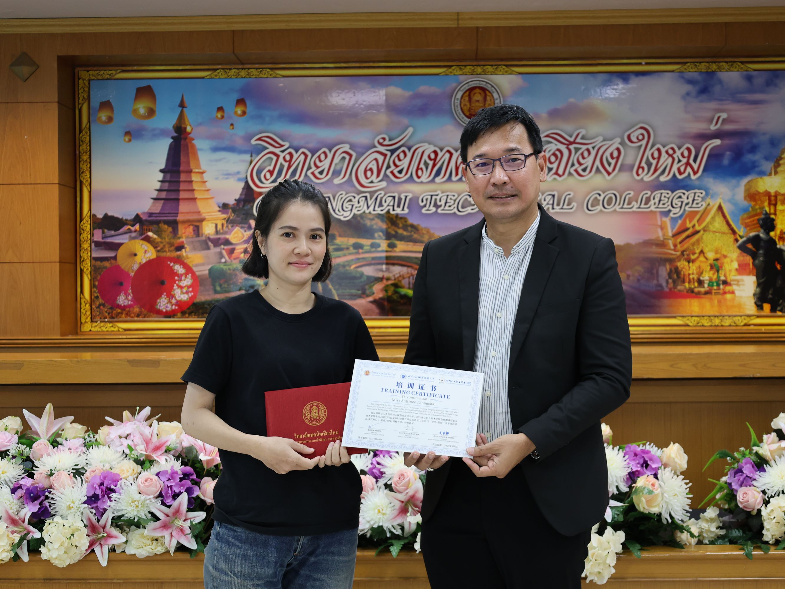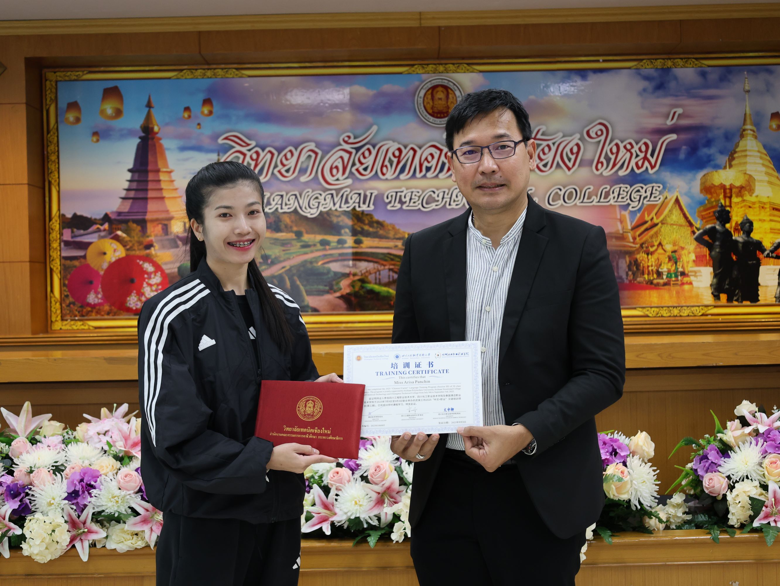 ดร.วัชรพงศ์ ฝั้นติ๊บ ผู้อำนวยการวิทยาลัยเทคนิคเชียงใหม่ ปฏิบัติหน้าที่ผู้อำนวยการสำนักงานอาชีวศึกษาจังหวัดเชียงใหม่ และรักษาการในตำแหน่งที่ปรึกษาด้านนโยบายและแผน สำนักงานคณะกรรมการการอาชีวศึกษามอบหมายให้นายชรันต์ยุทธ์ บุญยง รองผู้อำนวยการฝ่ายบริหารทรัพยากร ให้การต้อนรับและกล่าวแสดงความยินดีในโอกาสพิธีปิดและรับมอบเกียรติบัตรการอบรม สำหรับพนักงานสายบริการ กลุ่มบริษัทเซ็นทรัล เชียงใหม่ แอร์พอร์ต ในโอกาสสำเร็จหลักสูตรการอบรมพัฒนาด้านภาษาและวัฒนธรรมจันเพื่องานบริการ โดยมีนางศศิกาญจน์ เรือนศาสตร์ รองผู้อำนวยการ ฝ่ายแผนงานและความร่วมมือ นายสุจินต์ วังใหม่ รองผู้อำนวยการ ฝ่ายพัฒนากิจการนักเรียน นักศึกษา รศ.หลัว จากมหาวิทยาลัยเทคนิคและวิศวกรรมเสฉวน และ ผศ.เจิง จากวิทยาลัยเทคโนโลยีอุตสาหกรรมเคมีเสฉวน ประเทศจีน นายอดิเรก นวลศรี หัวหน้างานศูนย์ภาษาและวัฒนธรรมจีน เข้าร่วมฯ