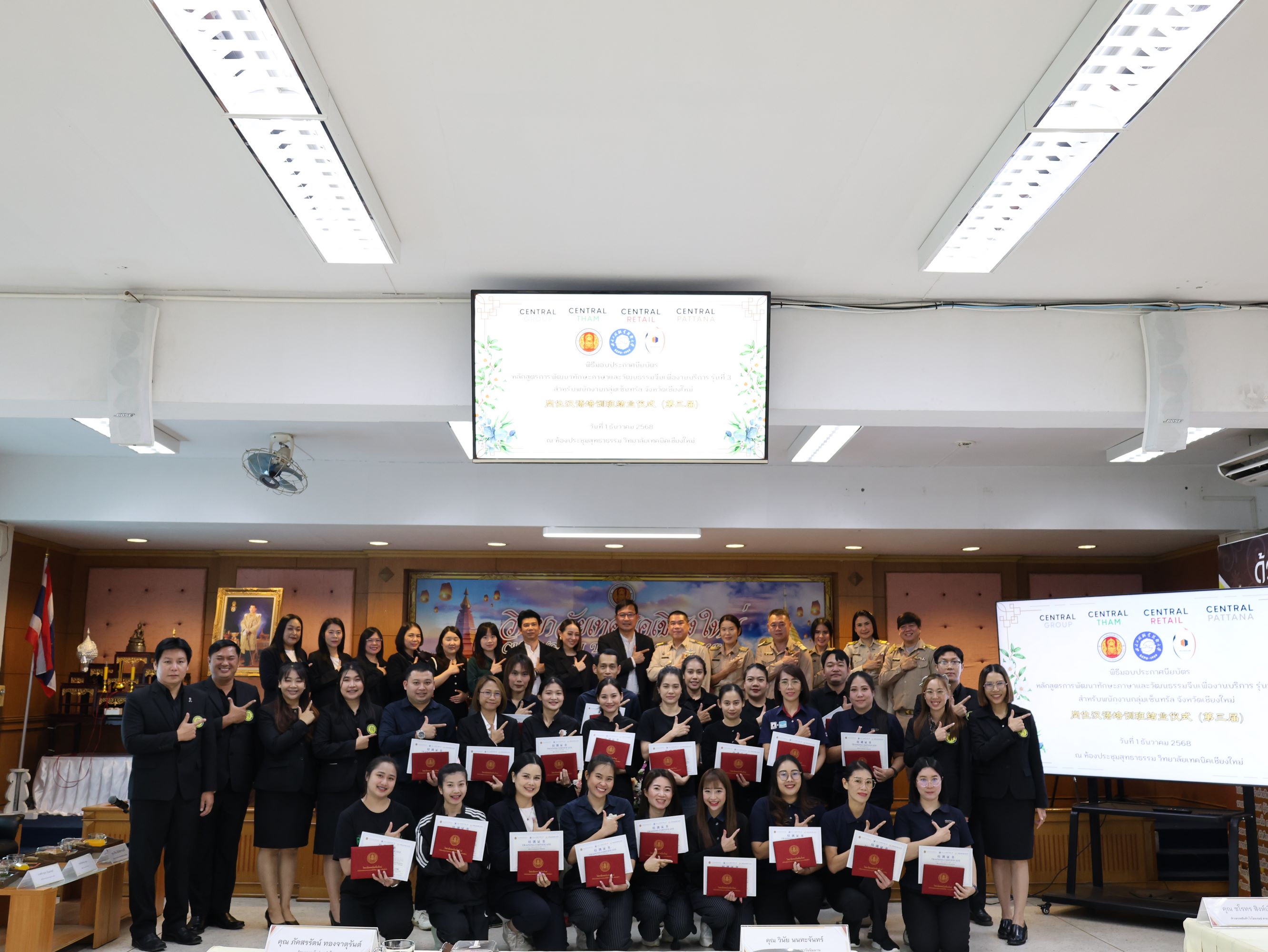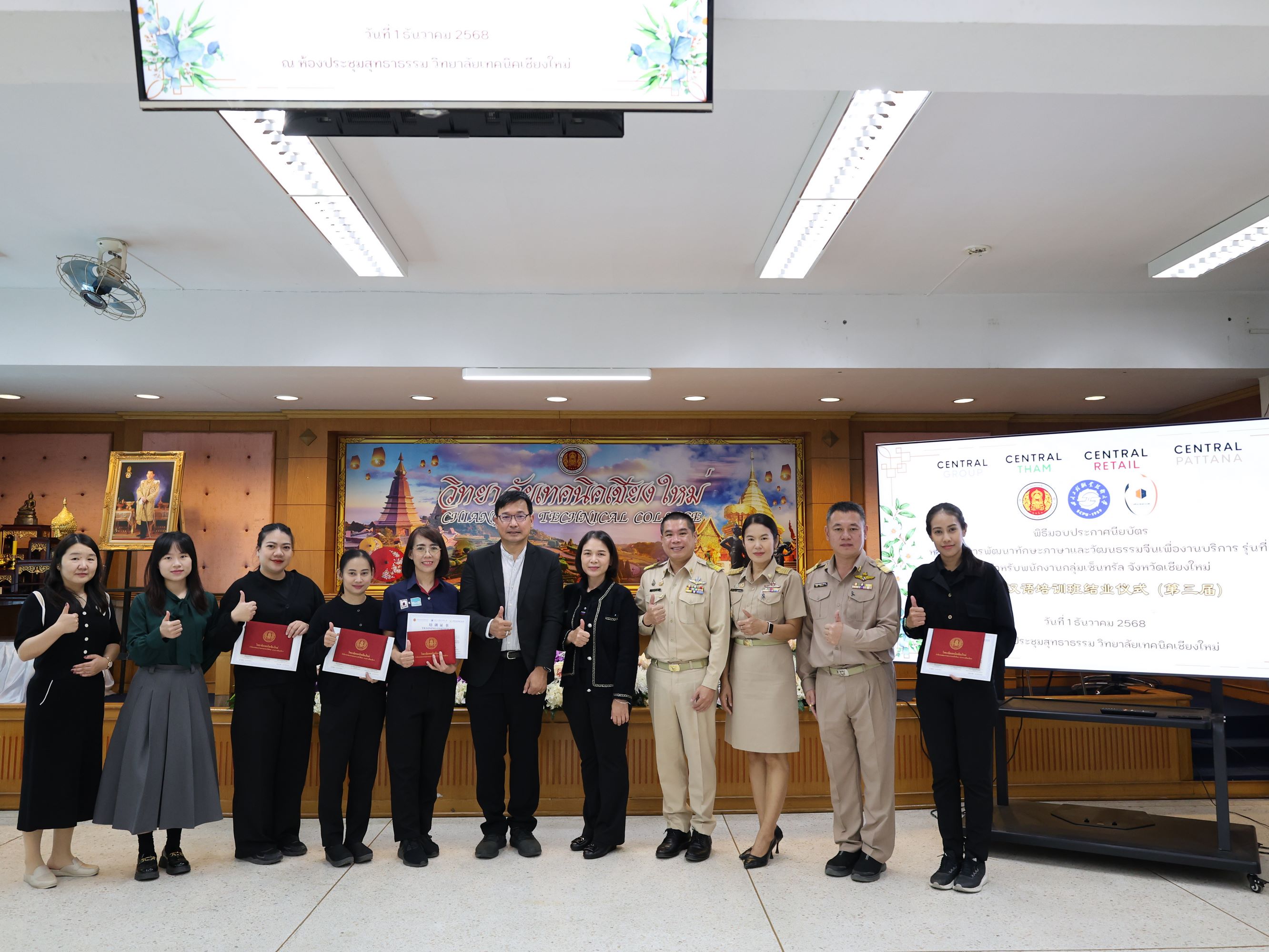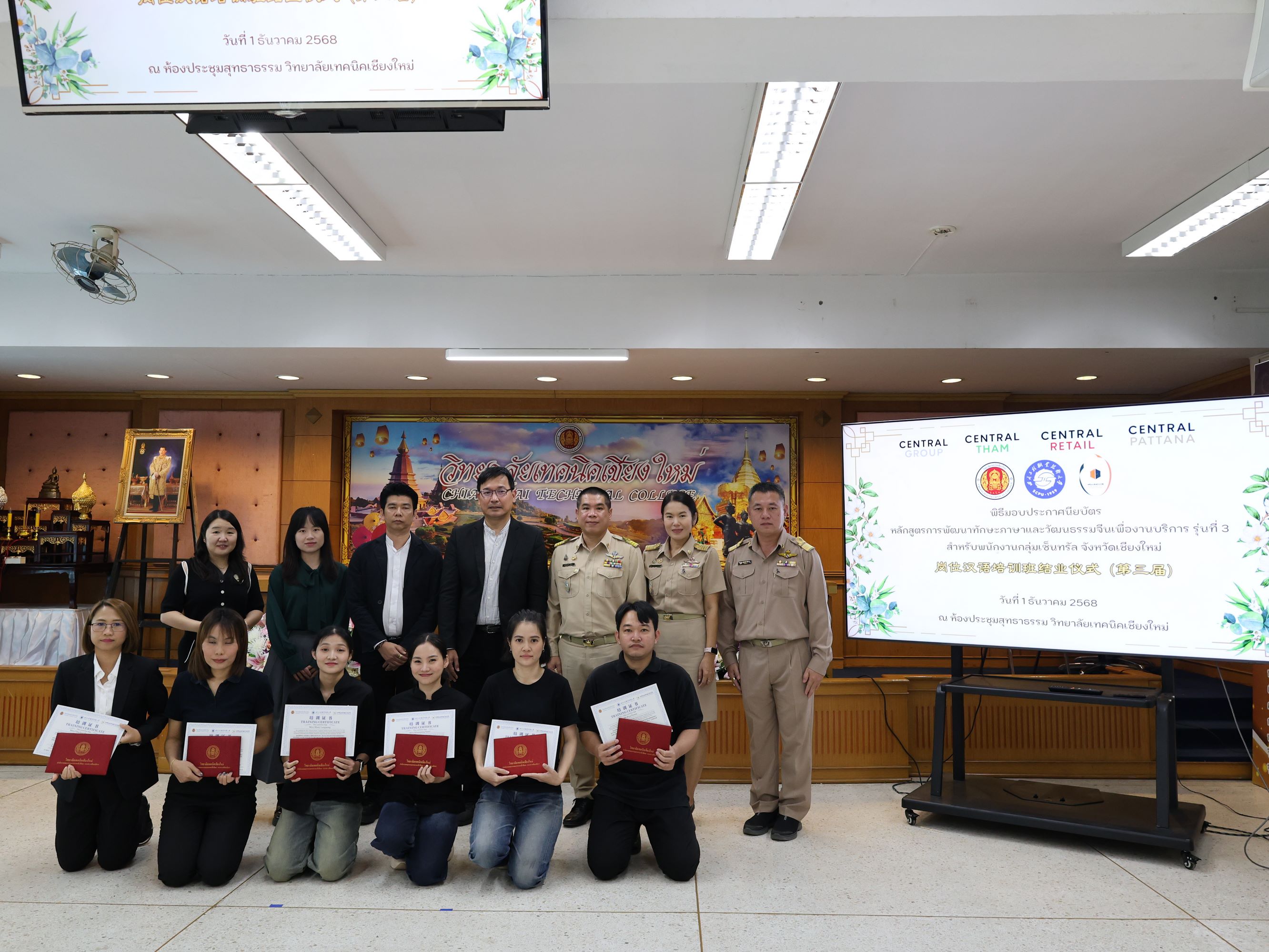 ทั้งนี้ได้รับเกียรติจาก คุณศิระ สันติตรานนท์ ผู้อำนวยการศูนย์การค้า เซ็นทรัล เชียงใหม่ แอร์พอร์ตเป็นตัวแทนผู้บริหารระดับสูงกลุ่มบริษัทเซ็นทรัลมอบเกียรติบัตรให้กับผู้สำเร็จหลักสูตรการอบรมฯ พร้อมกล่าวแสดงความยินดี และแนวทางการพัฒนาศักยภาพของพนักงานร่วมกับวิทยาลัยเทคนิคเชียงใหม่ในอนาคตต่อไป