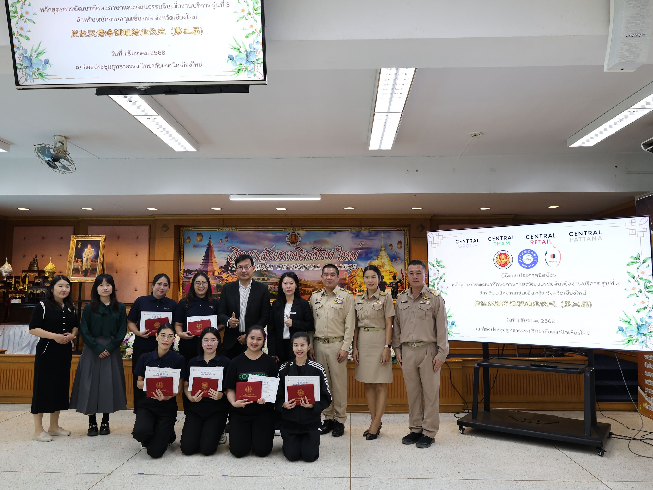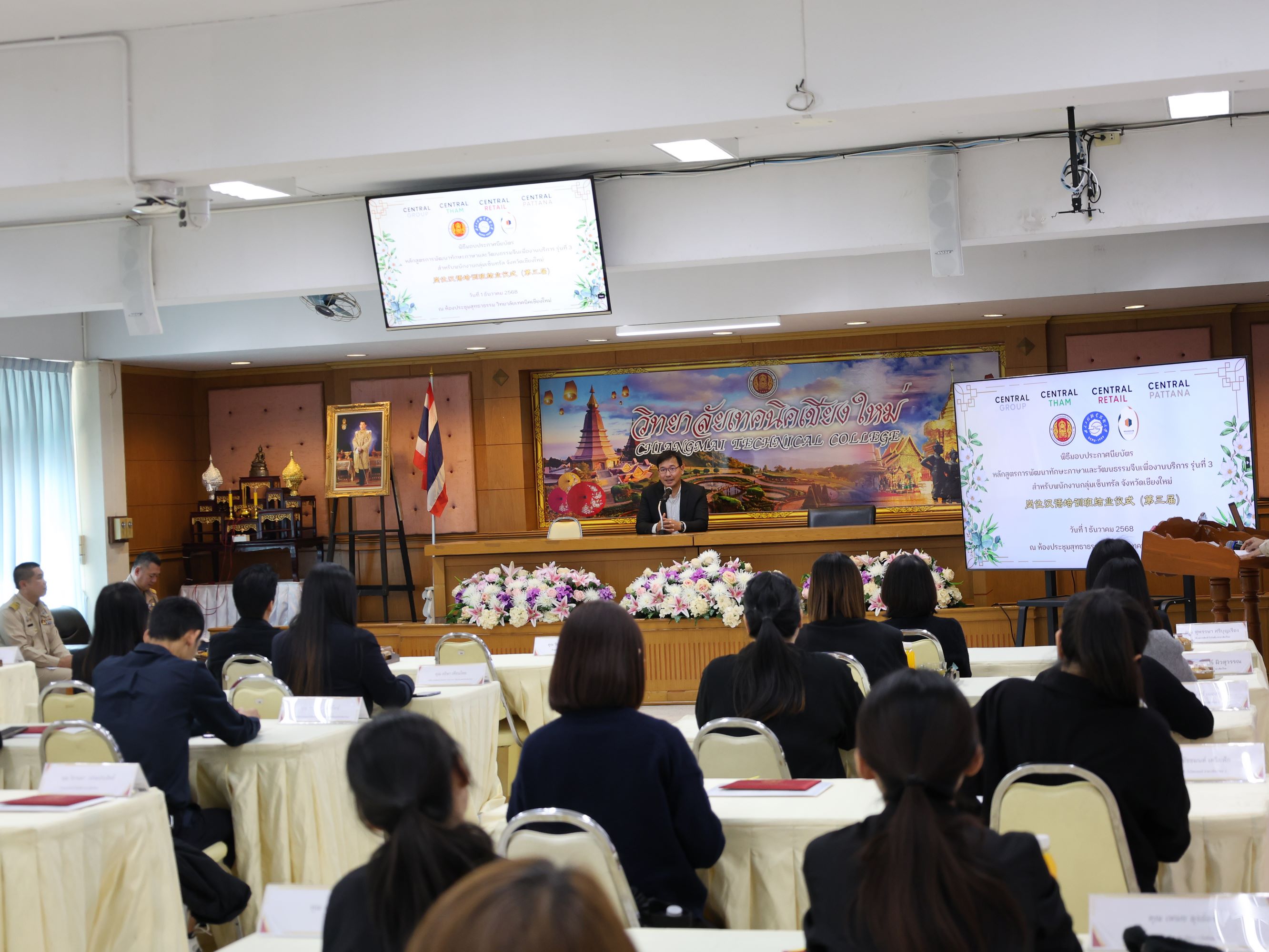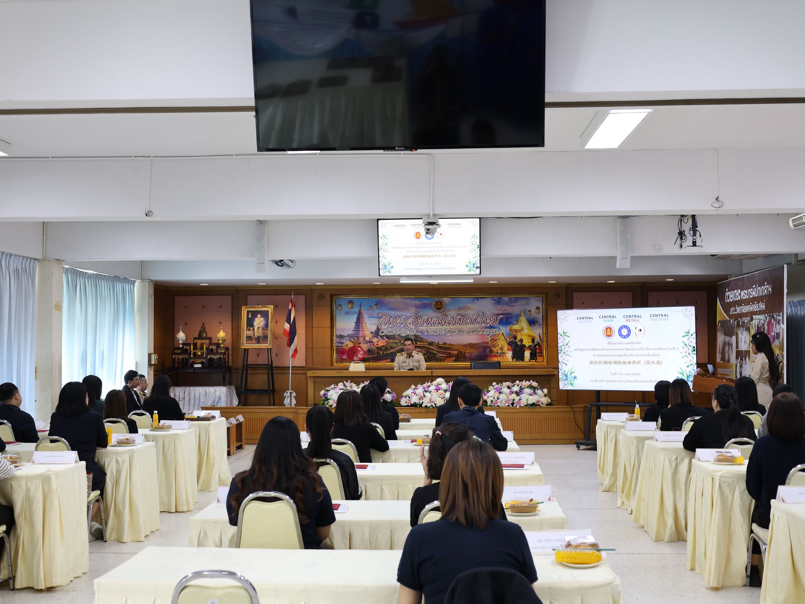 ทั้งนี้ได้รับเกียรติจาก คุณศิระ สันติตรานนท์ ผู้อำนวยการศูนย์การค้า เซ็นทรัล เชียงใหม่ แอร์พอร์ตเป็นตัวแทนผู้บริหารระดับสูงกลุ่มบริษัทเซ็นทรัลมอบเกียรติบัตรให้กับผู้สำเร็จหลักสูตรการอบรมฯ พร้อมกล่าวแสดงความยินดี และแนวทางการพัฒนาศักยภาพของพนักงานร่วมกับวิทยาลัยเทคนิคเชียงใหม่ในอนาคตต่อไป
