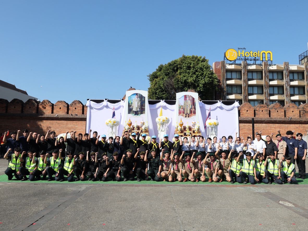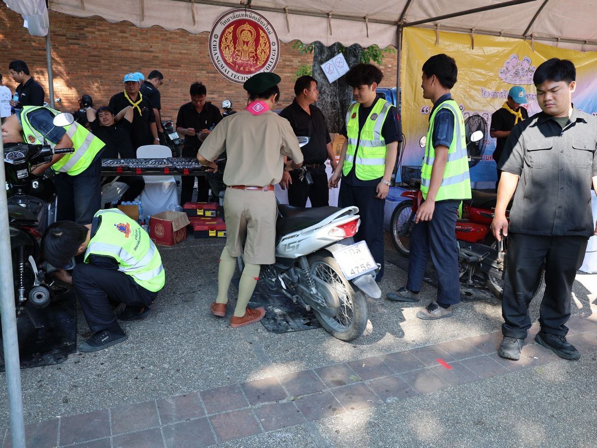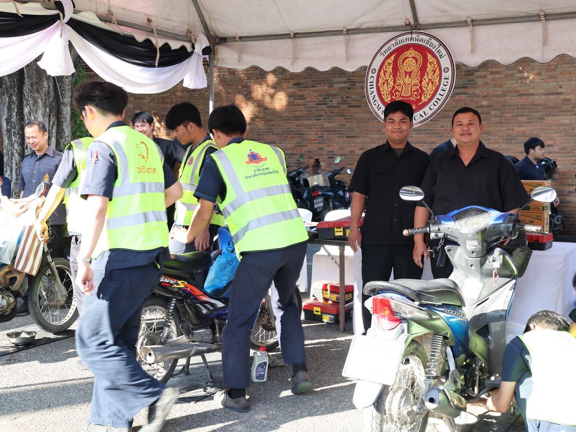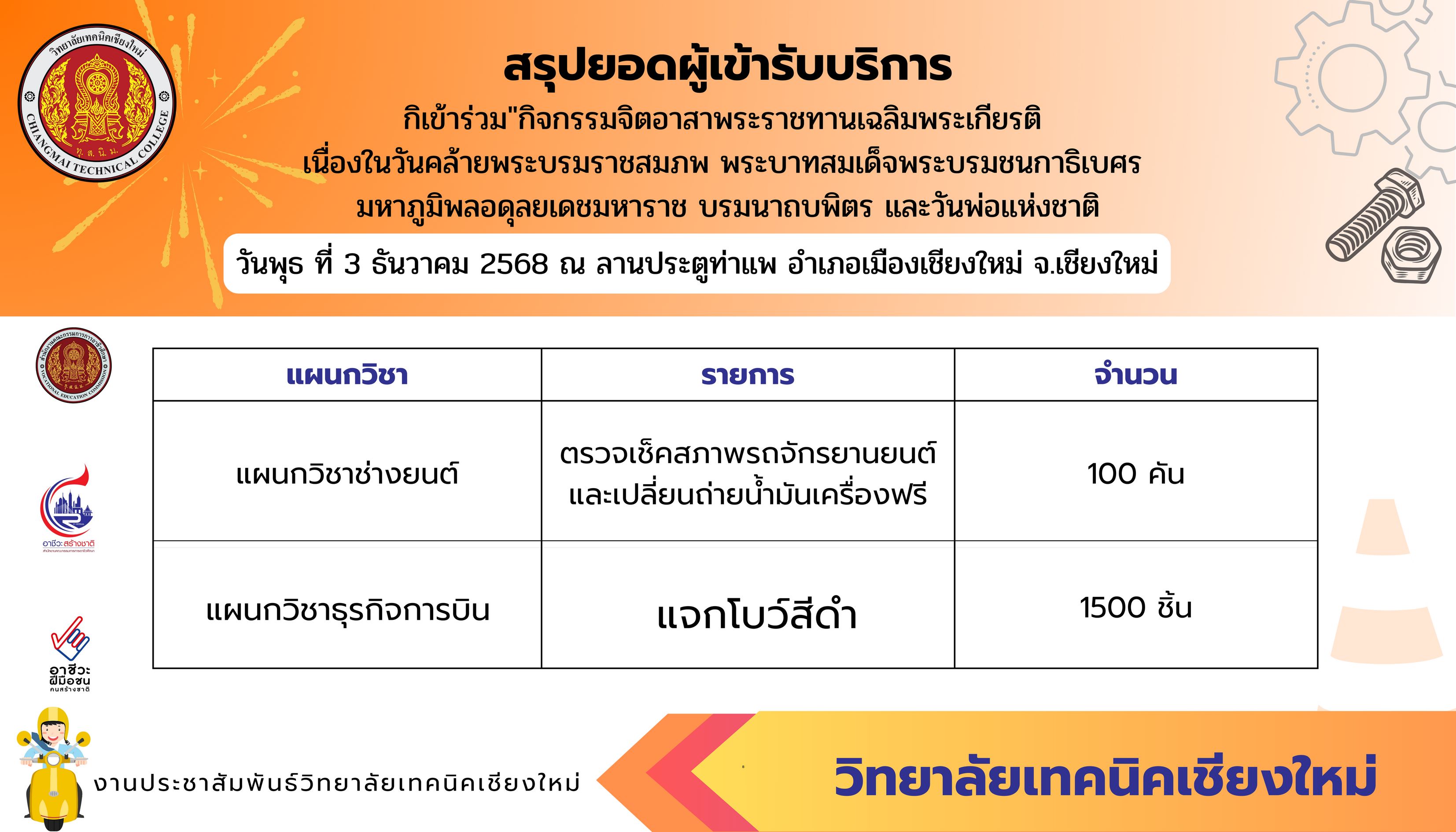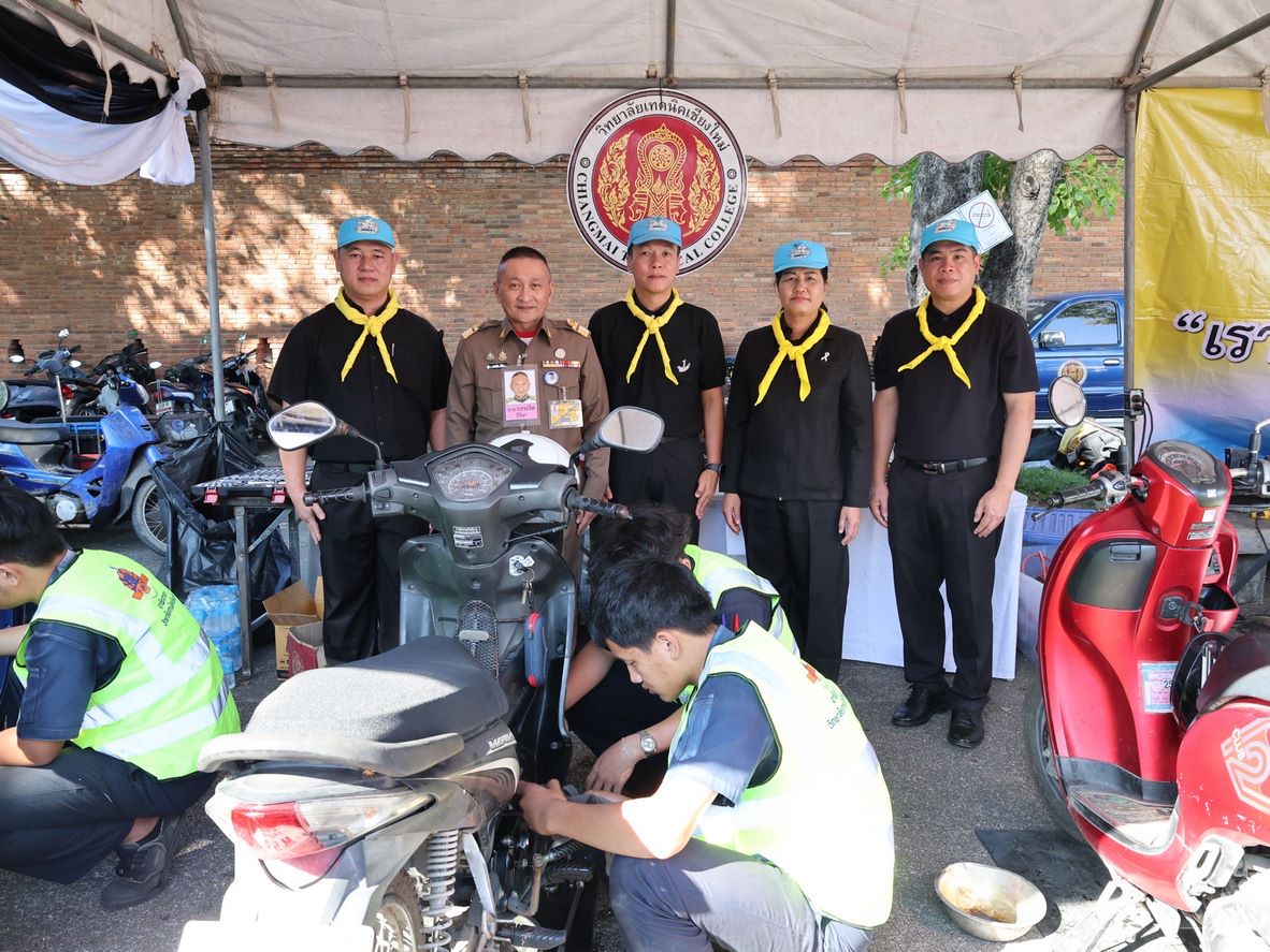 ดร.วัชรพงศ์ ฝั้นติ๊บ ผู้อำนวยการวิทยาลัยเทคนิคเชียงใหม่ ปฏิบัติหน้าที่ผู้อำนวยการสำนักงานอาชีวศึกษาจังหวัดเชียงใหม่ และรักษาการในตำแหน่งที่ปรึกษาด้านนโยบายและแผน สำนักงานคณะกรรมการการอาชีวศึกษา มอบหมาย นายชรันต์ยุทธ์ บุญยง รองผู้อำนวยการฝ่ายบริหารทรัพยากร นางเสาวคนธ์ บุญญประภา รองผู้อำนวยการฝ่ายวิชาการ ปฏิบัติหน้าที่เลขานุการสำนักงานอาชีวศึกษาจังหวัดเชียงใหม่ นายสุจินต์ วังใหม่ รองผู้อำนวยการฝ่ายพัฒนากิจการนักเรียนนักศึกษา นางศศิกาญจน์ เรือนศาสตร์ รองผู้อำนวยการฝ่ายแผนงานและความร่วมมือ หัวหน้างานโครงการพิเศษฯ คณะครู และนักเรียน นักศึกษา แผนกวิชาช่างยนต์ แผนกวิชาธุรกิจการบิน ลูกเสือวิสามัญ และนักศึกษาวิชาทหาร วิทยาลัยเทคนิคเชียงใหม่ เข้าร่วม"กิจกรรมจิตอาสาพระราชทานเฉลิมพระเกียรติ เนื่องในวันคล้ายพระบรมราชสมภพ พระบาทสมเด็จพระบรมชนกาธิเบศร มหาภูมิพลอดุลยเดชมหาราช บรมนาถบพิตร และวันพ่อแห่งชาติ 5 ธันวาคม 2568 ณ ลานประตูท่าแพ อำเภอเมือง จังหวัดเชียงใหม่