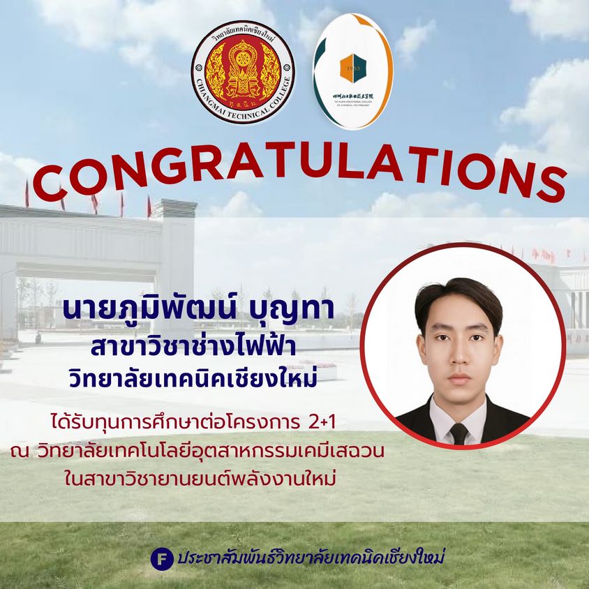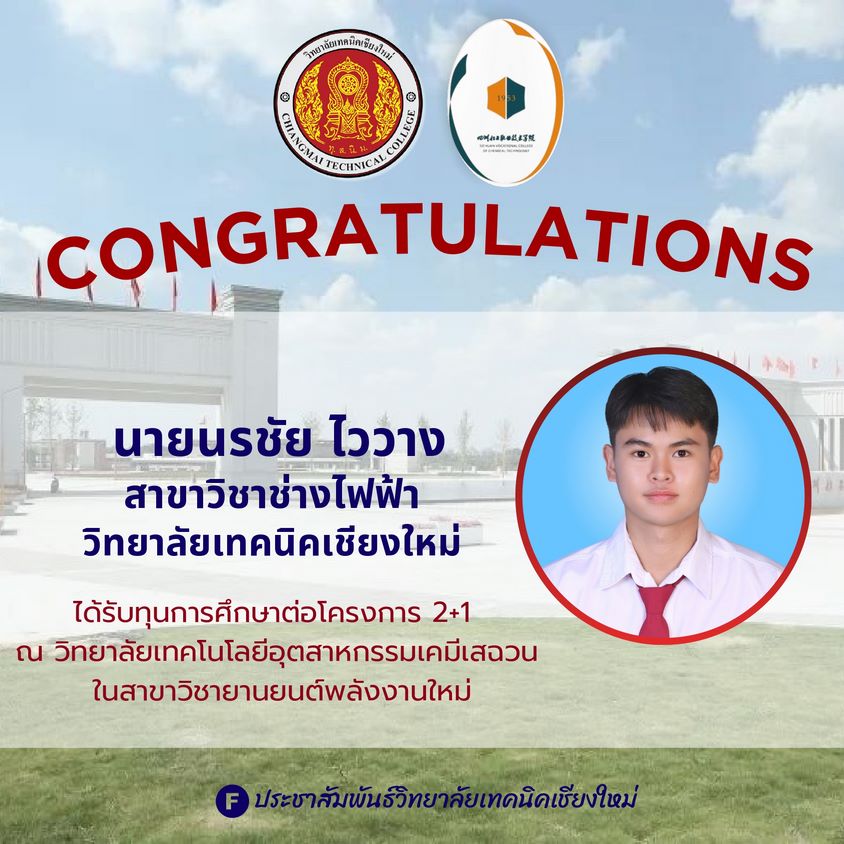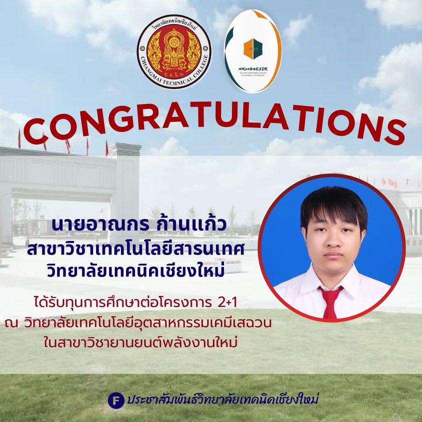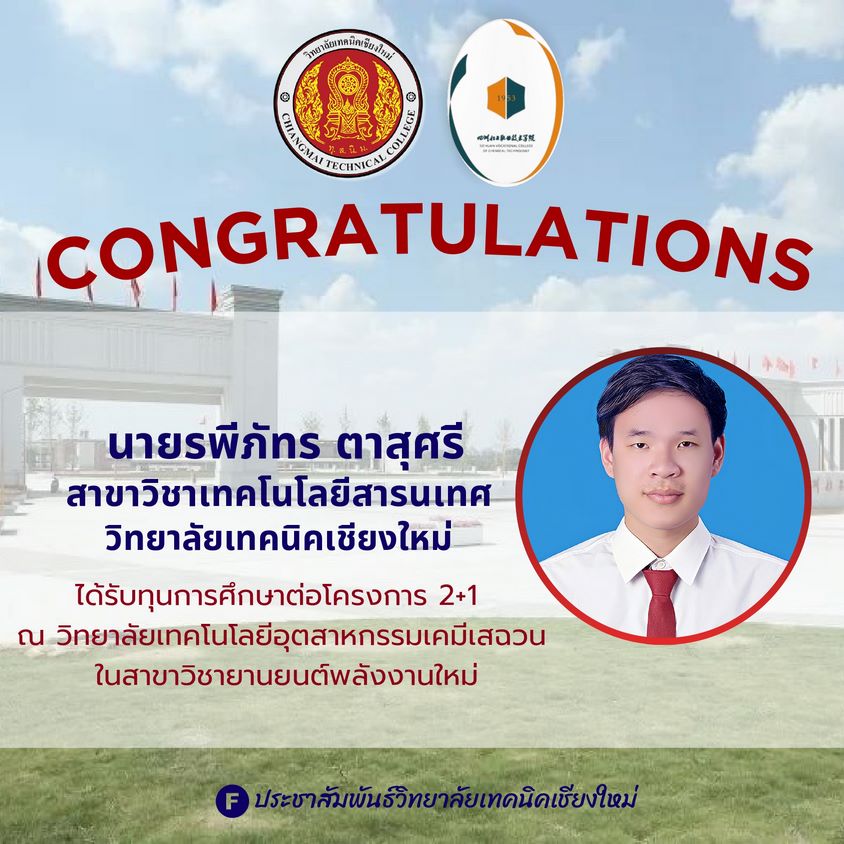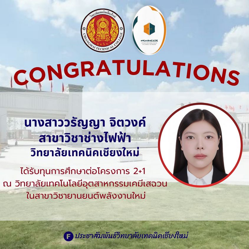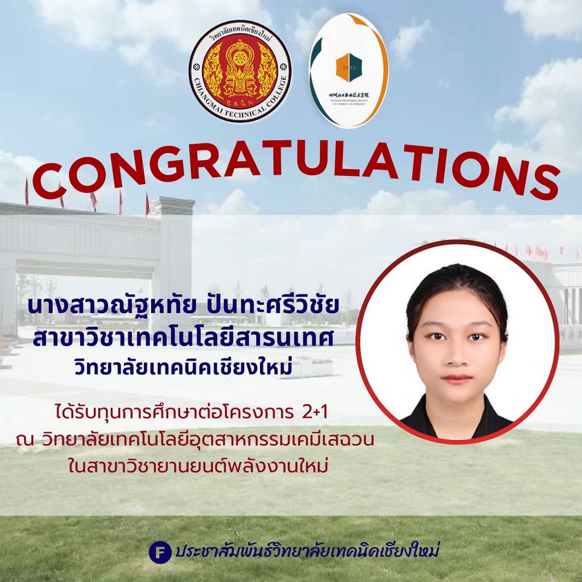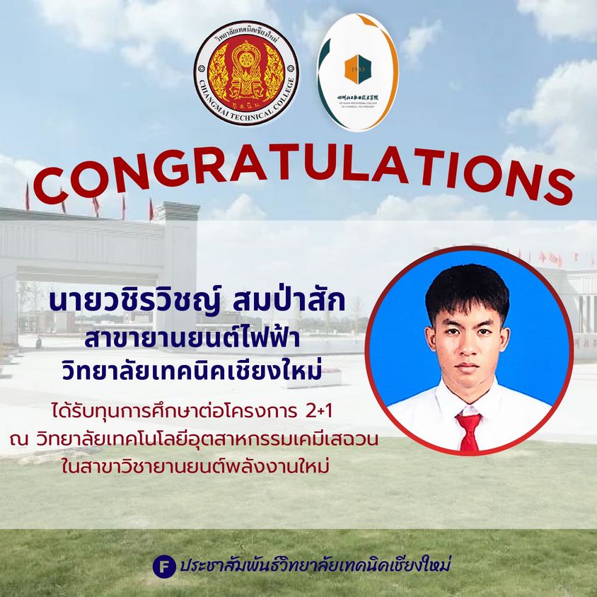 วิทยาลัยเทคนิคเชียงใหม่ ขอแสดงความยินดีกับ นักศึกษา ที่ได้รับทุนการศึกษา โครงการ 2+1 ประจำปีการศึกษา 2568 โดยนักศึกษาของวิทยาลัยผ่านการคัดเลือกและสอบผ่านมาตรฐานภาษาจีน HSK ระดับ 2 จนได้รับทุนศึกษาต่อ ณ วิทยาลัยเทคโนโลยีอุตสาหกรรมเคมีเสฉวน (Sichuan Chemical Technical College) ในสาขา ยานยนต์พลังงานใหม่ (New Energy Vehicle)