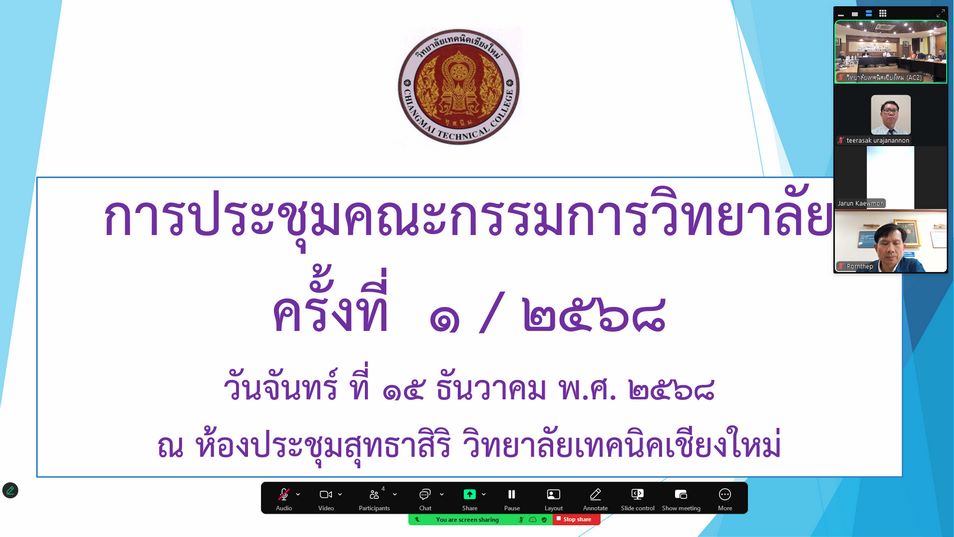 ดร.วัชรพงศ์ ฝั้นติ๊บ ผู้อำนวยการวิทยาลัยเทคนิคเชียงใหม่ ปฏิบัติหน้าที่ผู้อำนวยการสำนักงานอาชีวศึกษาจังหวัดเชียงใหม่ และรักษาการในตำแหน่งที่ปรึกษาด้านนโยบายและแผน สำนักงานคณะกรรมการการอาชีวศึกษา พร้อมด้วยคณะผู้บริหารวิทยาลัยเทคนิคเชียงใหม่ กรรมการผู้แทนครู กรรมการผู้แทนผู้ปกครอง กรรมการผู้แทนองค์กรชุมชน กรรมการผู้แทนองค์กรปกครองส่วนท้องถิ่น กรรมการผู้แทนศิษย์เก่า กรรมการผู้แทนพระภิกษุสงฆ์ กรรมการผู้แทนสถานประกอบการ กรรมการผู้ทรงคุณวุฒิ และคณะดำเนินงานฯ วิทยาลัยเทคนิคเชียงใหม่ เข้าร่วมประชุมคณะกรรมการวิทยาลัยเทคนิคเชียงใหม่ ณ ห้องประชุมสุทธาสิริ วิทยาลัยเทคนิคเชียงใหม่