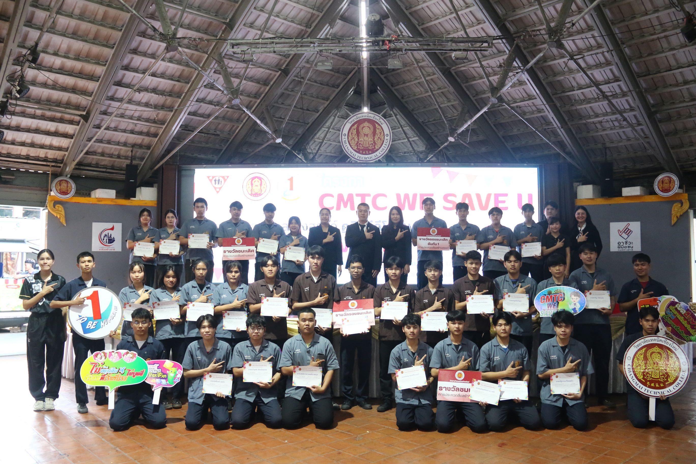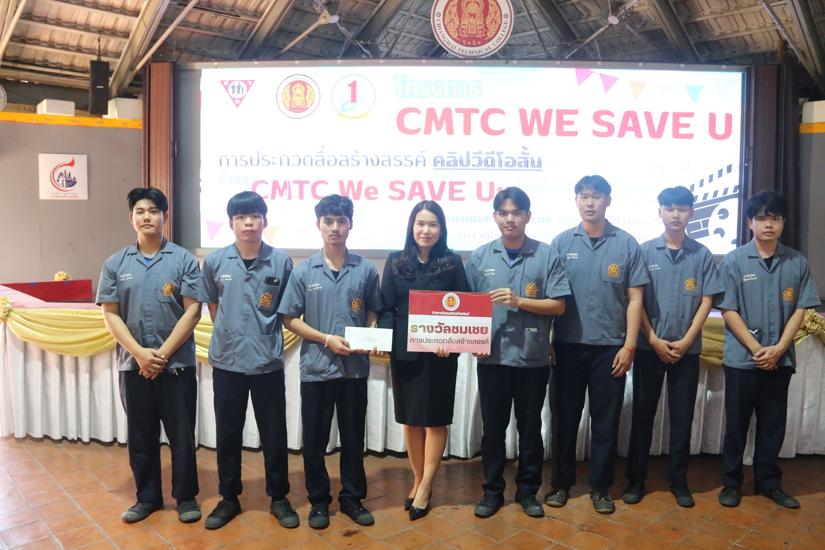 ดร.วัชรพงศ์ ฝั้นติ๊บ ผู้อำนวยการวิทยาลัยเทคนิคเชียงใหม่ ปฏิบัติหน้าที่ผู้อำนวยการสำนักงานอาชีวศึกษาจังหวัดเชียงใหม่ และรักษาการในตำแหน่งที่ปรึกษาด้านนโยบายและแผน สำนักงานคณะกรรมการการอาชีวศึกษา มอบหมายให้ นายสุจินต์ วังใหม่ รองผู้อำนวยการฝ่ายพัฒนากิจการนักเรียน นักศึกษา นางเสาวคนธ์ บุญญประภา รองผู้อำนวยการฝ่ายวิชาการ นางศศิกาญจน์ เรือนศาสตร์ รองผู้อำนวยการฝ่ายแผนงานและความร่วมมือ มอบเกียรติบัตร ให้กับนักเรียน นักศึกษา ที่ได้รับรางวัล ประเภทรางวัล ประกวดสื่อสร้างสรรค์ คลิปวีดีโอสั้น ในหัวข้อ"CMTC We SAVE U : ส่งเสริมการดูแลกายและใจเพื่อเพศปลอดภัยและสุขภาพจิตที่ดีในสถานศึกษา” ประจำปีการศึกษา 2568 ซึ่งมีทุนการศึกษารวม 5,000 บาท พร้อมประกาศนียบัตร พร้อมด้วยนายอุกฤษฎ์ สิงห์แก้ว หัวหน้างานสวัสดิการนักเรียน และคณะดำเนินงานเข้าร่วมฯ