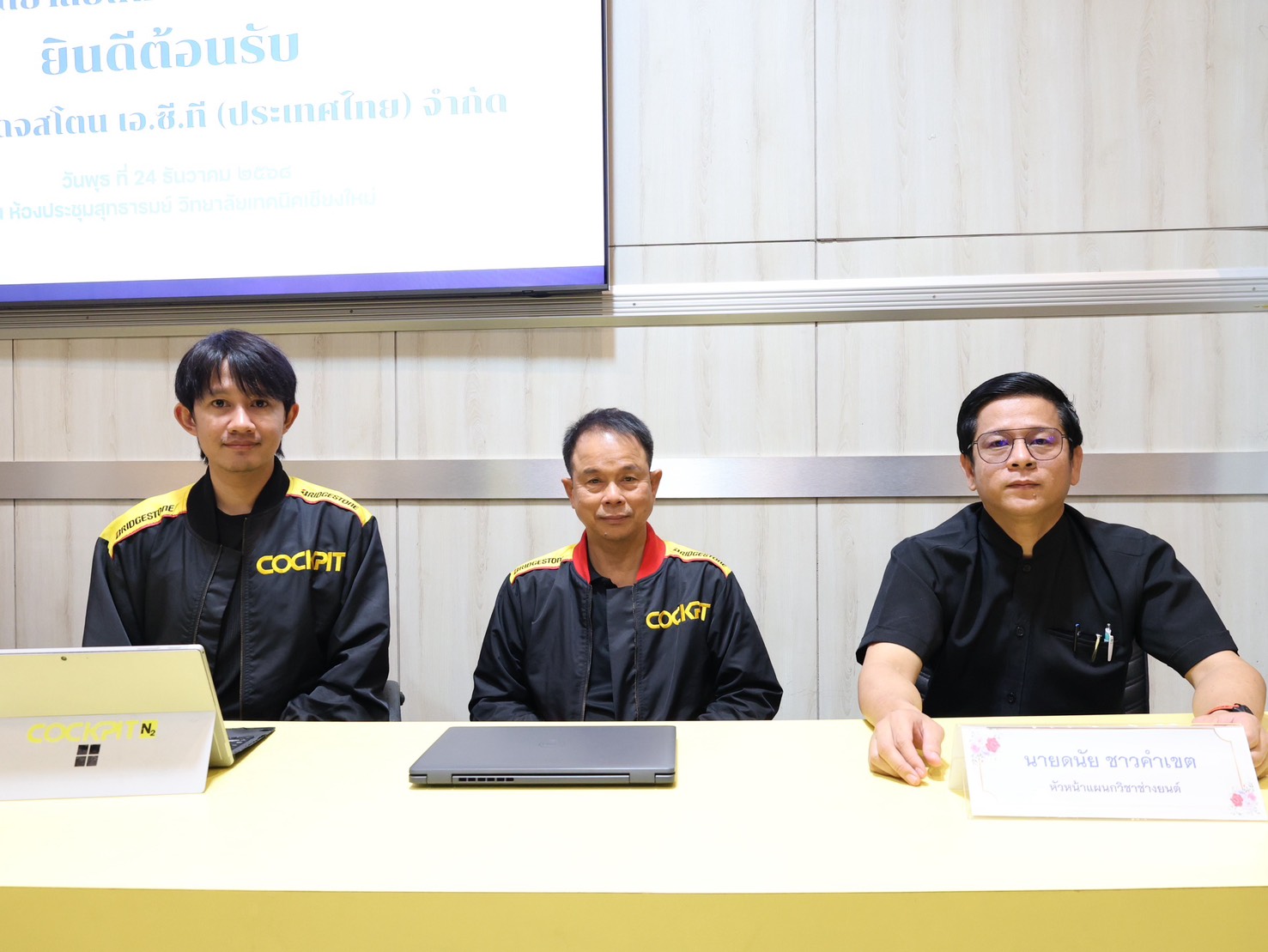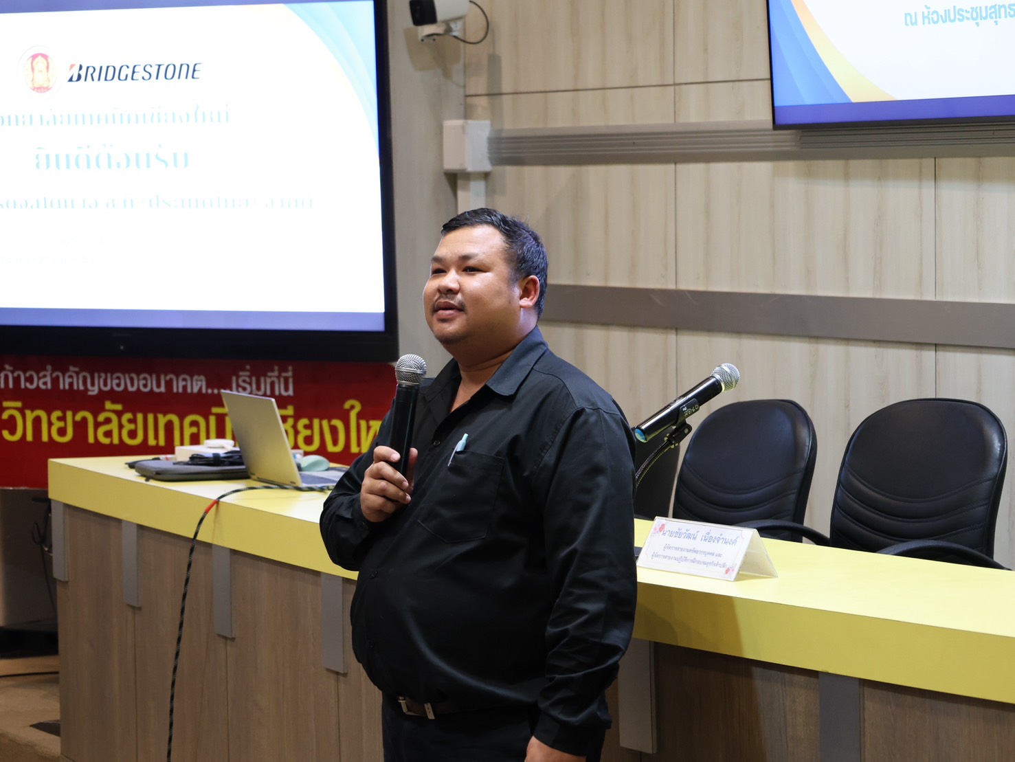 ดร.วัชรพงศ์ ฝั้นติ๊บ ผู้อำนวยการวิทยาลัยเทคนิคเชียงใหม่ ปฏิบัติหน้าที่ผู้อำนวยการสำนักงานอาชีวศึกษาจังหวัดเชียงใหม่ และรักษาการในตำแหน่งที่ปรึกษาด้านนโยบายและแผน สำนักงานคณะกรรมการการอาชีวศึกษา มอบหมายให้ นายดนัย ชาวคำเขต หัวหน้าแผนกวิชาช่างยนต์ พร้อมด้วยคณะครู และนักเรียน นักศึกษา แผนกวิชาช่างยนต์ วิทยาลัยเทคนิคเชียงใหม่ ให้การต้อนรับคณะผู้แทนจากบริษัท บริดจสโตน เอ.ซี.ที (ประเทศไทย) จำกัด นำโดย1.นายชัยวัฒน์ เนื่องจำนงค์ ผู้จัดการสายงานทรัพยากรบุคคล และ
