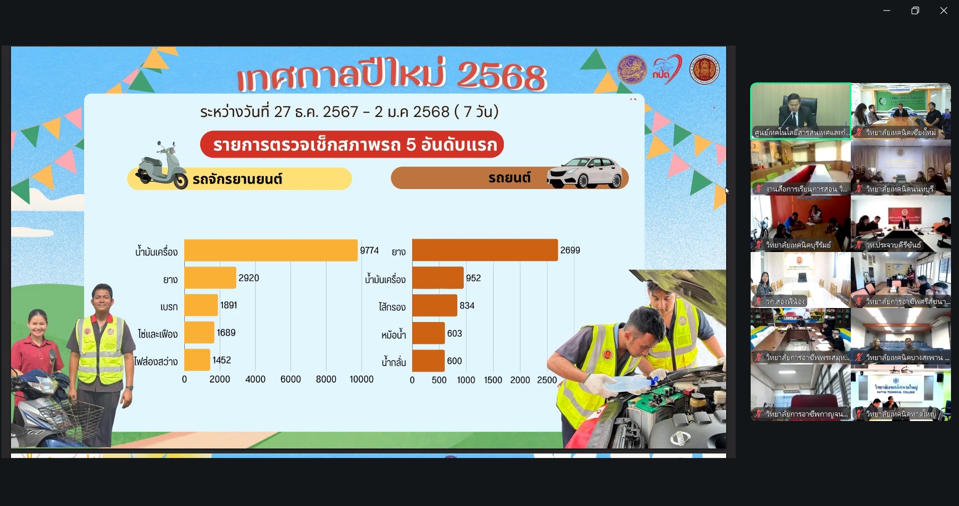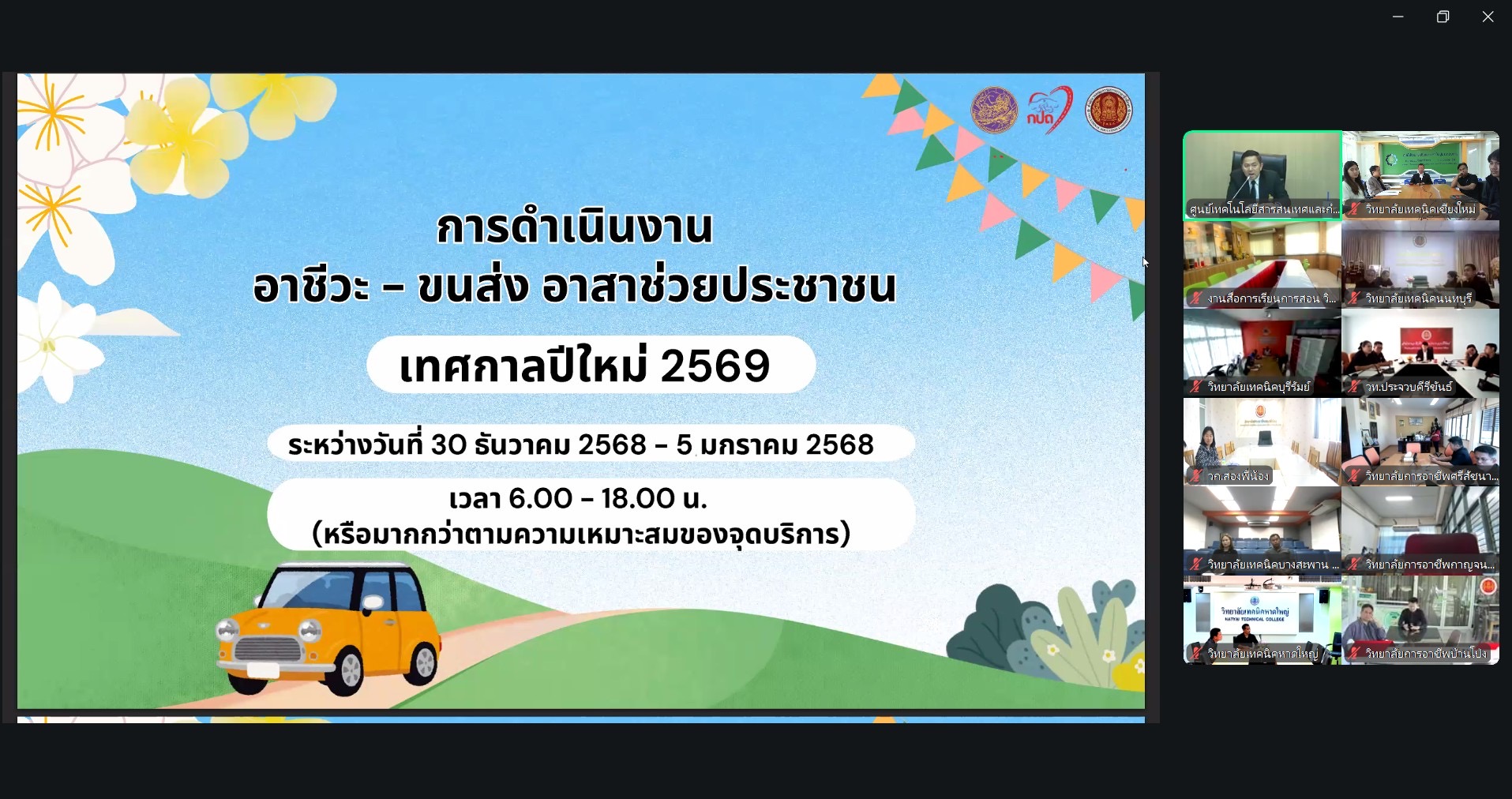 ดร.วัชรพงศ์ ฝั้นติ๊บ ผู้อำนวยการวิทยาลัยเทคนิคเชียงใหม่ ปฏิบัติหน้าที่ผู้อำนวยการสำนักงานอาชีวศึกษาจังหวัดเชียงใหม่ และรักษาการในตำแหน่งที่ปรึกษาด้านนโยบายและแผน สำนักงานคณะกรรมการการอาชีวศึกษา มอบหมายให้นายสุจินต์ วังใหม่ รองผู้อำนวยการฝ่ายพัฒนากิจการนักเรียน นักศึกษา นายสิราม ถามดี หัวหน้างานโครงการพิเศษและบริการชุมชน และคณะกรรมการดำเนินงานฯ เข้าร่วมประชุมเตรียมความพร้อมการดำเนินโครงการ อาชีวะ-ขนส่ง อาสาช่วยประชาชน เทศกาลปีใหม่ 2569 เพื่อรับฟังแนวทางการดำเนินโครงการฯ ผ่านระบบ Zoom Meetingณ ห้องประชุม nec วิทยาลัยเทคนิคเชียงใหม่