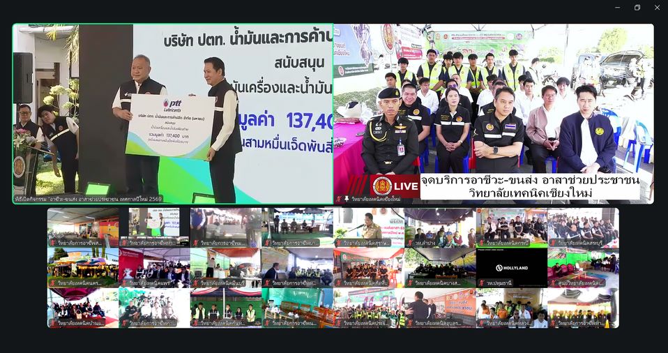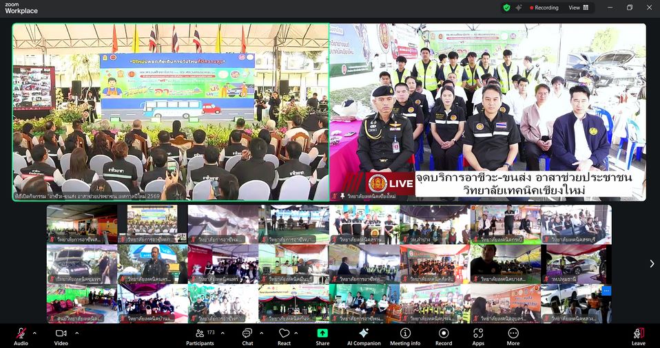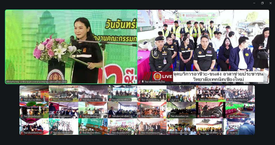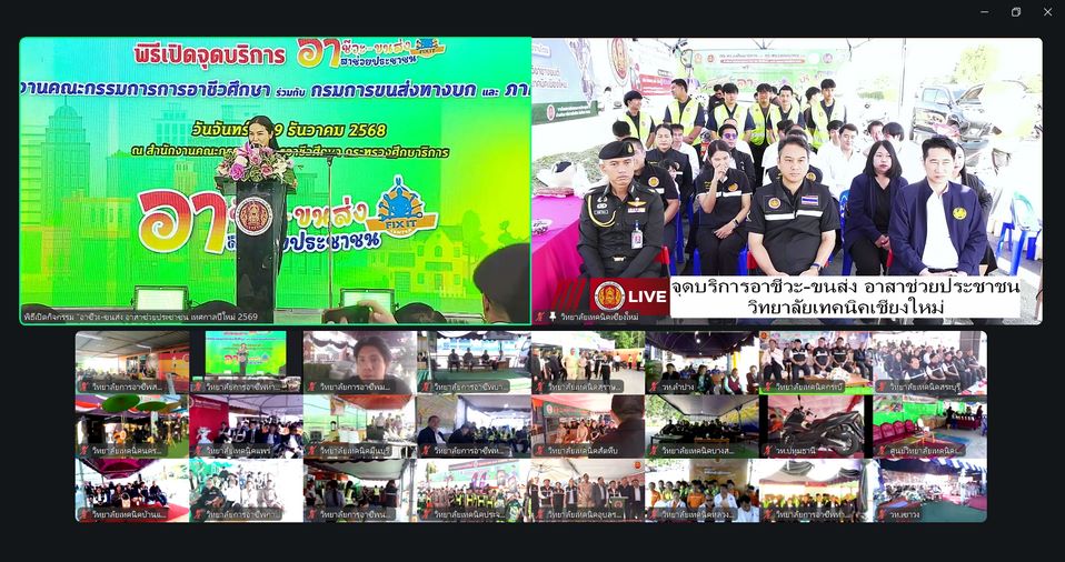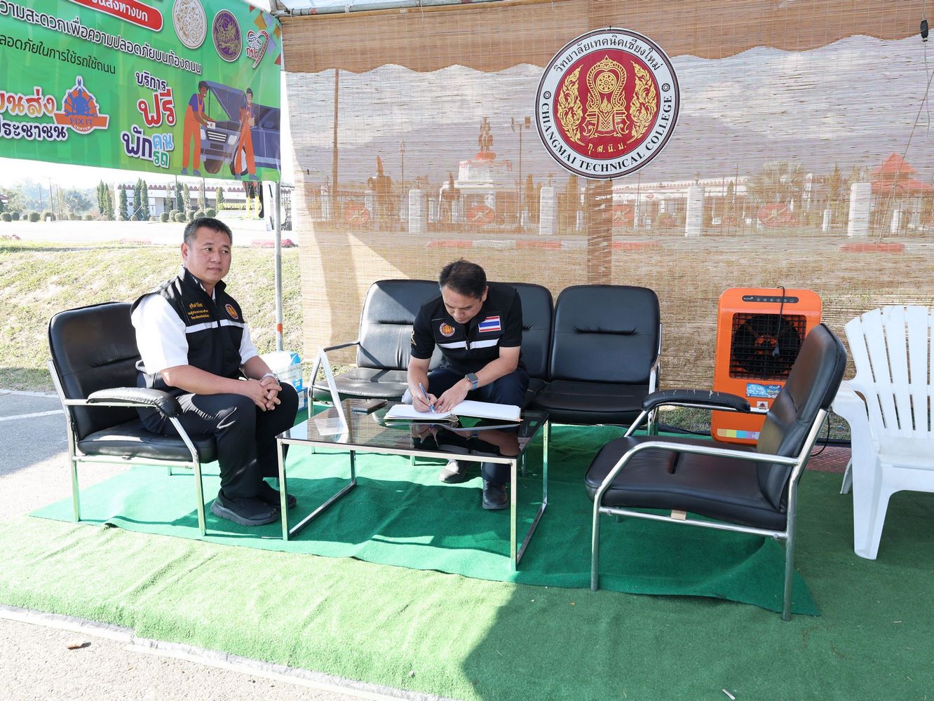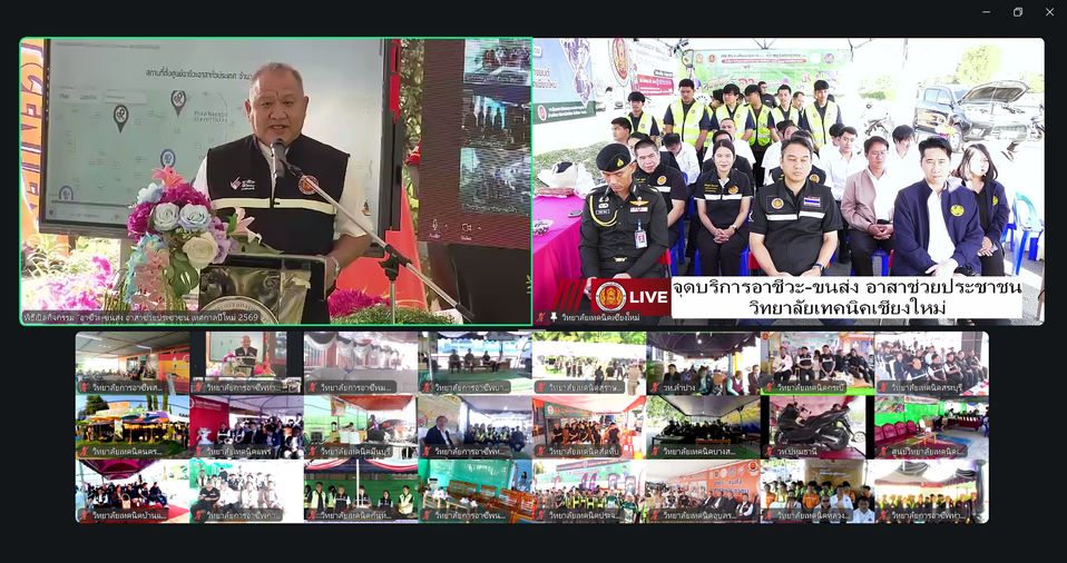 ดร.วัชรพงศ์ ฝั้นติ๊บ ผู้อำนวยการวิทยาลัยเทคนิคเชียงใหม่ ปฏิบัติหน้าที่ผู้อำนวยการสำนักงานอาชีวศึกษาจังหวัดเชียงใหม่ และรักษาการในตำแหน่งที่ปรึกษาด้านนโยบายและแผน สำนักงานคณะกรรมการการอาชีวศึกษา มอบหมาย นายสุรศักดิ์ เทียบรัตน์ ผู้อำนวยการวิทยาลัยเกษตรและเทคโนโลยีเชียงใหม่ ปฏิบัติหน้าที่รองผู้อำนวยการสำนักงานอาชีวศึกษาจังหวัดเชียงใหม่ พร้อมด้วยนายปิยะ โยมา รองอธิบดีกรมการขนส่งทางบก พร้อมด้วยคณะผู้บริหาร คณะครู นักเรียน นักศึกษา แผนกวิชาช่างยนต์ ทีมงานสื่อ ทีมงานโครงการพิเศษและการบริการชุมชน วิทยาลัยเทคนิคเชียงใหม่ เข้าร่วมพิธีแถลงข่าวและถ่ายทอดสดกิจกรรมการจัดกิจกรรมอาชีวะ – ขนส่ง อาสาช่วยประชาชน เทศกาลปีใหม่ พ.ศ. 2569 “ปีใหม่ปลอดภัย เดินทางไปไหนก็มีความสุข” ผ่านระบบ Zoom Meeting จากกระทรวงศึกษาธิการ โดยมีศูนย์อาชีวะอาสาช่วยประชาชนจากสถานศึกษาอาชีวศึกษาทั่วประเทศเข้าร่วมพิธีพร้อมกันทั้งสิ้น 150 จุดบริการ