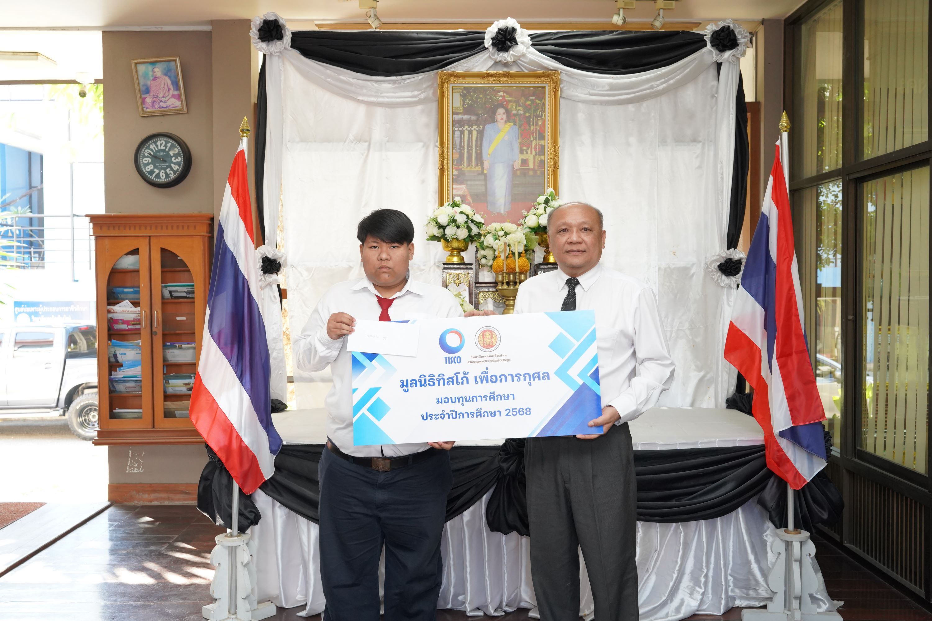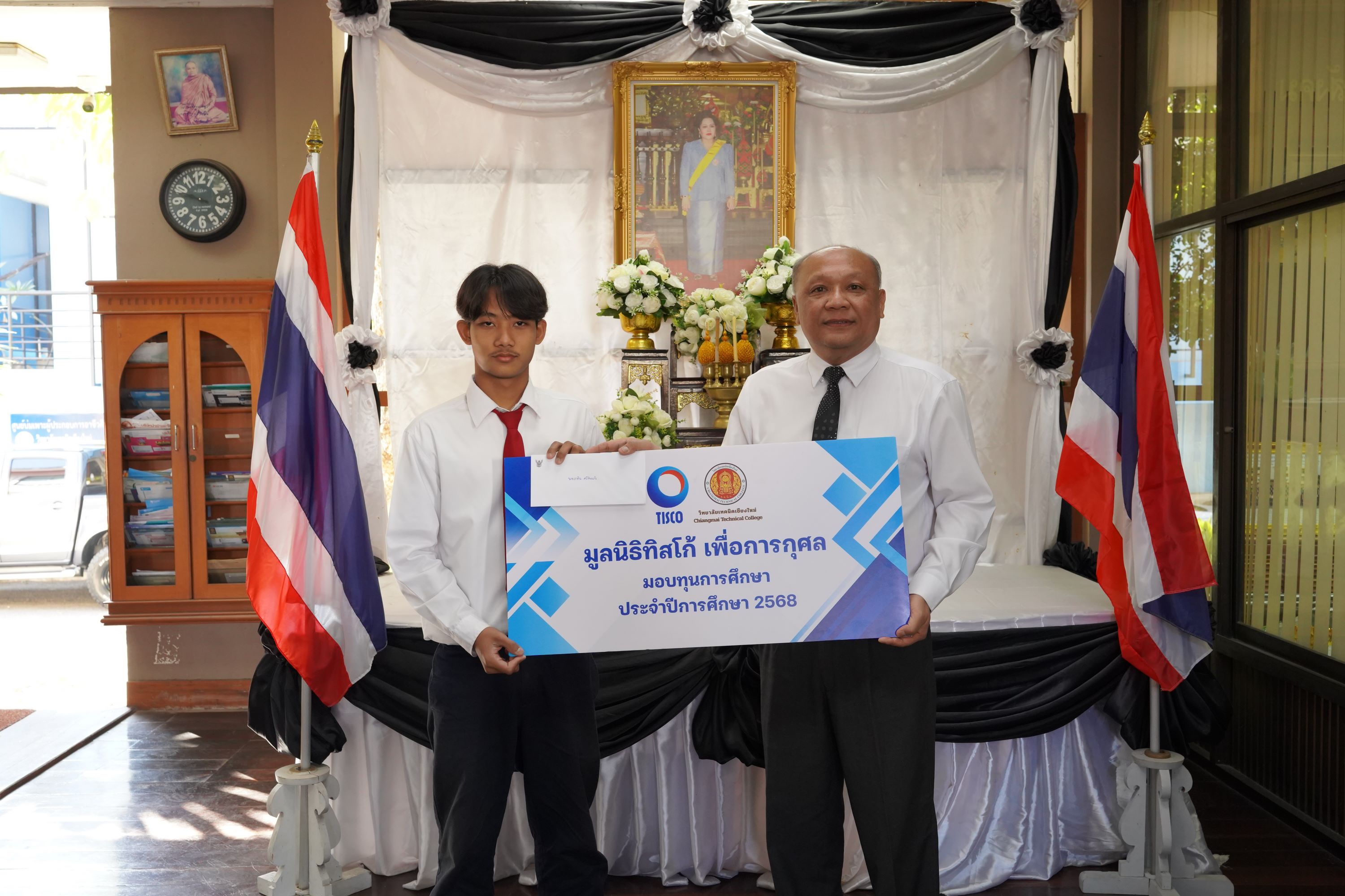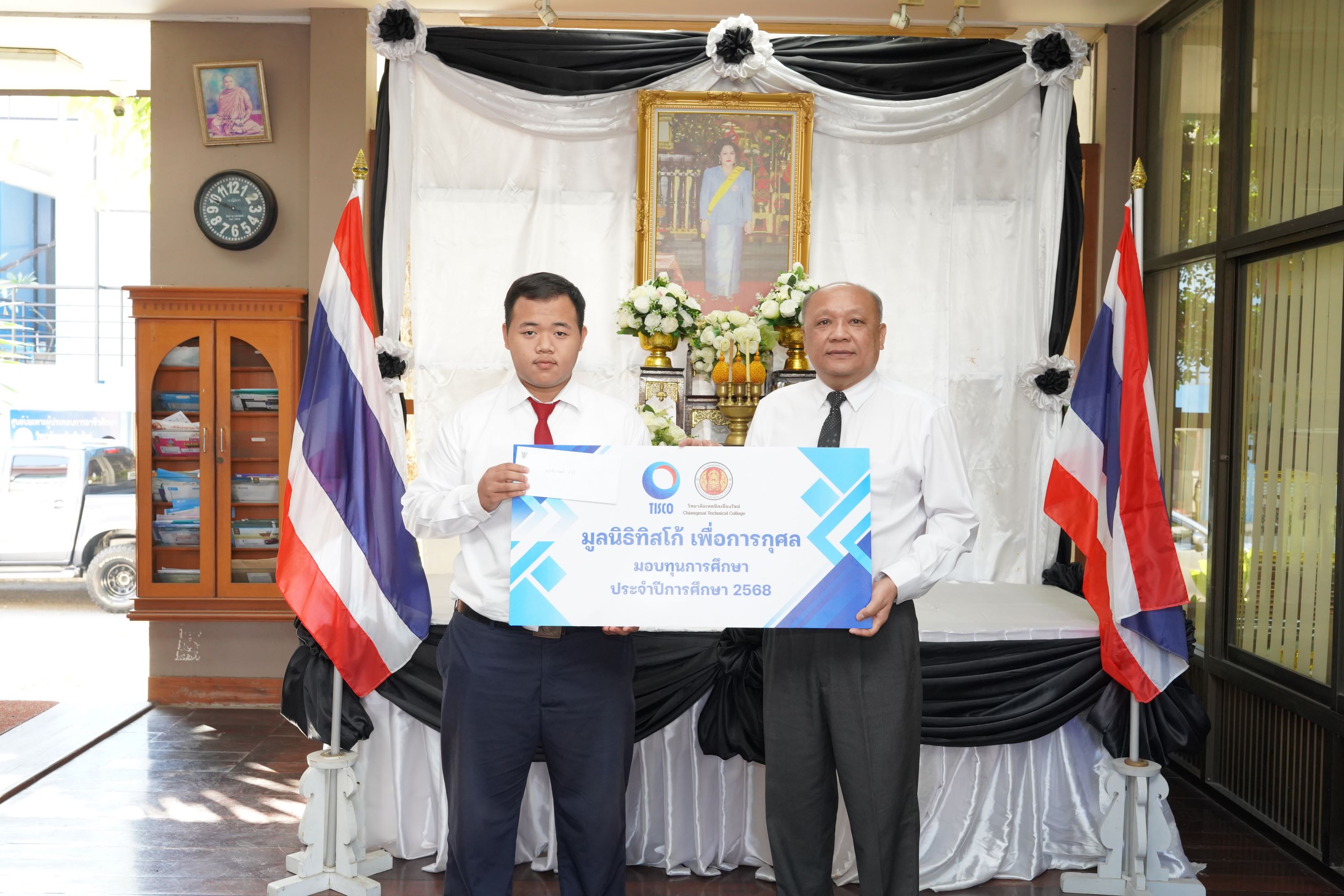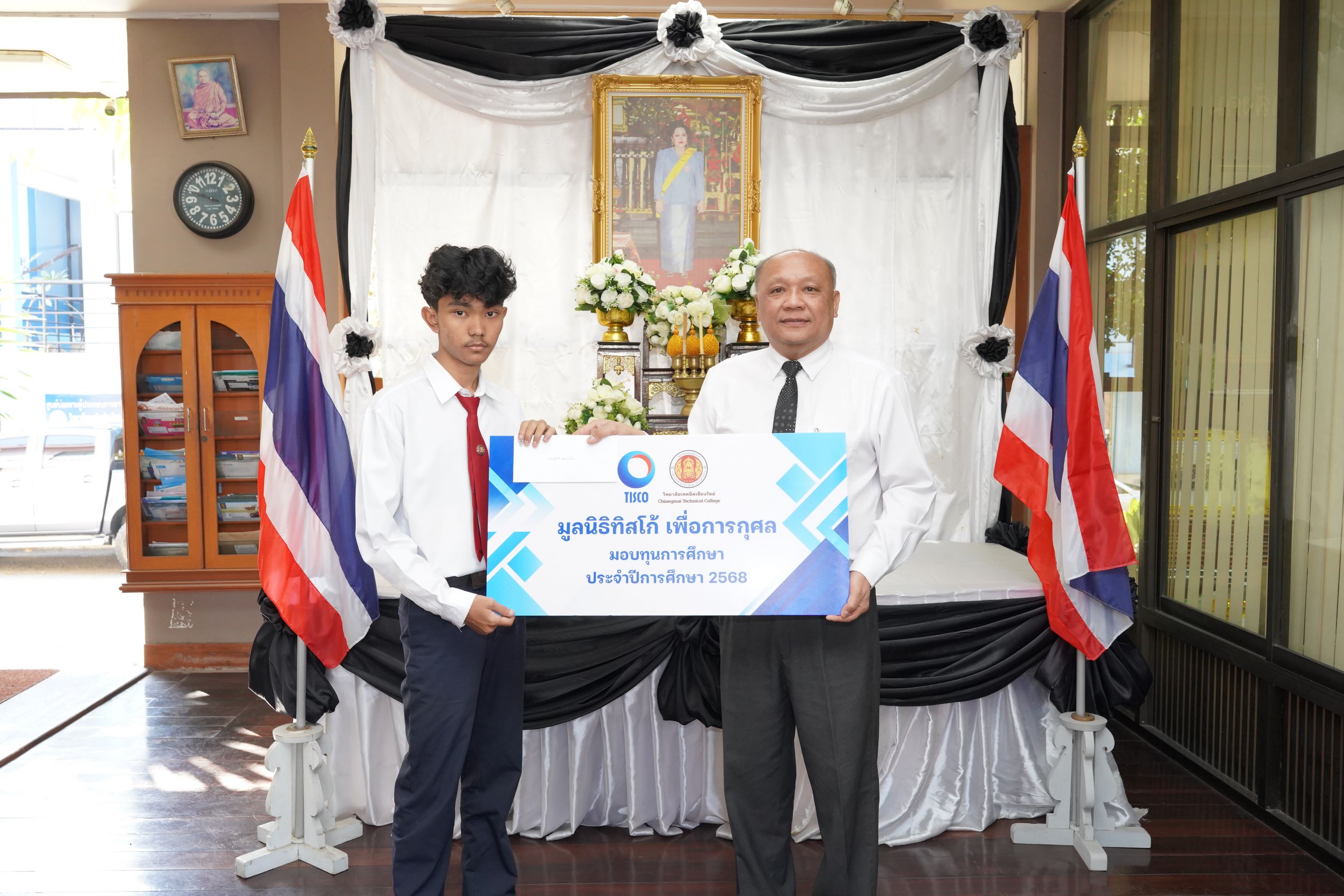 ดร.วัชรพงศ์ ฝั้นติ๊บ ผู้อำนวยการวิทยาลัยเทคนิคเชียงใหม่ ปฏิบัติหน้าที่ผู้อำนวยการสำนักงานอาชีวศึกษาจังหวัดเชียงใหม่ และรักษาการในตำแหน่งที่ปรึกษาด้านนโยบายและแผน สำนักงานคณะกรรมการการอาชีวศึกษา เป็นประธานมอบทุนการศึกษาจาก มูลนิธิทิสโก้ เพื่อการกุศล ให้แก่นักเรียน นักศึกษา วิทยาลัยเทคนิคเชียงใหม่ จำนวนทั้งสิ้น 9 ราย รายละ 7,000 บาท เพื่อเป็นการสนับสนุนและส่งเสริมโอกาสทางการศึกษาแก่ผู้เรียนที่มีความประพฤติดี มีผลการเรียนอยู่ในเกณฑ์ที่เหมาะสม และขาดแคลนทุนทรัพย์ ให้สามารถศึกษาเล่าเรียนจนสำเร็จการศึกษา และพัฒนาศักยภาพของตนเองอย่างเต็มความสามารถ