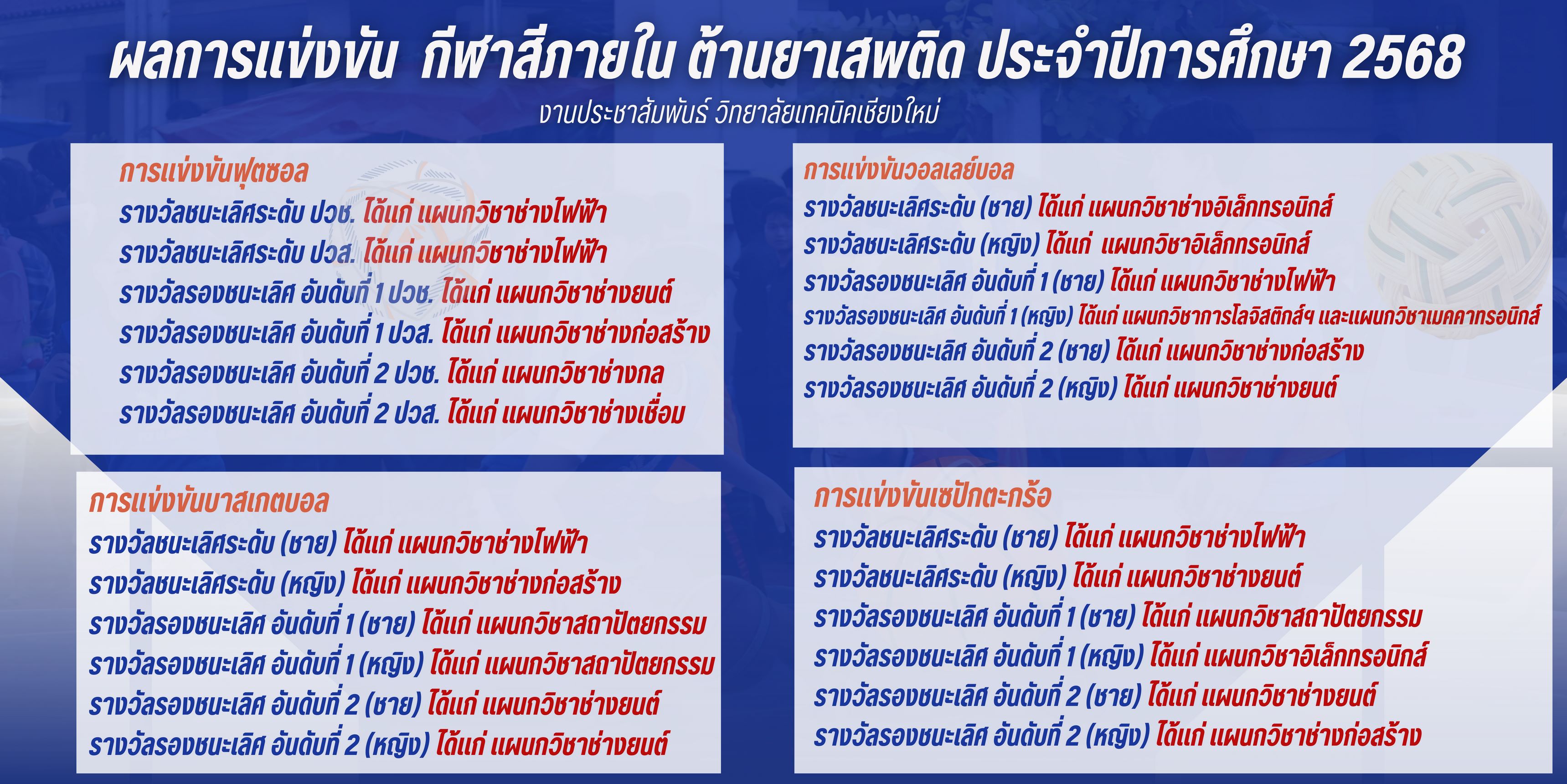 ฟุตซอล: ชนะเลิศ ปวช./ปวส. แผนกวิชาช่างไฟฟ้า | รองฯ อันดับ 1 ปวช. ช่างยนต์ / ปวส. ช่างก่อสร้าง | รองฯ อันดับ 2 ปวช. ช่างกล / ปวส. ช่างเชื่อม