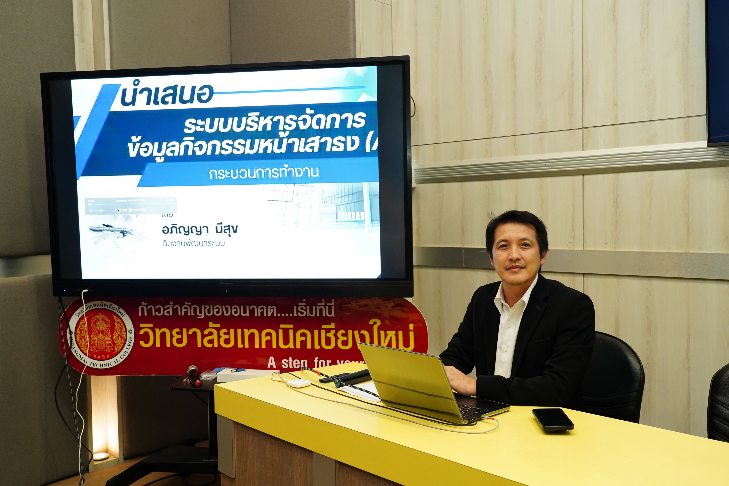 ดร.วัชรพงศ์ ฝั้นติ๊บ ผู้อำนวยการวิทยาลัยเทคนิคเชียงใหม่ ปฏิบัติหน้าที่ผู้อำนวยการสำนักงานอาชีวศึกษาจังหวัดเชียงใหม่ และรักษาการในตำแหน่งที่ปรึกษาด้านนโยบายและแผน สำนักงานคณะกรรมการการอาชีวศึกษา มอบหมายให้ นายสุจินต์ วังใหม่ รองผู้อำนวยการฝ่ายพัฒนากิจการนักเรียน นักศึกษา เป็นประธานใน โครงการประชุมเชิงปฏิบัติการสร้างความเข้าใจการใช้ระบบบริหารจัดการข้อมูลกิจกรรมหน้าเสาธง วิทยาลัยเทคนิคเชียงใหม่ Activities Management System AMS ประจำปีการศึกษา 2568 ซึ่งวัตถุประสงค์การพัฒนาระบบU AMSระบบบริหารจัดการข้อมูลกิจกรรมหน้าเสาธง วิทยาลัยเทคนิคเชียงใหม่เพื่อเป็นการสนับสนุนนโยบายของวิทยาลัยในการส่งเสริมและสร้างวินัยให้ผู้เรียนเข้าร่วมกิจกรรมหน้าเสาธง เพื่อรับรองนโยบายการขับเคลื่อนแผนปฏิบัติการดิจิทัล ตาม พ.ศ. 2568-2570 ยุทธศาสตร์ที่ 2 ซึ่งเน้นการส่งเสริมและสนับสนุนการนำระบบดิจิทัลมาใช้ในการจัดการอาชีวศึกษา พร้อมทั้งเพื่อจัดทำข้อมูลสารสนเทศData Information สำหรับการร่วมกิจกรรมหน้าเสาธงของนักเรียนนักศึกษา วิทยาลัยเทคนิคเชียงใหม่