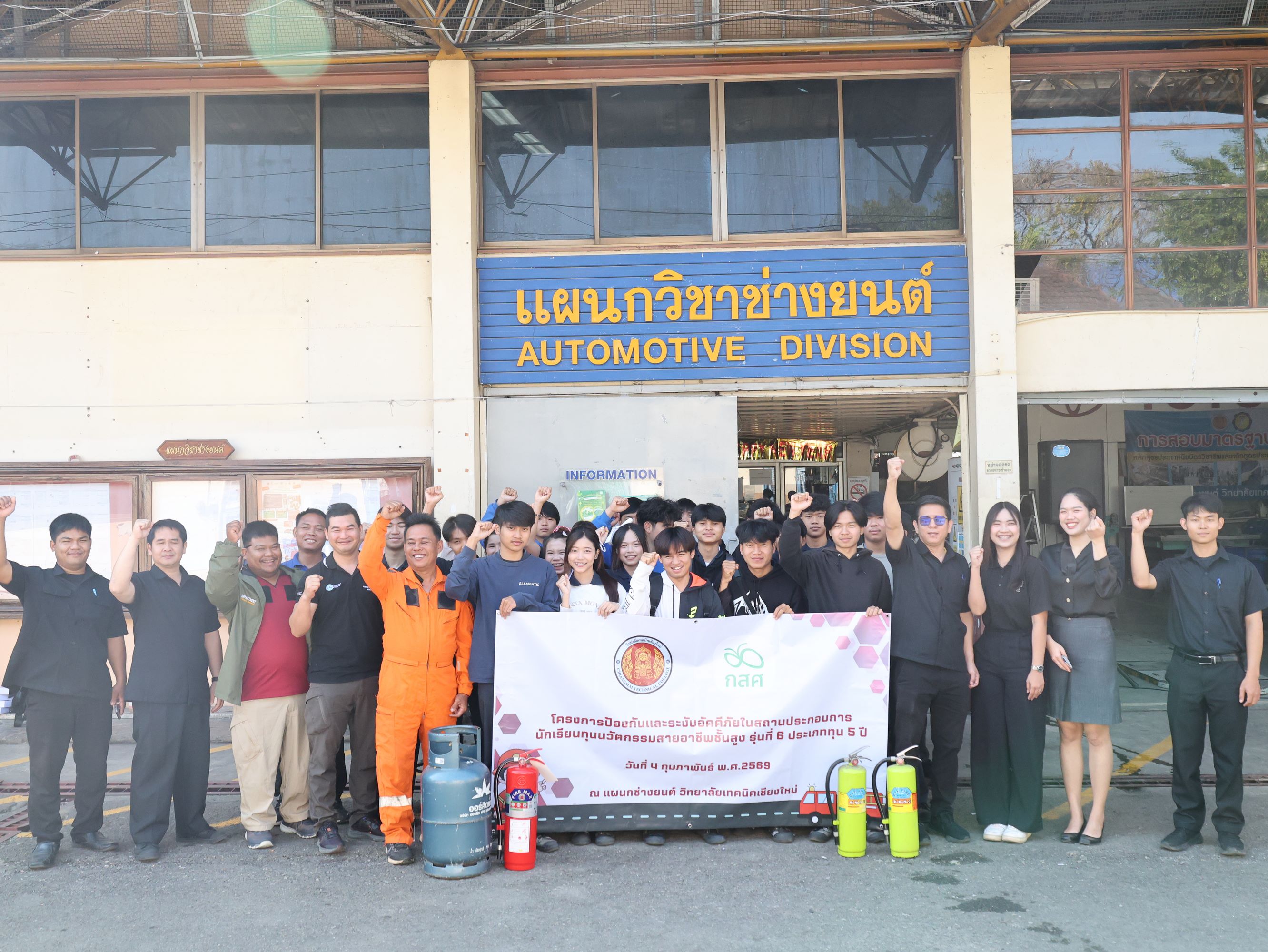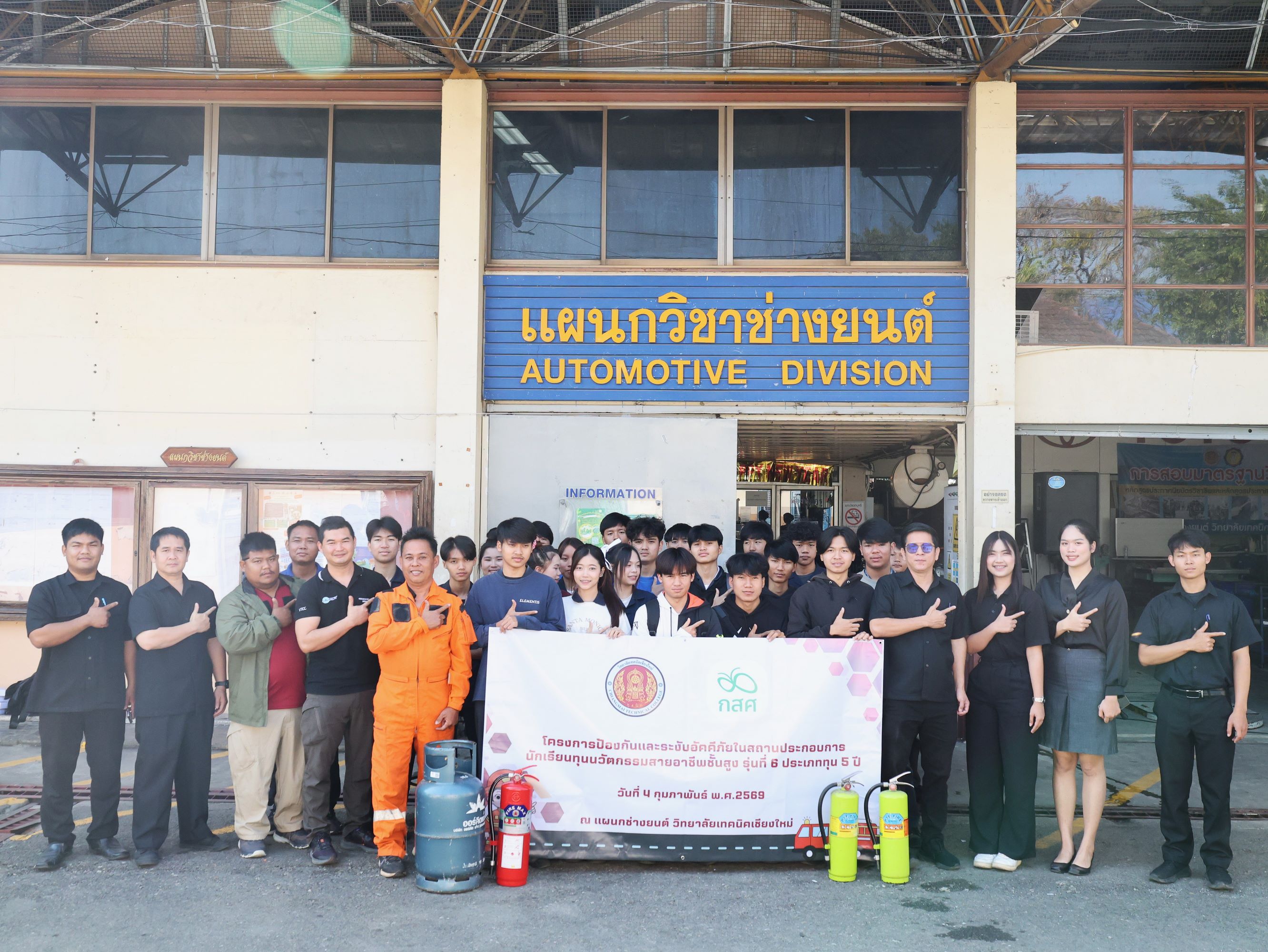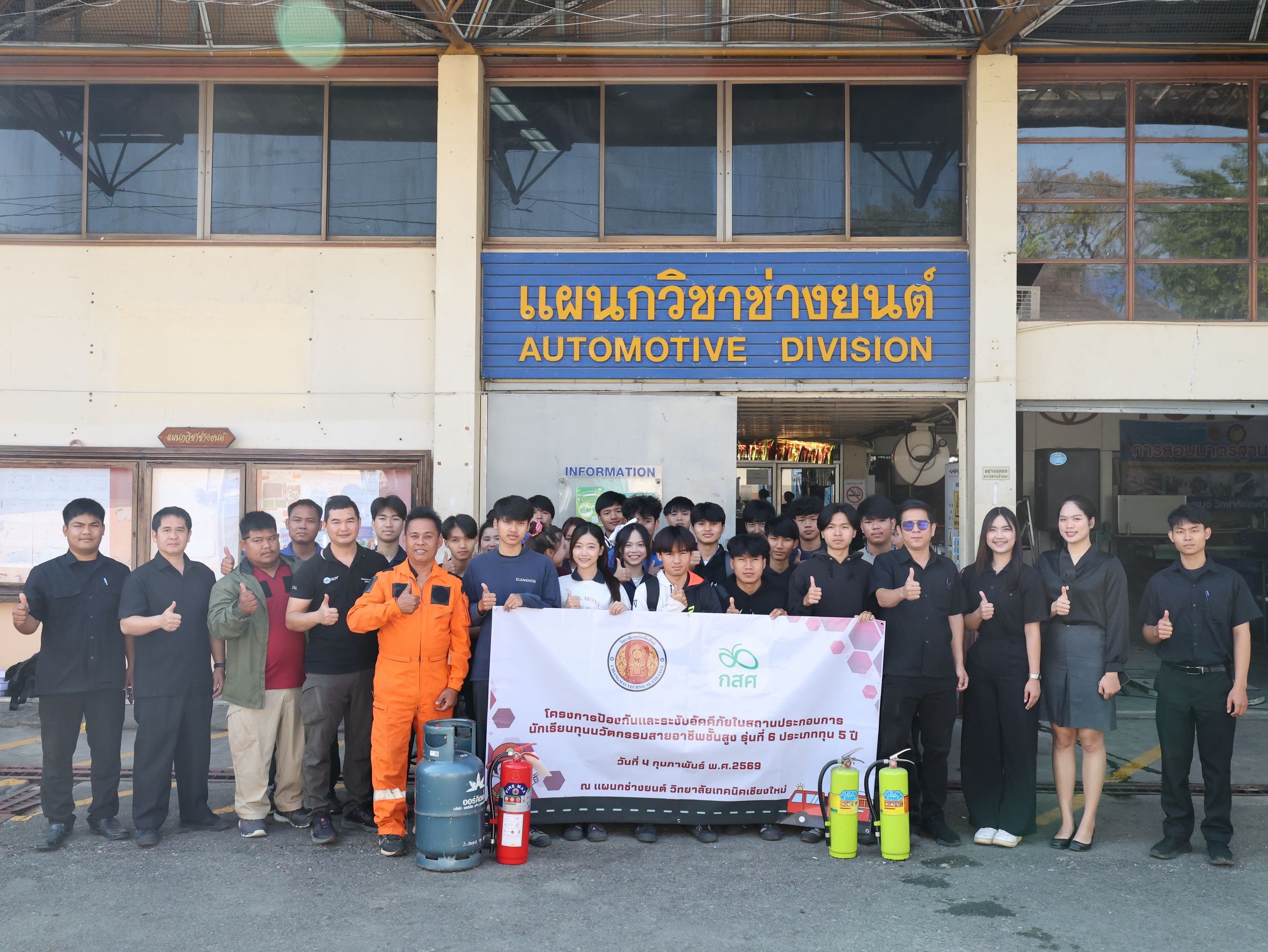 ดร.วัชรพงศ์ ฝั้นติ๊บ ผู้อำนวยการวิทยาลัยเทคนิคเชียงใหม่ ปฏิบัติหน้าที่ผู้อำนวยการสำนักงานอาชีวศึกษาจังหวัดเชียงใหม่ และรักษาการในตำแหน่งที่ปรึกษาด้านนโยบายและแผน สำนักงานคณะกรรมการการอาชีวศึกษา มอบหมายให้ นายดนัย ชาวคำเขต หัวหน้าแผนกวิชาช่างยนต์ พร้อมด้วยคณะครูแผนกวิชาช่างยนต์ และแผนกวิชาช่างอิเล็กทรอนิกส์ นำนักเรียนทุนนวัตกรรมสายอาชีพชั้นสูง รุ่นที่ 6 ประเภททุน 5 ปี ประจำปีการศึกษา 2568 จำนวน 22 คน เข้าร่วม โครงการป้องกันและระงับอัคคีภัยในสถานประกอบการ