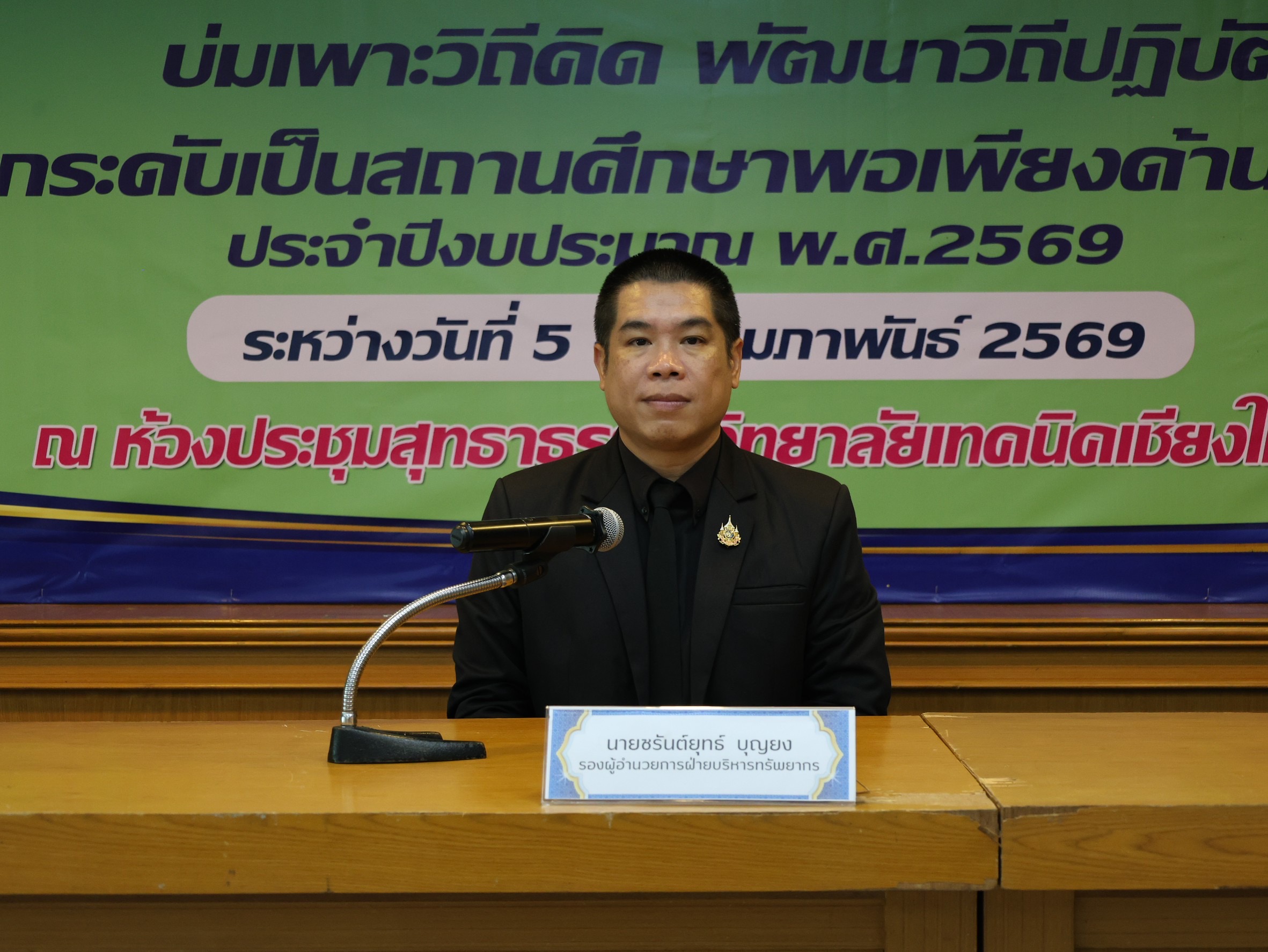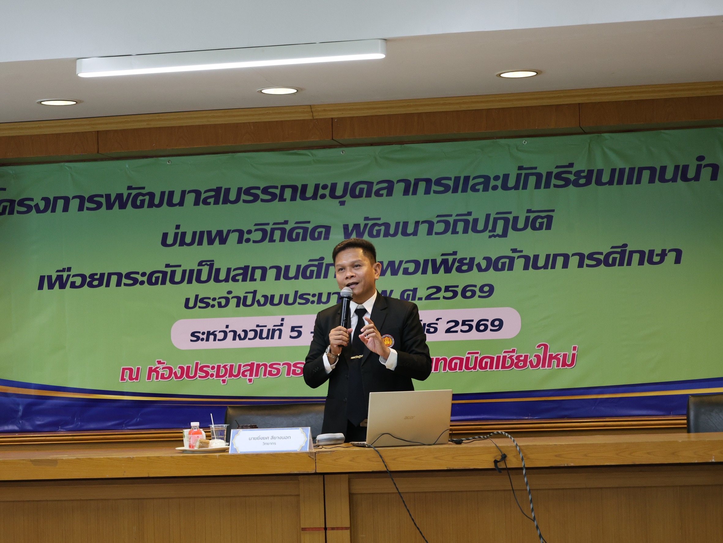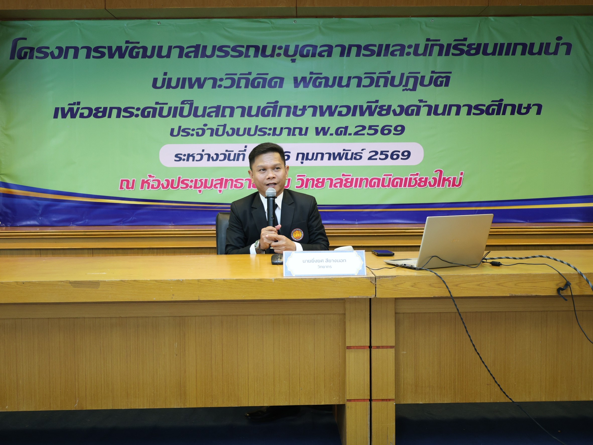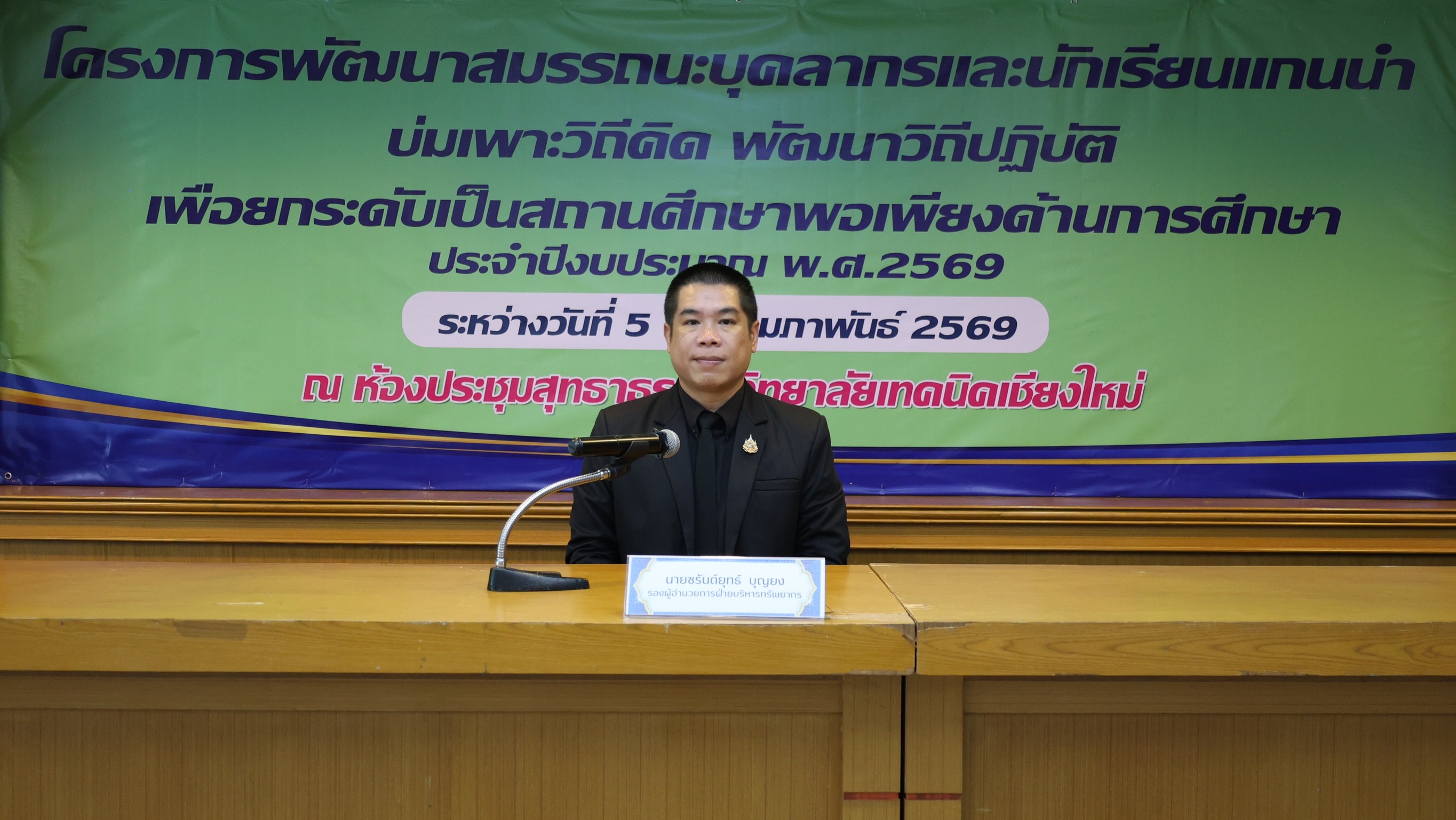 ดร.วัชรพงศ์ ฝั้นติ๊บ ผู้อำนวยการวิทยาลัยเทคนิคเชียงใหม่ ปฏิบัติหน้าที่ผู้อำนวยการสำนักงานอาชีวศึกษาจังหวัดเชียงใหม่ และรักษาการในตำแหน่งที่ปรึกษาด้านนโยบายและแผน สำนักงานคณะกรรมการการอาชีวศึกษามอบหมายให้ นายชรันต์ยุทธ์ บุญยง รองผู้อำนวยการฝ่ายบริหารทรัพยากร เป็นประธานในพิธีเปิด โครงการพัฒนาสมรรถนะบุคลากรและนักเรียนแกนนำ บ่มเพาะวิถีคิด พัฒนาวิถีปฏิบัติ เพื่อยกระดับเป็นสถานศึกษาพอเพียงด้านการศึกษา ประจำปีงบประมาณ 2569 ระหว่างวันที่ 5 - 6 กุมภาพันธ์ 2569 ณ ห้องประชุมสุทธาธรรม วิทยาลัยเทคนิคเชียงใหม่