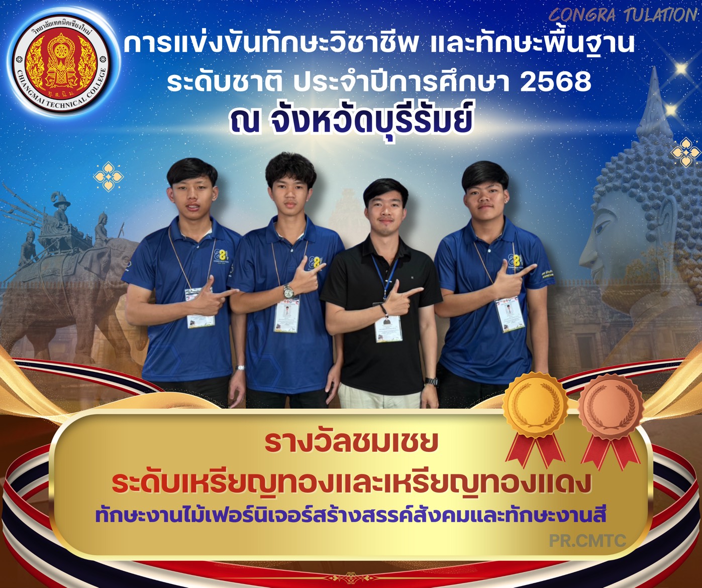 สุดยอดความภาคภูมิใจของพวกเรา วิทยาลัยเทคนิคเชียงใหม่ คว้าหรียญทอง และเหรียญทองแดง การแข่งขันทักษะวิชาชีพ และทักษะพื้นฐาน ระดับชาติ ประจำปีการศึกษา 2568