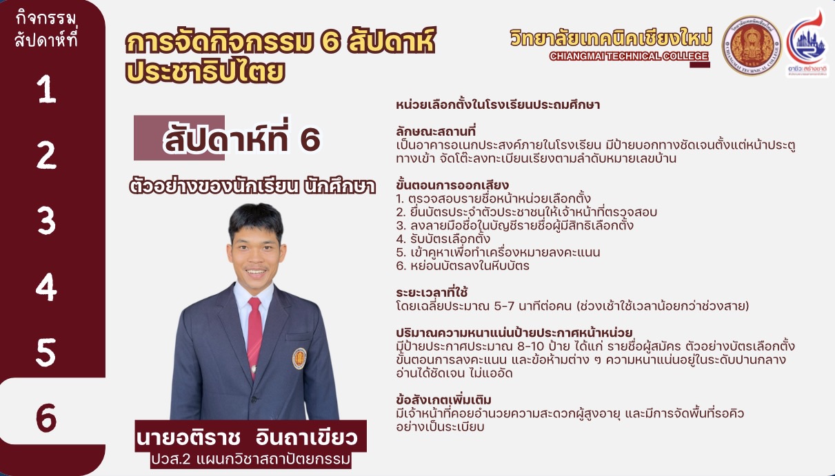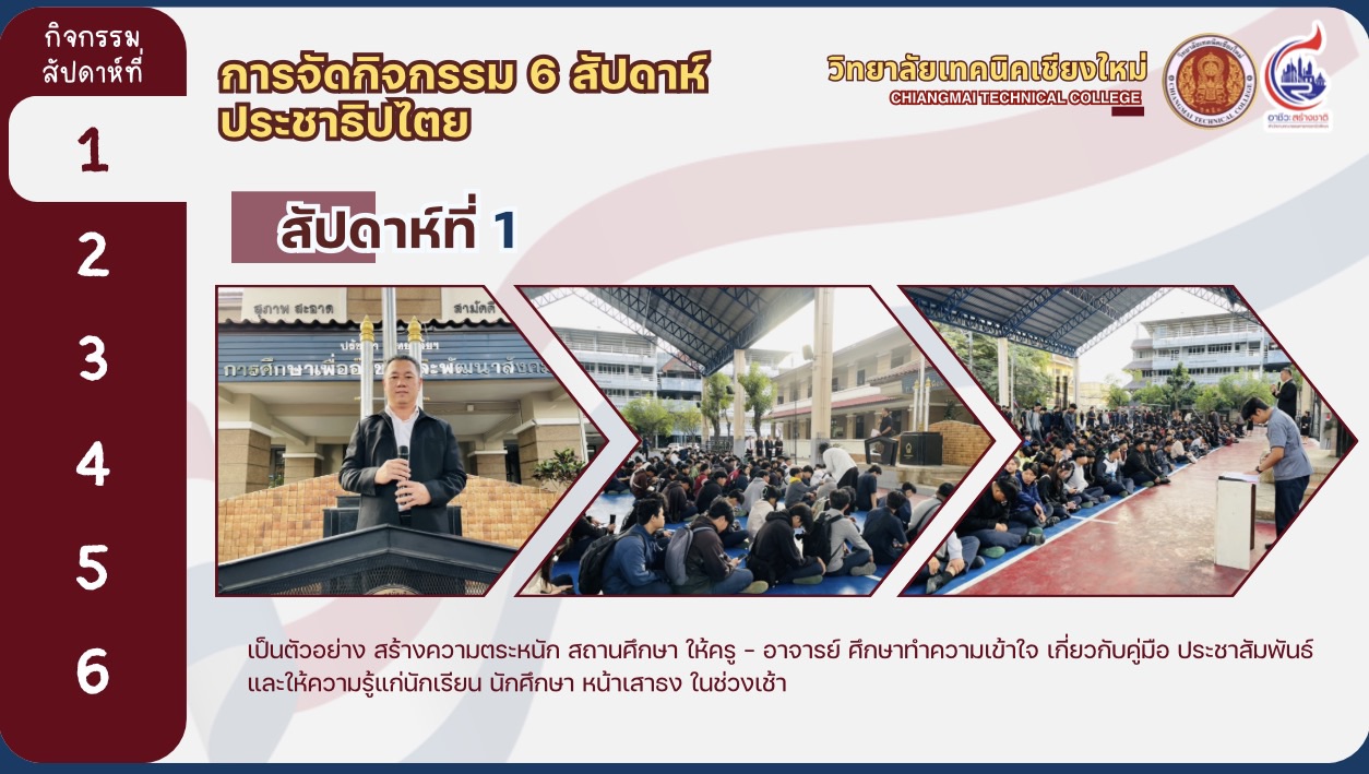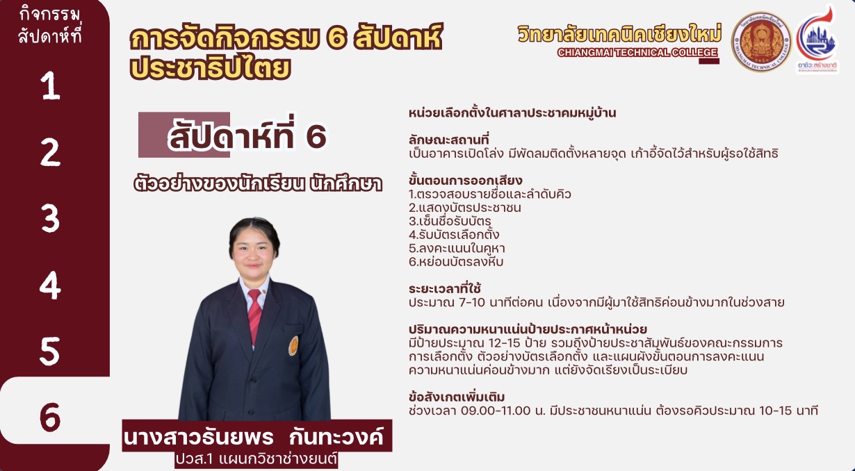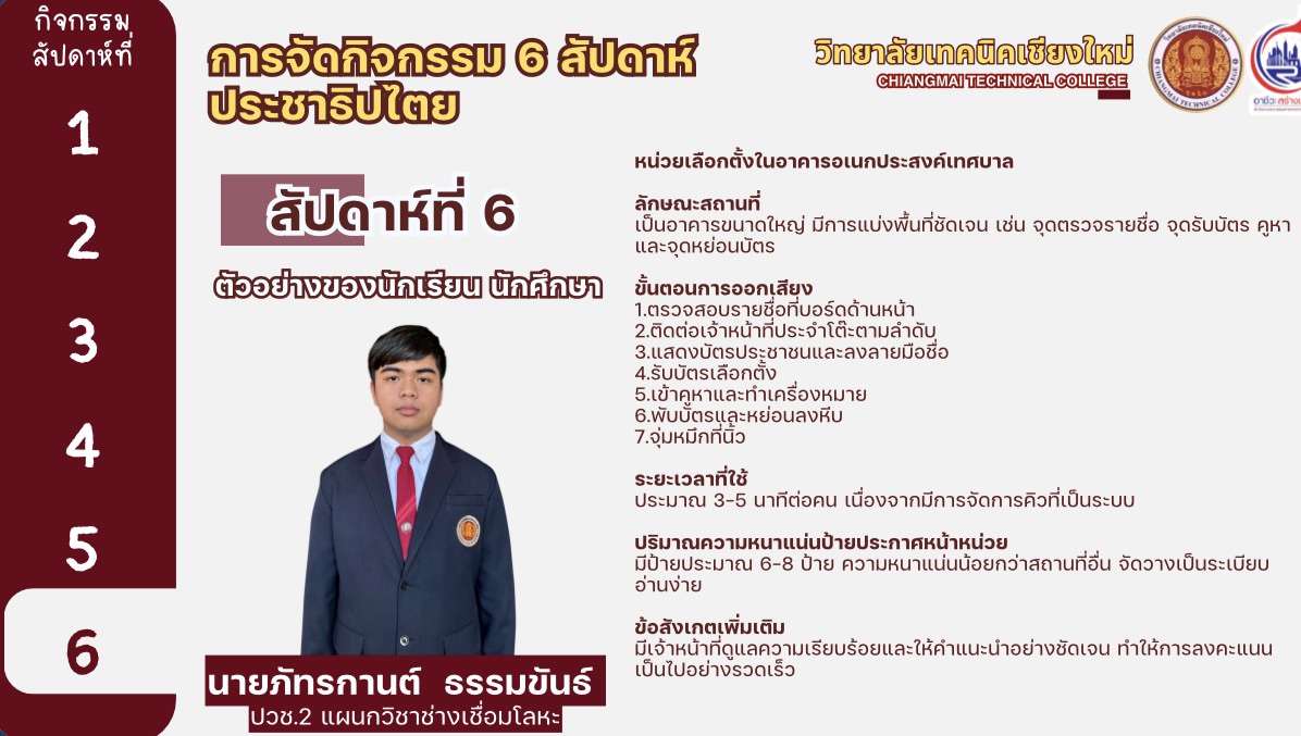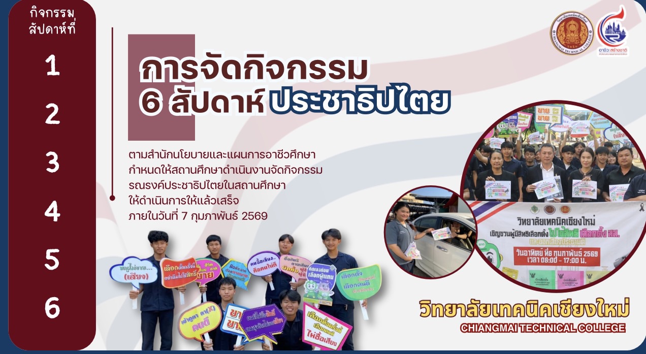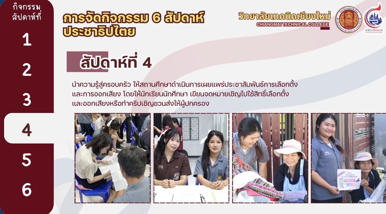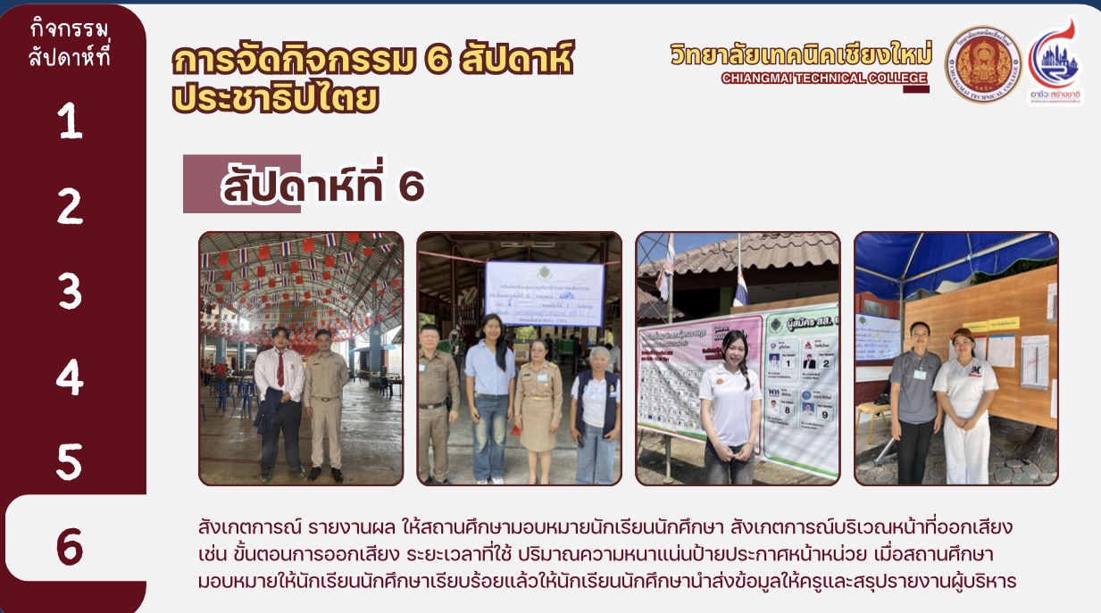 ทั้งนี้ได้มีการสรุปรายงานผลการดำเนินงานของวิทยาลัยเทคนิคเชียงใหม่ และสถานศึกษาสังกัดสำนักงานอาชีวศึกษาจังหวัดเชียงใหม่ ในการขับเคลื่อนกิจกรรมส่งเสริมการมีส่วนร่วม เผยแพร่ และประชาสัมพันธ์การเลือกตั้งสมาชิกสภาผู้แทนราษฎรและการออกเสียงประชามติ โดยวิทยาลัยเทคนิคเชียงใหม่ได้ดำเนินกิจกรรม 6 สัปดาห์ประชาธิปไตย ครบถ้วนทุกกิจกรรม เพื่อเปิดโอกาสให้นักเรียน ผู้ปกครอง ครู ผู้บริหาร และชุมชน มีส่วนร่วมในกระบวนการประชาธิปไตย ส่งเสริมให้นักเรียนเกิดทักษะชีวิตและซึมซับความเป็นประชาธิปไตย