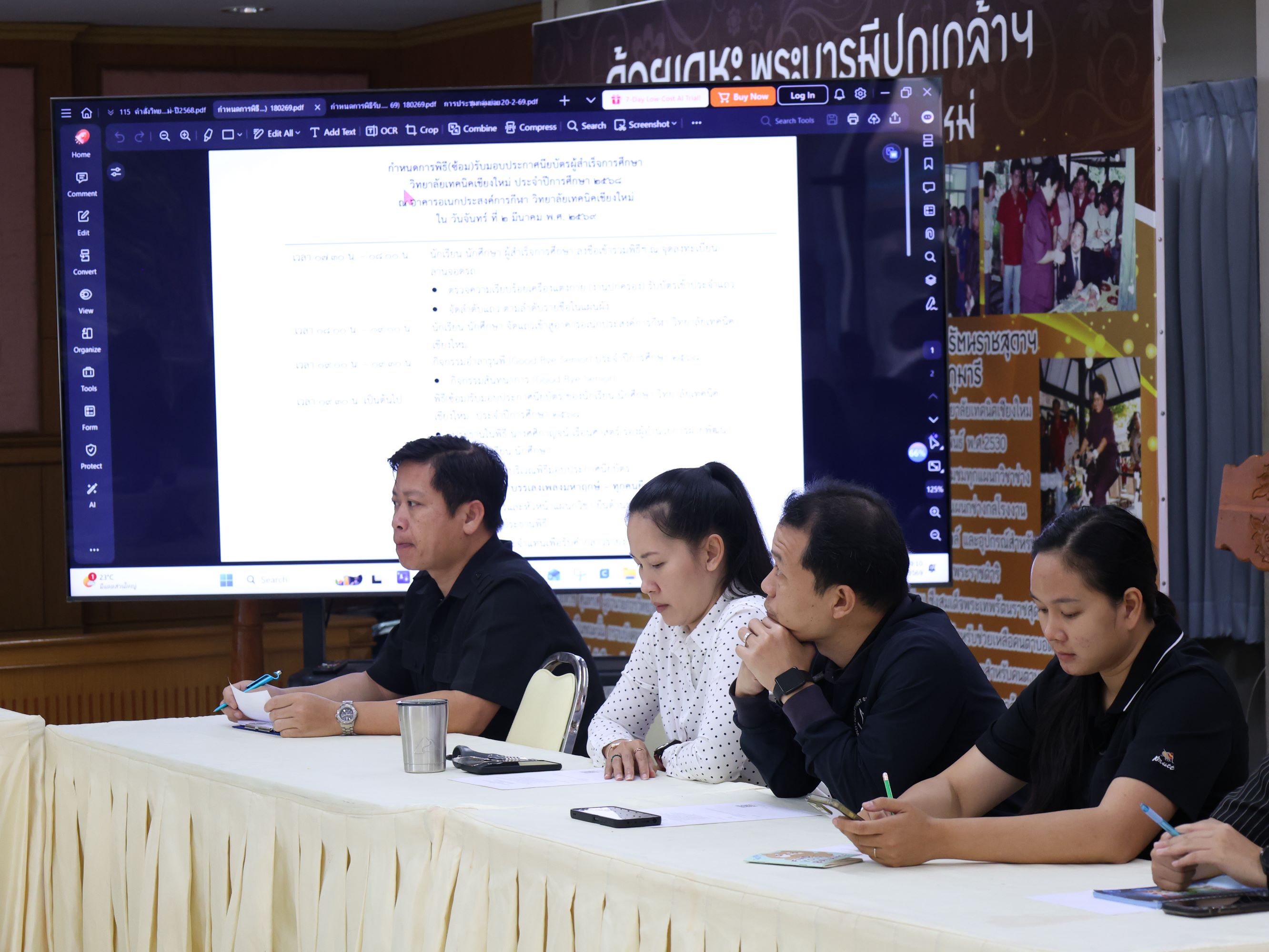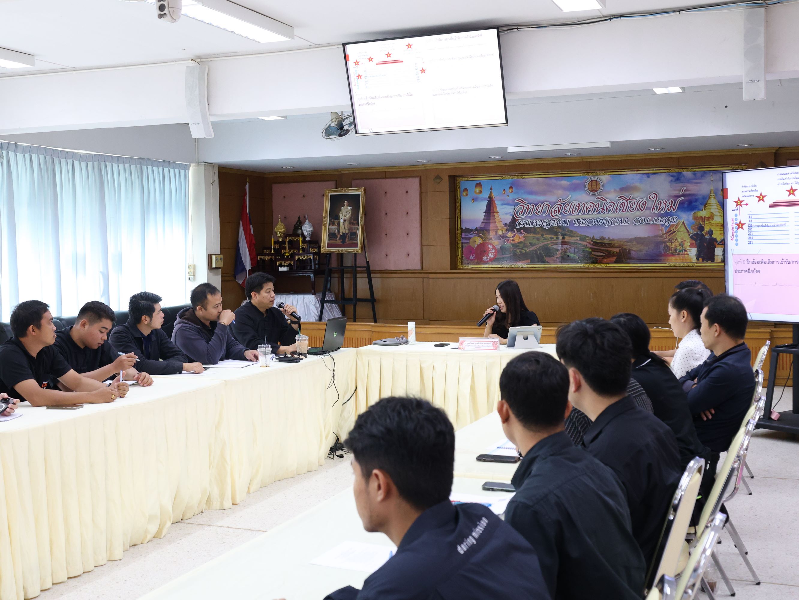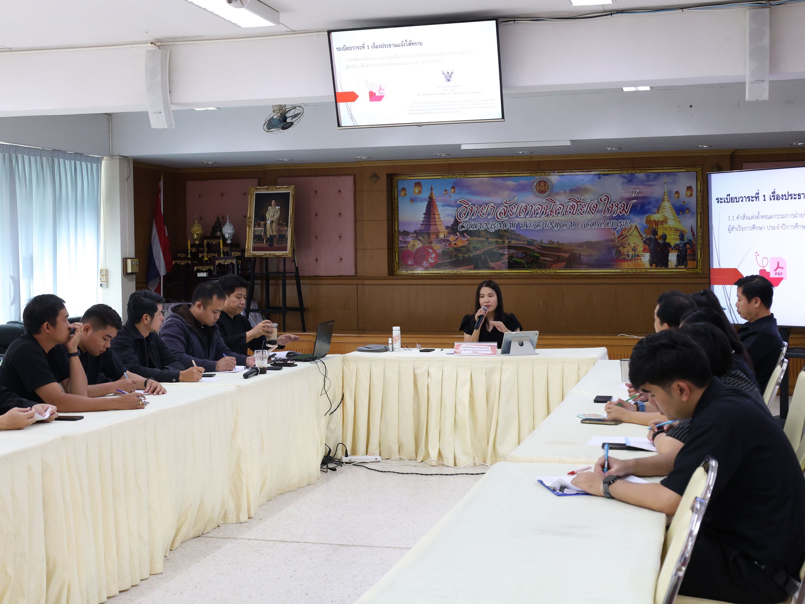 ดร.วัชรพงศ์ ฝั้นติ๊บ ผู้อำนวยการวิทยาลัยเทคนิคเชียงใหม่ ปฏิบัติหน้าที่ผู้อำนวยการสำนักงานอาชีวศึกษาจังหวัดเชียงใหม่ และรักษาการในตำแหน่งที่ปรึกษาด้านนโยบายและแผน สำนักงานคณะกรรมการการอาชีวศึกษา มอบหมาย นางศศิกาญจน์ เรือนศาสตร์ รองผู้อำนวยการฝ่ายพัฒนากิจการนักเรียนนักศึกษาเป็นประธานการประชุมคณะกรรมการฝ่ายพิธีการโครงการปัจฉิมนิเทศและพิธีรับมอบประกาศนียบัตรผู้สำเร็จการศึกษา ประจำปีการศึกษา 2568 พร้อมด้วย นายหงษ์คำ อินใจ หัวหน้างานแนะแนวอาชีพและการจัดหางาน และคณะกรรมการดำเนินงานฯ เข้าร่วมประชุมอย่างพร้อมเพรียง ณ ห้องประชุมสุทธาธรรม วิทยาลัยเทคนิคเชียงใหม่