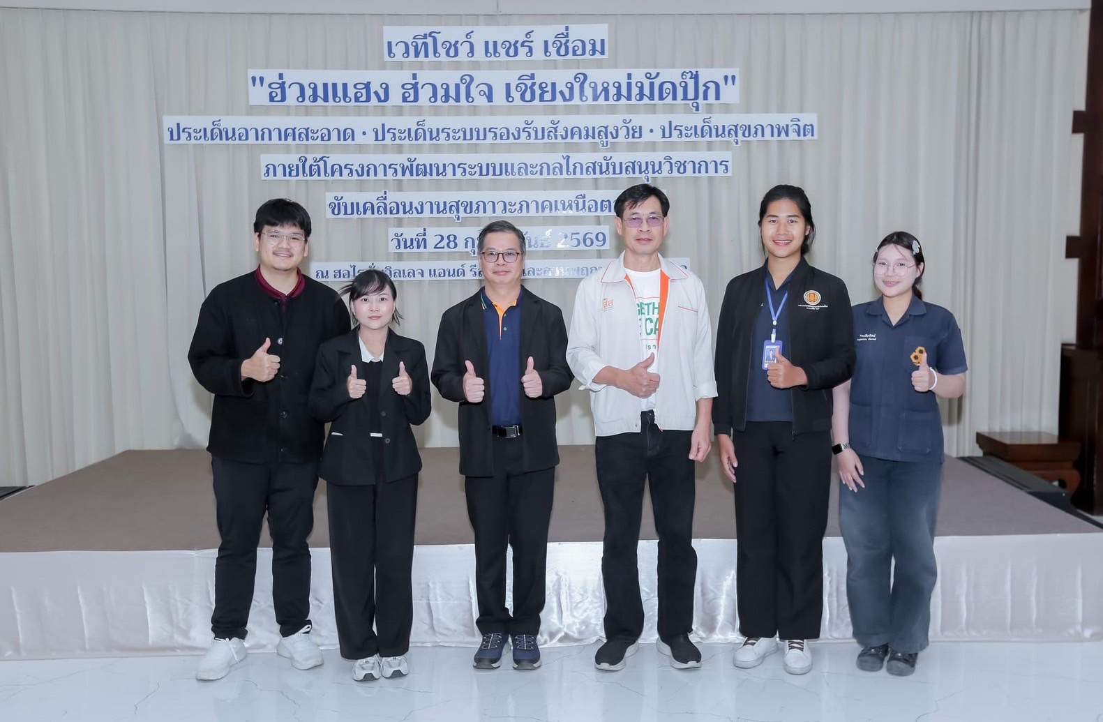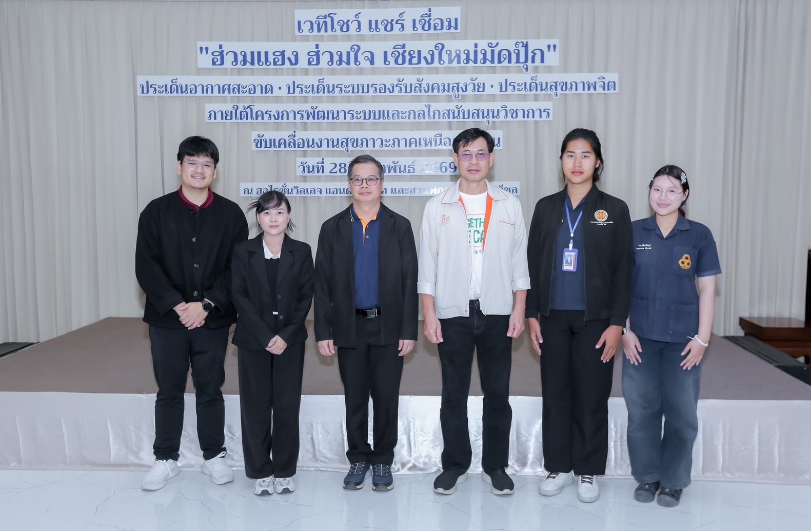 โดยมีวัตถุประสงค์เพื่อยกระดับระบบสนับสนุนวิชาการและพัฒนาศักยภาพเครือข่ายในการเชื่อมโยงยุทธศาสตร์สุขภาวะระดับจังหวัด ระดับภูมิภาค และพัฒนากลไก โดยกำหนดจัดเวทีโชว์ แชร์ เชื่อม : ฮ่วมแฮง ฮ่วมใจ ประเด็นอากาศสะอาด ประเด็นระบบรองรับสังคมสูงวัย และประเด็นสุขภาพจิต ณ ห้องประชุมฮอไรซั่น วิลเลจ รีสอร์ท สวนพฤกษศาสตร์ทวีชล อำเภอดอยสะเก็ด จังหวัดเชียงใหม่