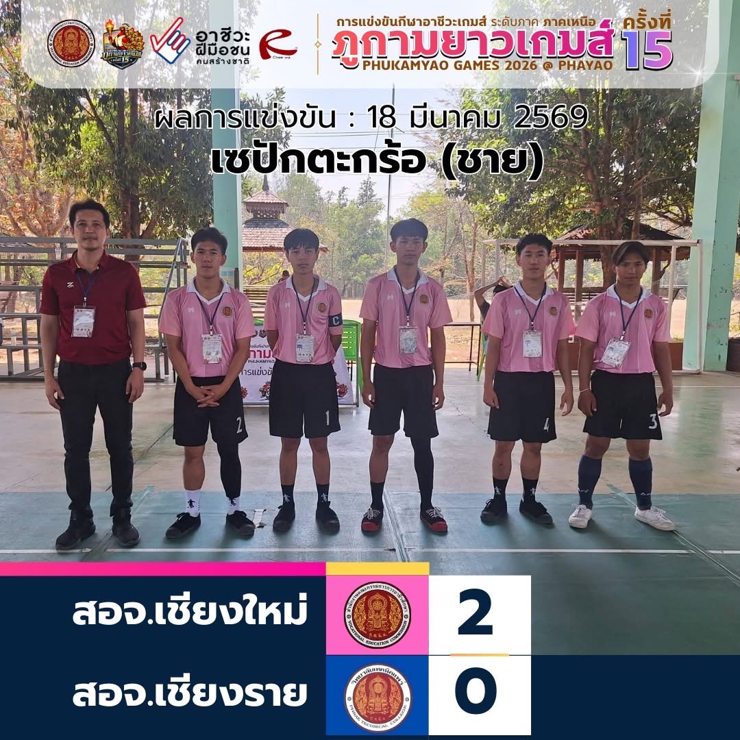ด้วยผลงานสุดยอด เอาชนะ สอจ.เชียงราย 2-0 เซต ในการแข่งขันกีฬาอาชีวะเกมส์ “ภูกามยาวเกมส์” ครั้งที่ 15