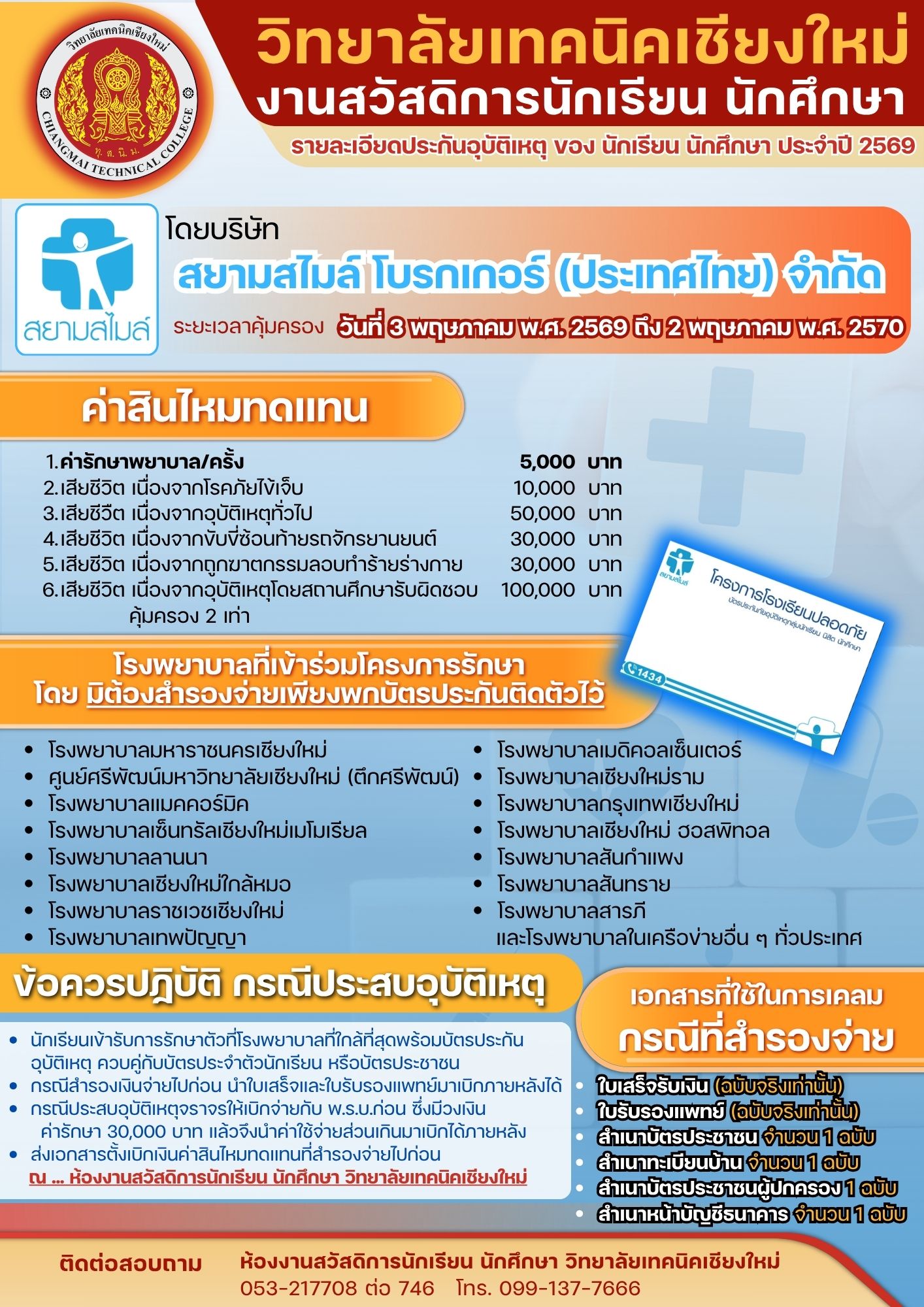 วิทยาลัยเทคนิคเชียงใหม่ ขอประชาสัมพันธ์ประกันอุบัติเหตุ สำหรับนักเรียนนักศึกษาใหม่ ปีการศึกษา 2569