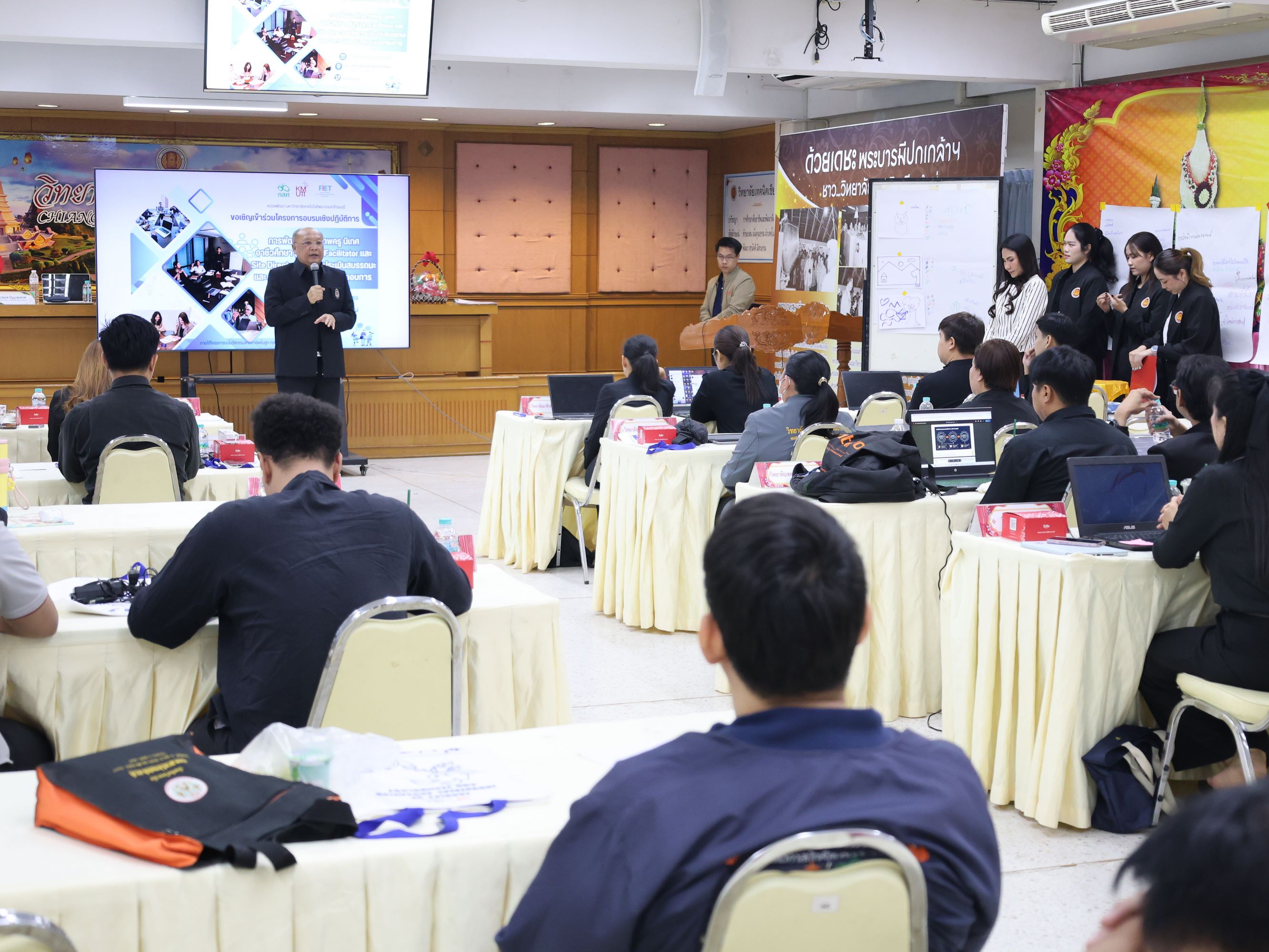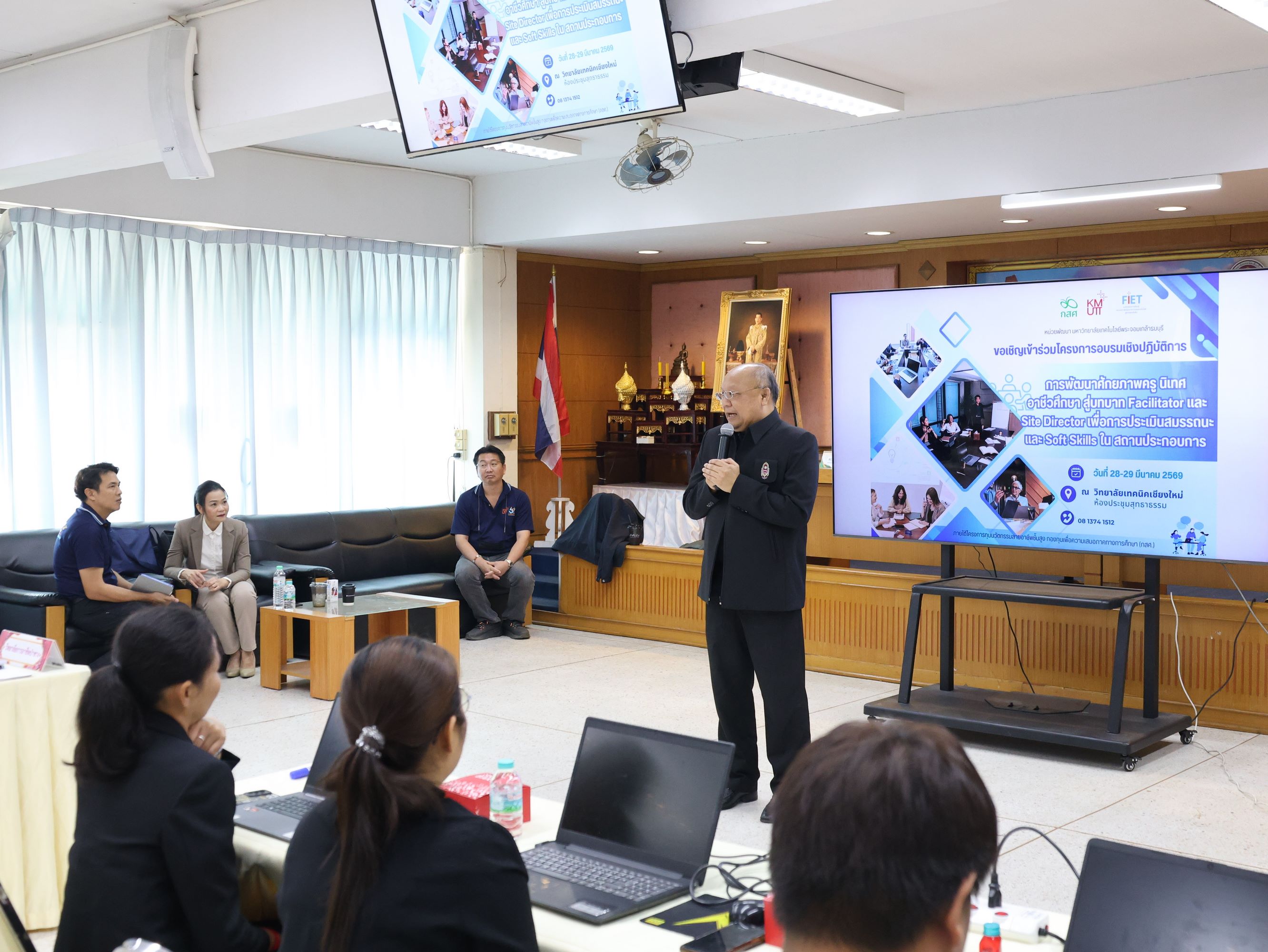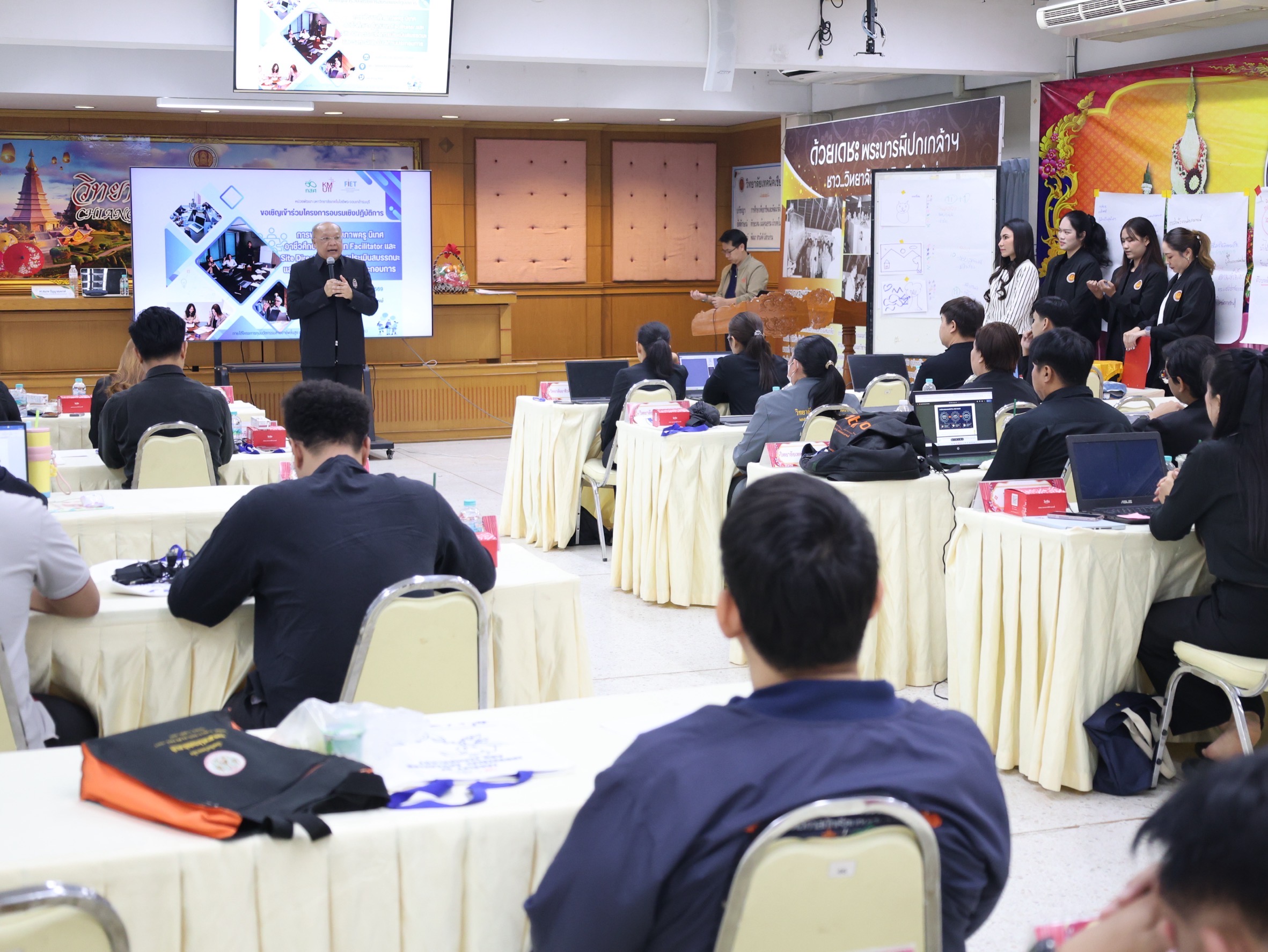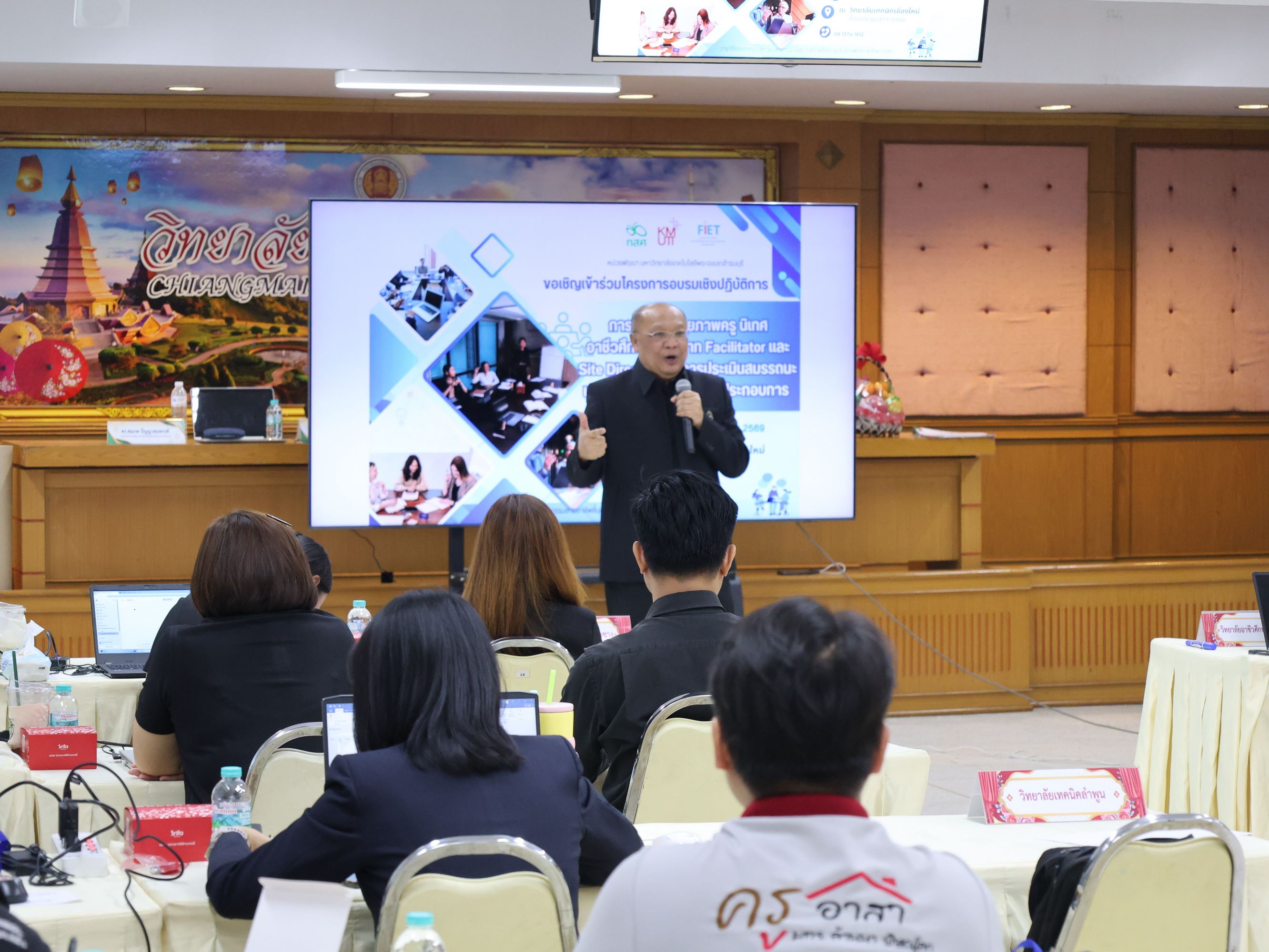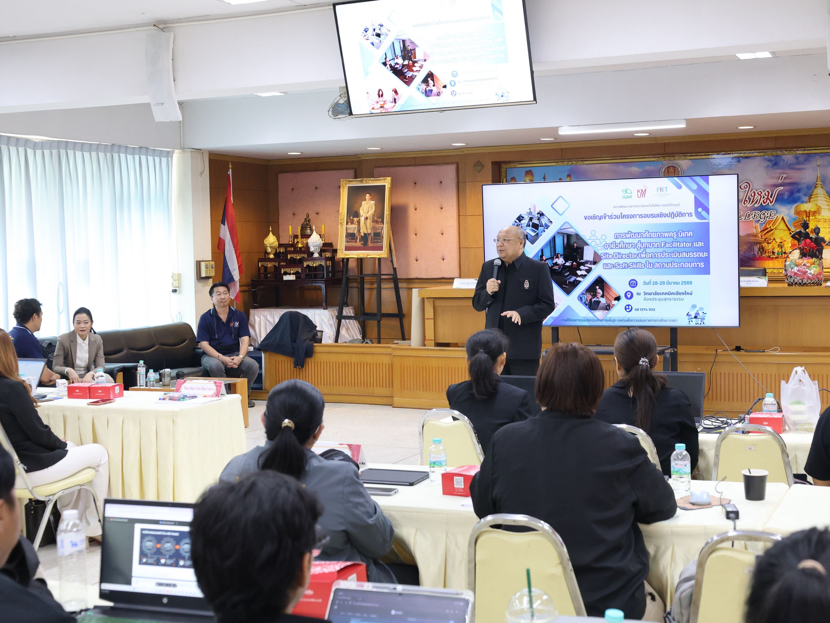 นางสาวปรียานุช คำเย็น ผู้ประสานงานโครงการ พร้อมคณะครูจากสถานศึกษาที่ได้รับทุนนวัตกรรมสายอาชีพชั้นสูง 12 แห่งในภาคเหนือ เข้าร่วมอบรม โดยได้รับเกียรติจาก ดร.สมภพ ปัญญาสมพรรค์ กล่าวต้อนรับ และคณะวิทยากรจากมหาวิทยาลัยเทคโนโลยีพระจอมเกล้าธนบุรีร่วมถ่ายทอดความรู้ตลอด 2 วัน