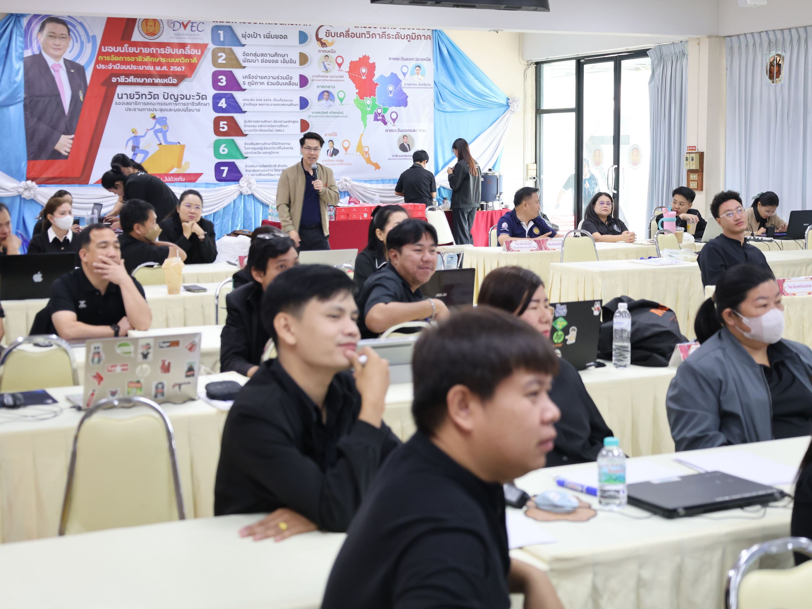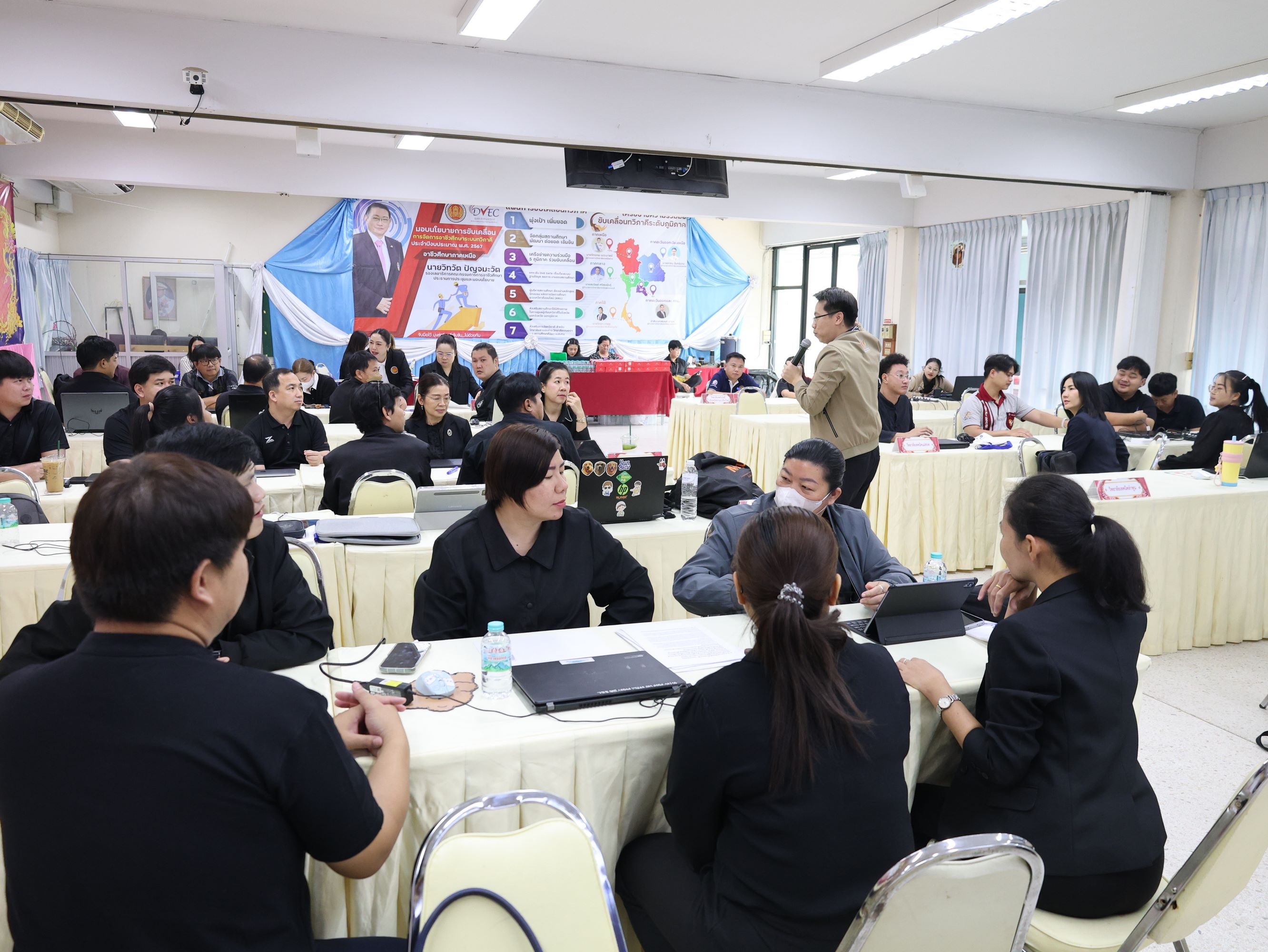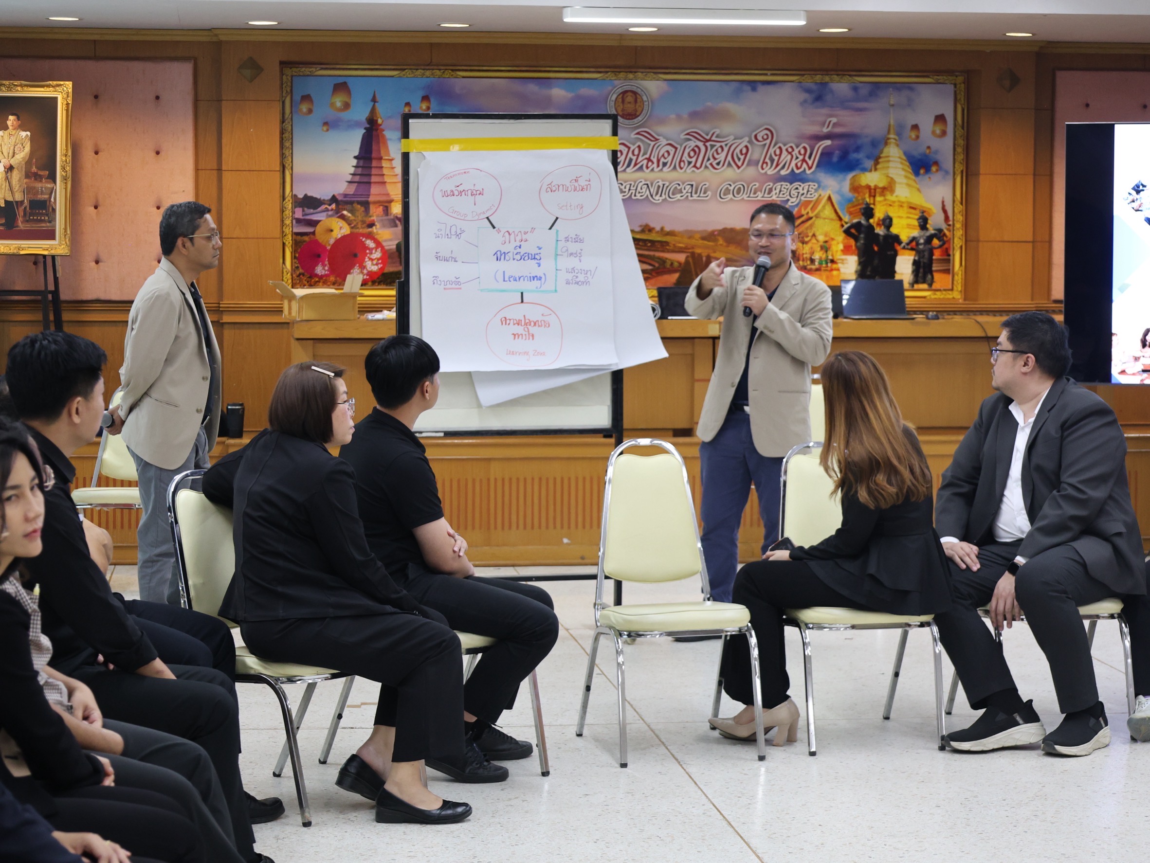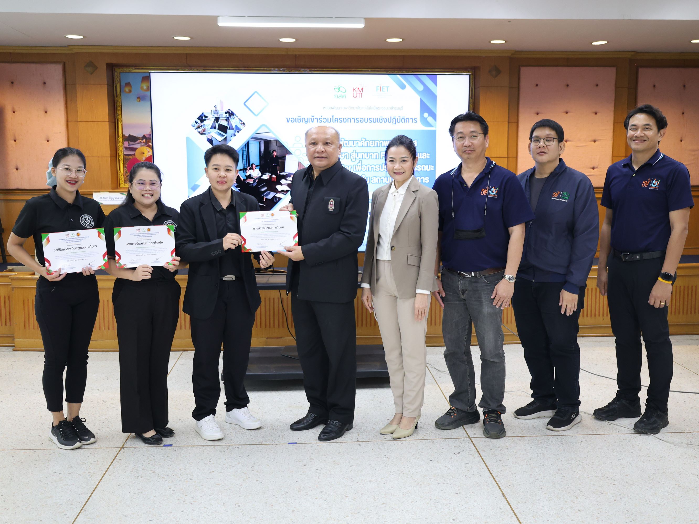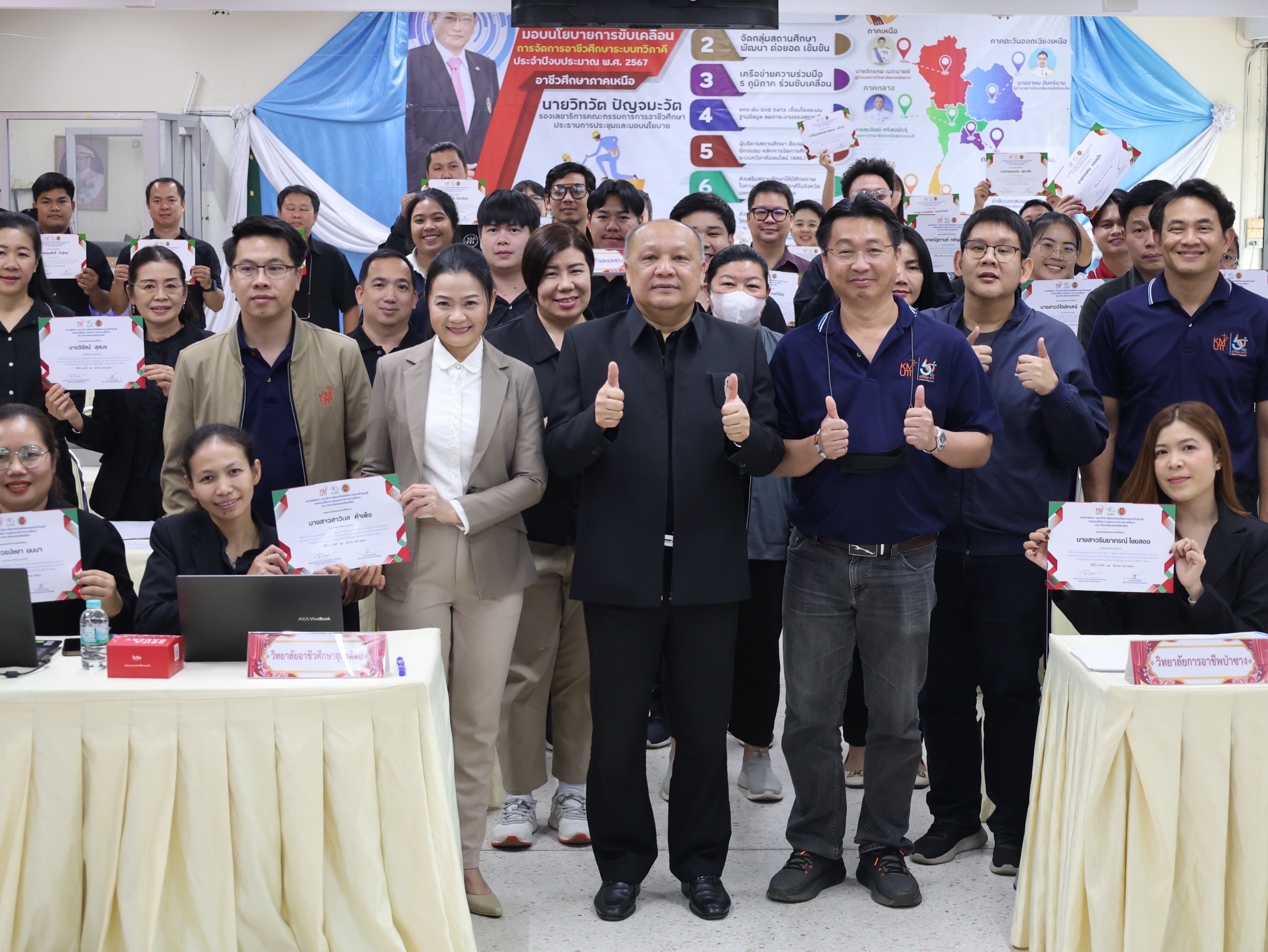 นางสาวปรียานุช คำเย็น ผู้ประสานงานโครงการ พร้อมคณะครูจากสถานศึกษาที่ได้รับทุนนวัตกรรมสายอาชีพชั้นสูง 12 แห่งในภาคเหนือ เข้าร่วมอบรม โดยได้รับเกียรติจาก ดร.สมภพ ปัญญาสมพรรค์ กล่าวต้อนรับ และคณะวิทยากรจากมหาวิทยาลัยเทคโนโลยีพระจอมเกล้าธนบุรีร่วมถ่ายทอดความรู้ตลอด 2 วัน