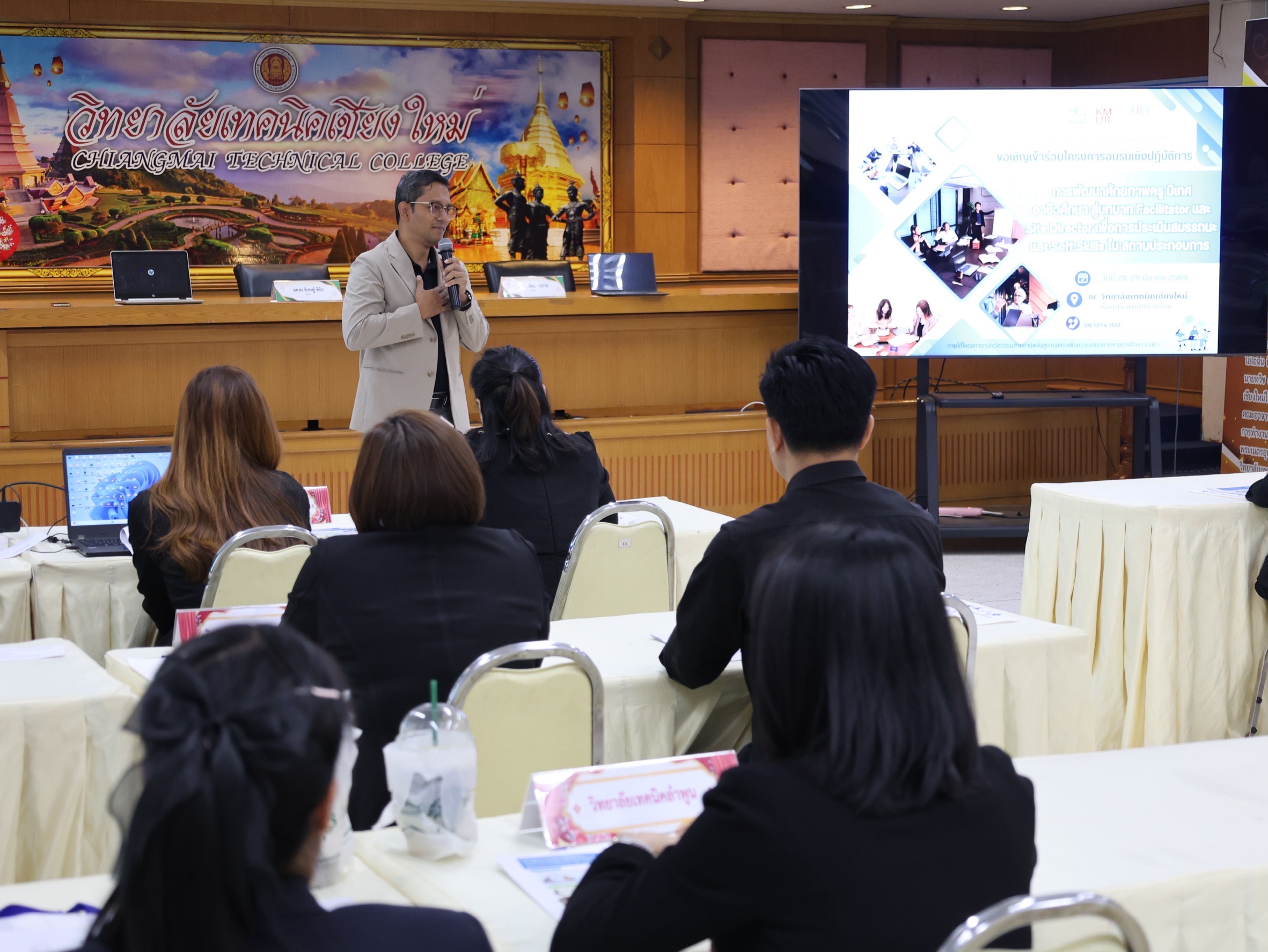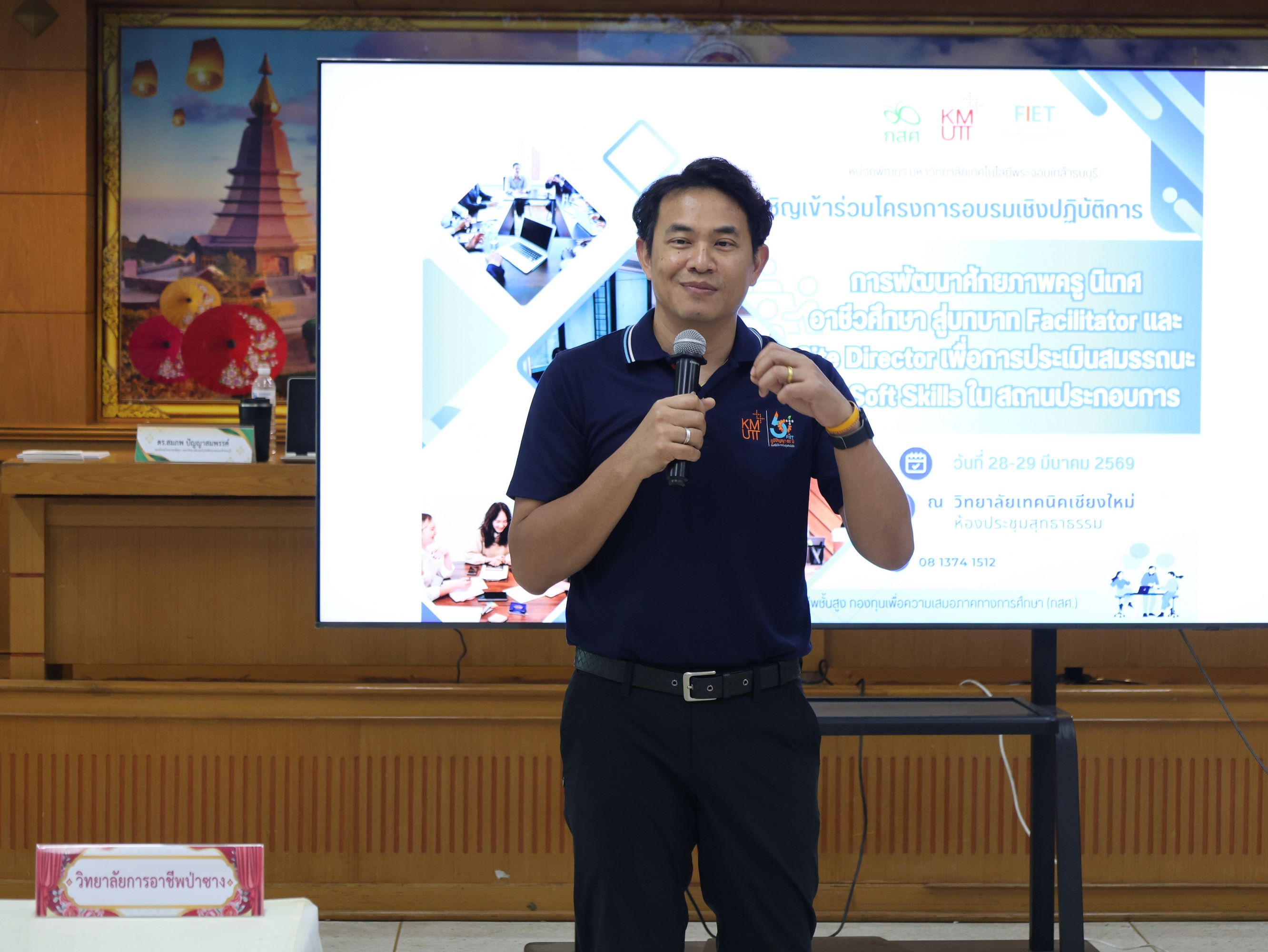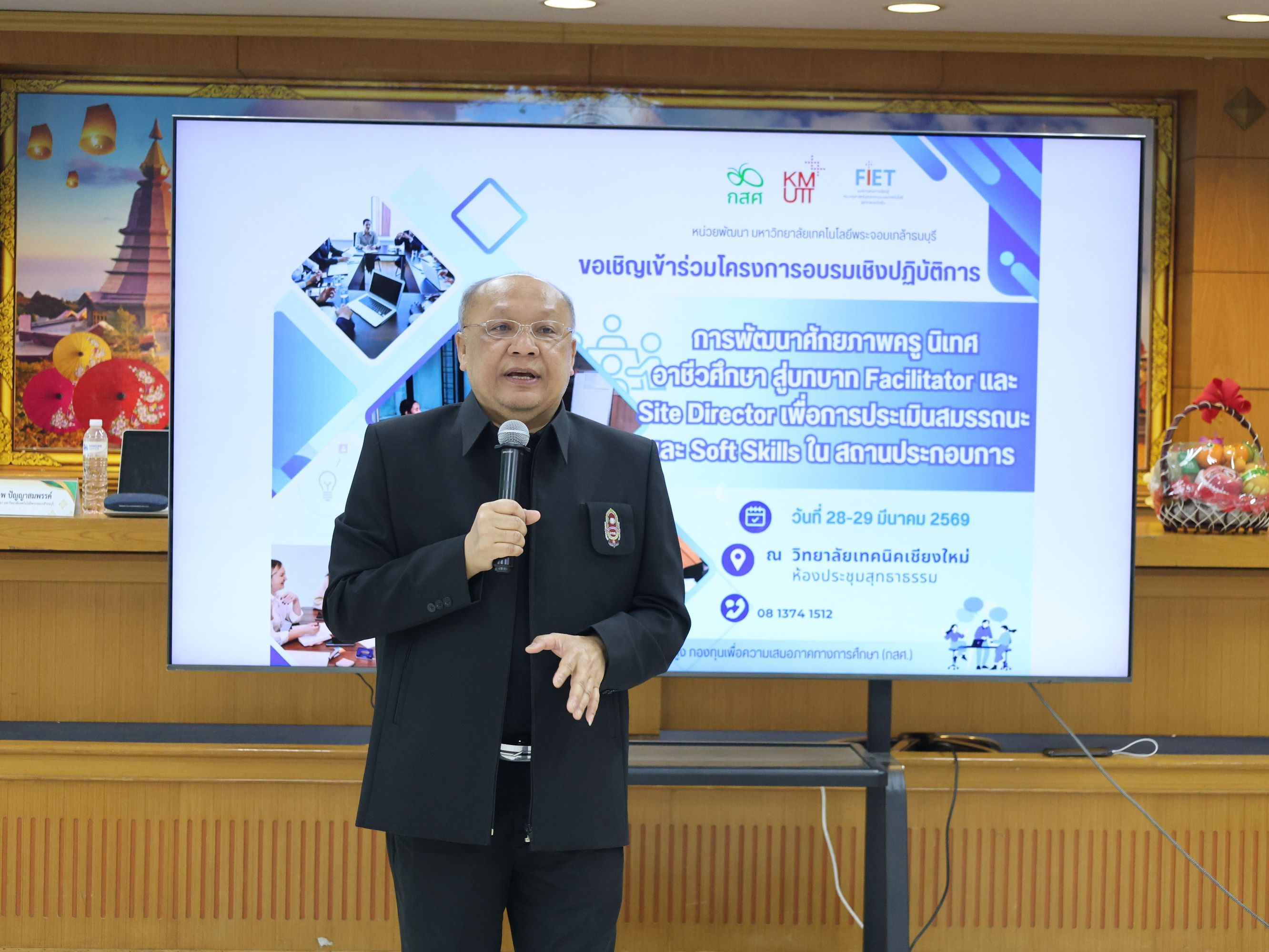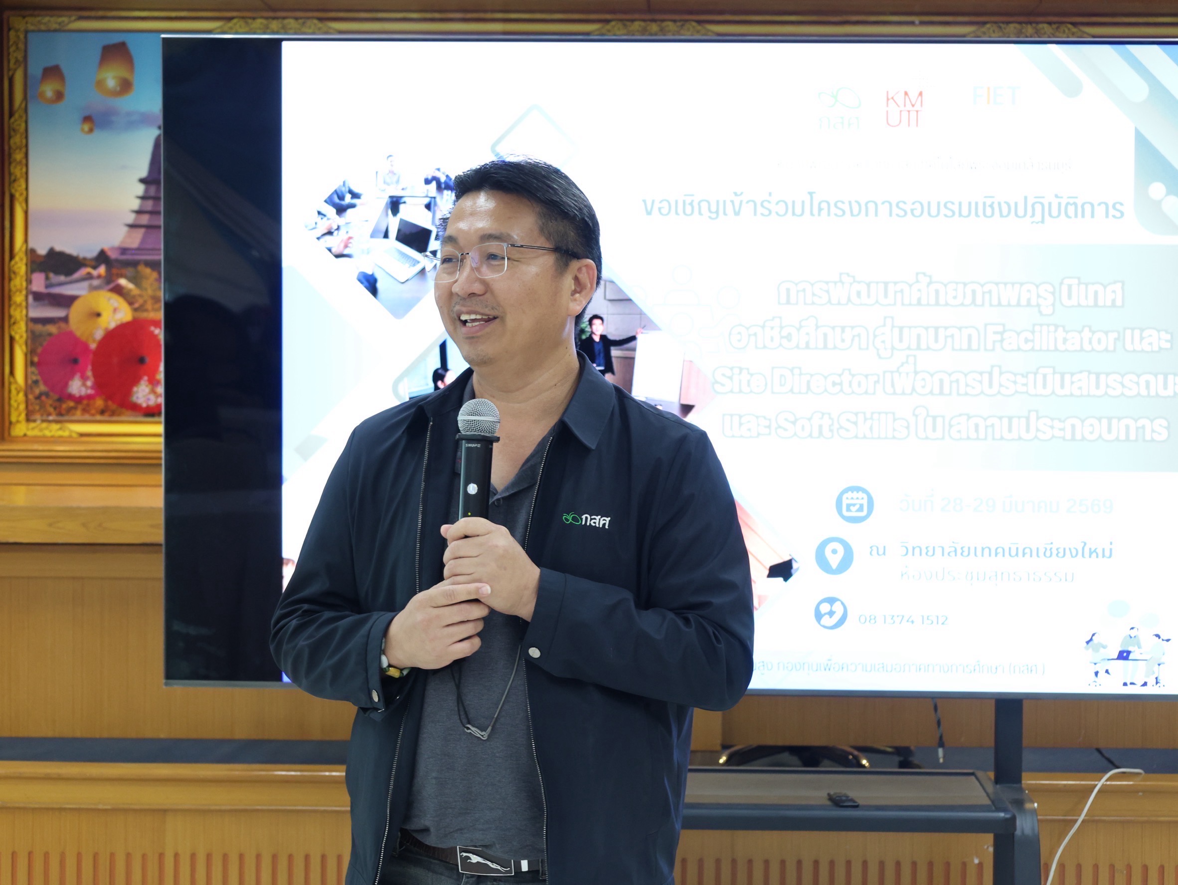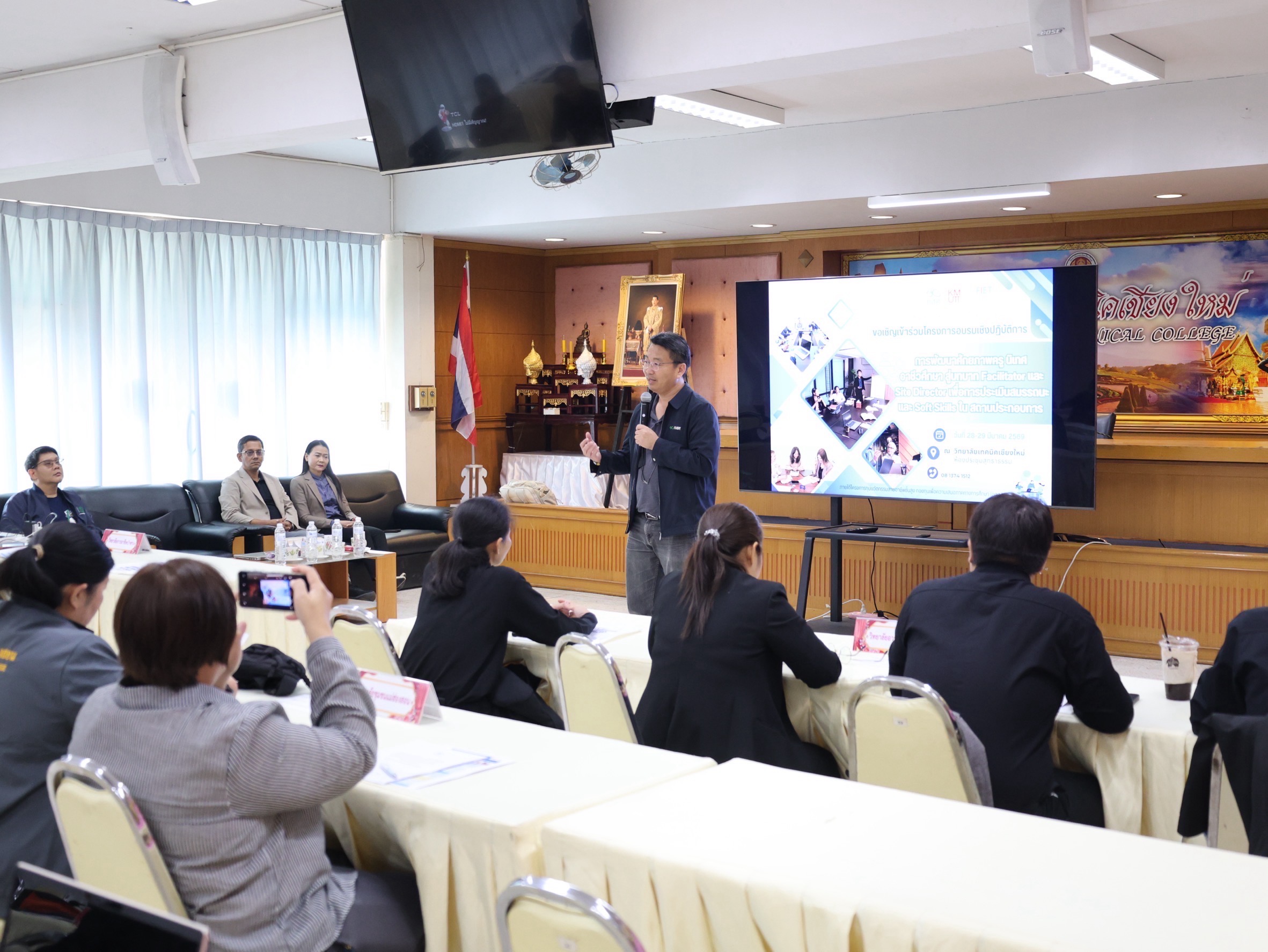 ดร.วัชรพงศ์ ฝั้นติ๊บ ผู้อำนวยการวิทยาลัยเทคนิคเชียงใหม่ ปฏิบัติหน้าที่ผู้อำนวยการสำนักงานอาชีวศึกษาจังหวัดเชียงใหม่ และรักษาการในตำแหน่งที่ปรึกษาด้านนโยบายและแผน สำนักงานคณะกรรมการการอาชีวศึกษา เป็นประธานในพิธีเปิดโครงการอบรมเชิงปฏิบัติการการพัฒนาศักยภาพครูนิเทศอาชีวศึกษา สู่บทบาท Facilitator และ Site Director เพื่อการประเมินสมรรถนะและ Soft Skills ในสถานประกอบการ ภายใต้โครงการทุนนวัตกรรมสายอาชีพชั้นสูง กองทุนเพื่อความเสมอภาคทางการศึกษา (กสศ.) ระหว่างวันที่ 28-29 มีนาคม 2569 ณ ห้องประชุมสุทธาธรรม วิทยาลัยเทคนิคเชียงใหม่