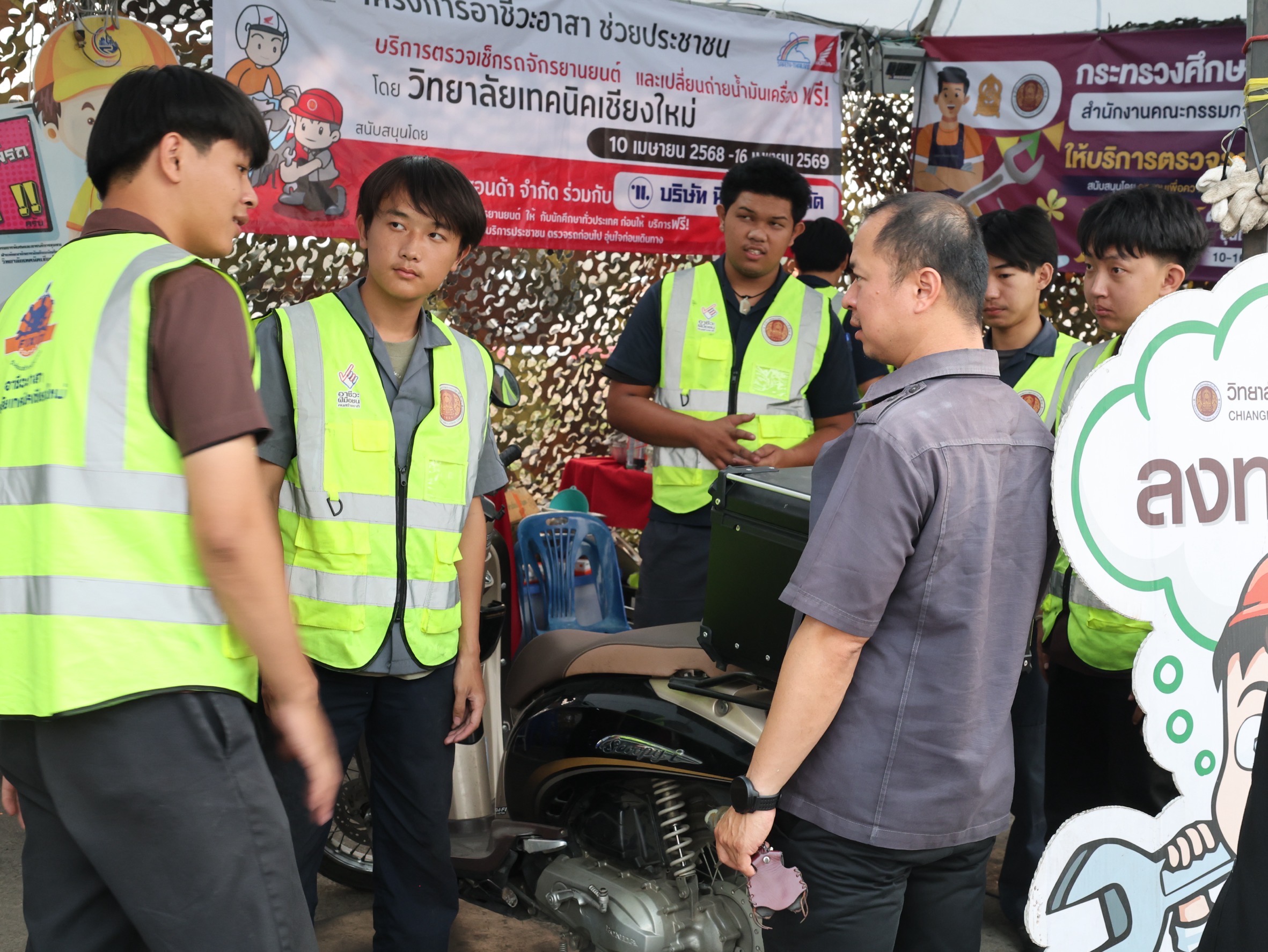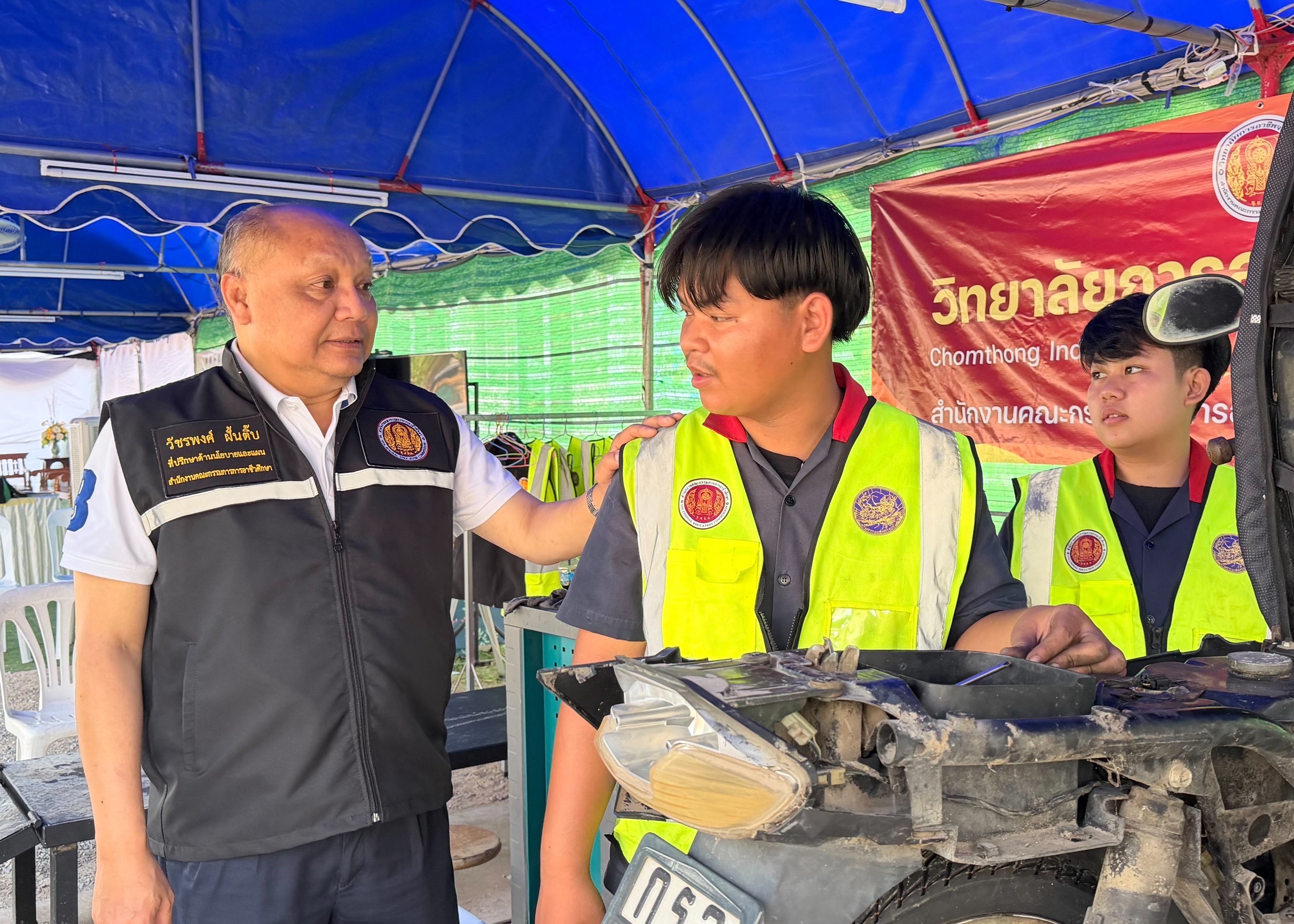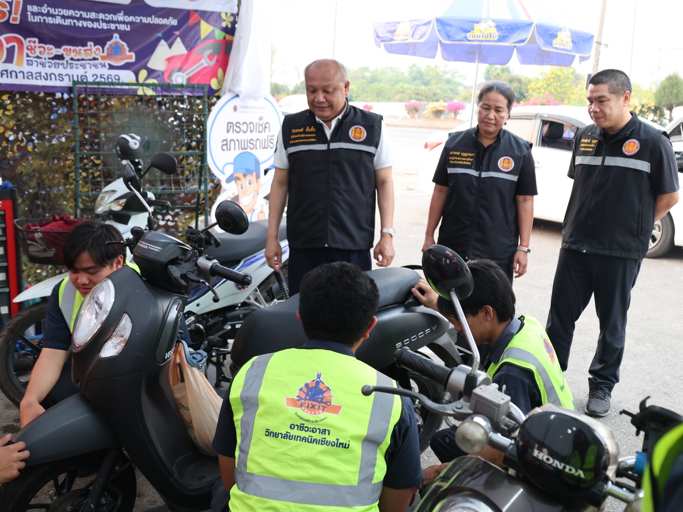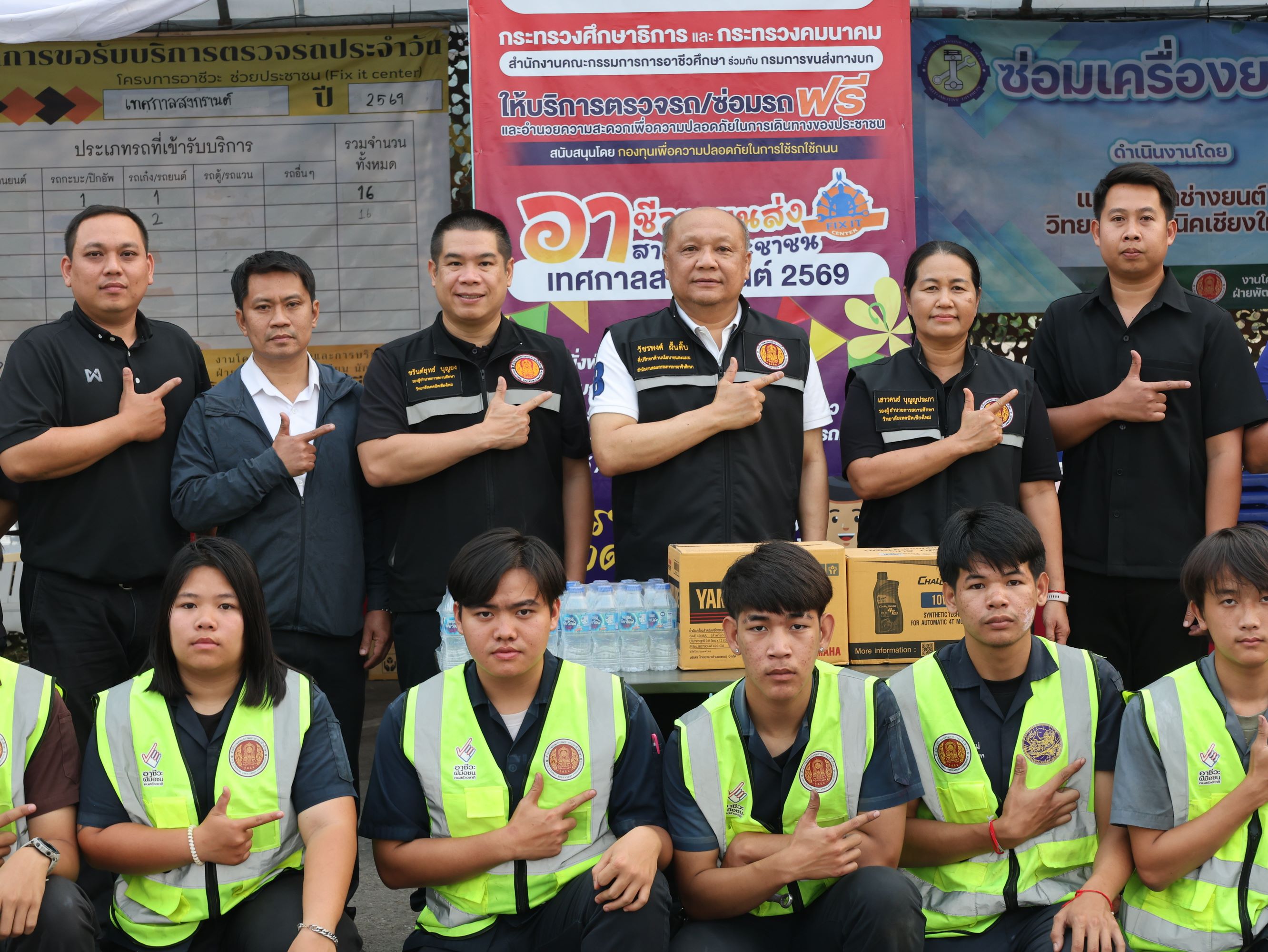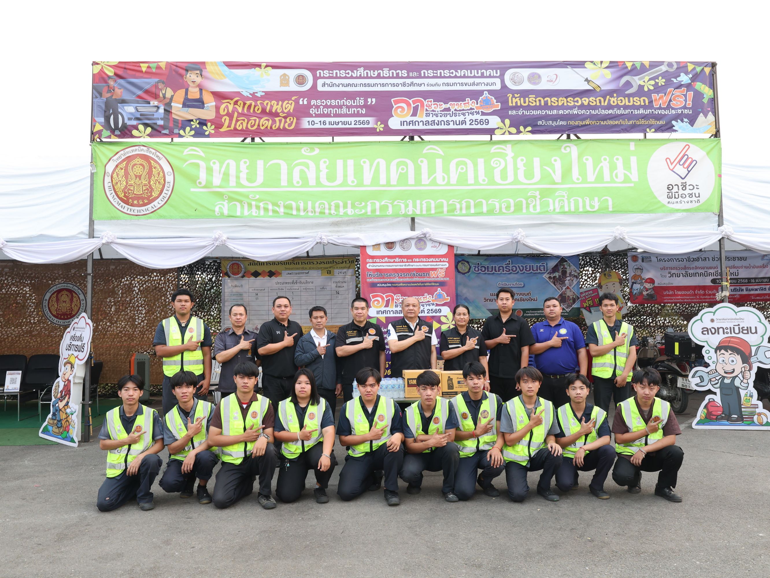 นายยศพล เวณุโกเศศ เลขาธิการคณะกรรมการการอาชีวศึกษา มอบหมายให้ ดร.วัชรพงศ์ ฝั้นติ๊บ ผู้อำนวยการวิทยาลัยเทคนิคเชียงใหม่ ปฏิบัติหน้าที่ผู้อำนวยการสำนักงานอาชีวศึกษาจังหวัดเชียงใหม่ และรักษาการในตำแหน่งที่ปรึกษาด้านนโยบายและแผน สำนักงานคณะกรรมการการอาชีวศึกษา ลงพื้นที่ตรวจเยี่ยมและให้กำลังใจ “ศูนย์อาชีวะ-ขนส่ง อาสาช่วยประชาชน” เทศกาลสงกรานต์ 2569 ในเขตพื้นที่ จังหวัดเชียงใหม่ และจังหวัดลำพูนพร้อมน้ำดื่มและน้ำมันหล่อลื่นเครื่องยนต์ เพื่อเป็นการสนับสนุนและให้กำลังใจแก่คณะผู้บริหาร คณะครู บุคลากร และนักเรียน นักศึกษา ที่ปฏิบัติหน้าที่ด้วยความมุ่งมั่น โดยมีการลงพื้นที่ ใน 4 จุดบริการ ดังนี้