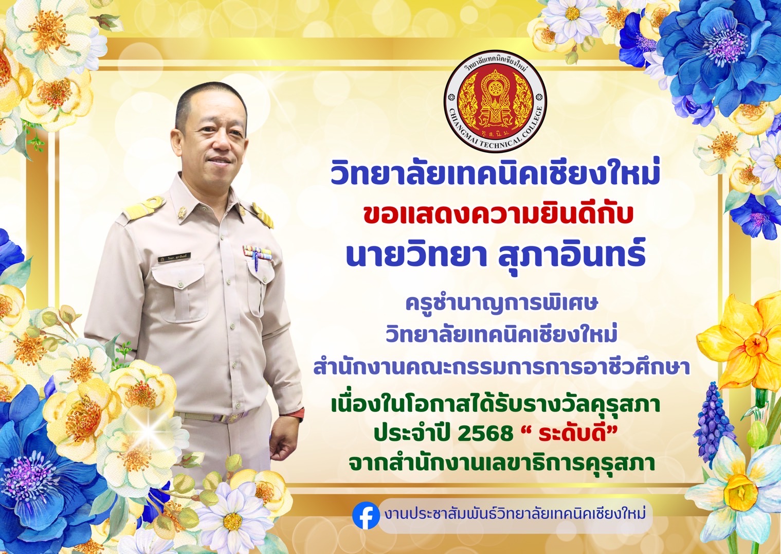 ดร.วัชรพงศ์ ฝั้นติ๊บ ผู้อำนวยการวิทยาลัยเทคนิคเชียงใหม่ ปฏิบัติหน้าที่ผู้อำนวยการสำนักงานอาชีวศึกษาจังหวัดเชียงใหม่ และรักษาการในตำแหน่งที่ปรึกษาด้านนโยบายและแผน สำนักงานคณะกรรมการการอาชีวศึกษา มอบหมายให้ แผนกวิช...อ่านต่อ